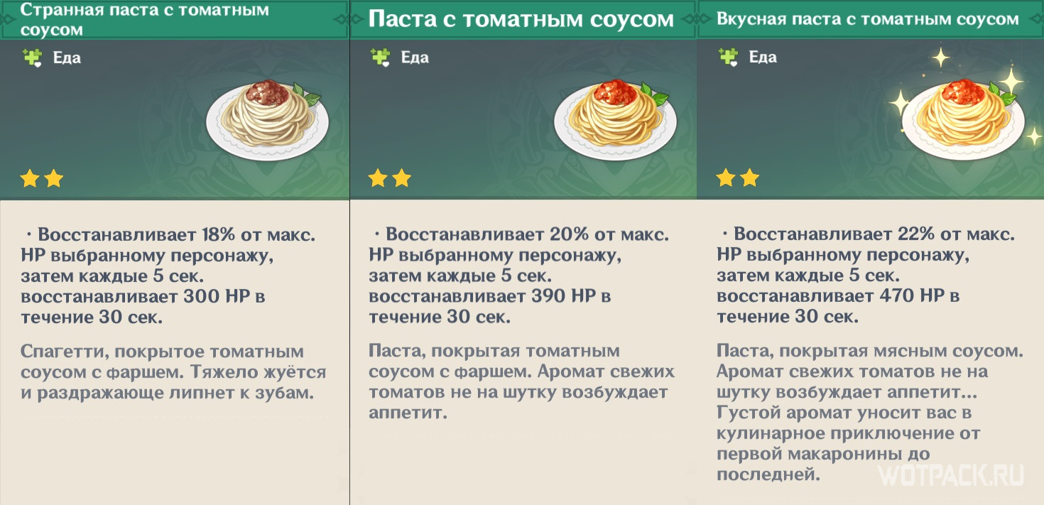 Паста с томатным соусом в Genshin Impact – это блюдо Мондштадта редкостью 2⭐️, восстанавливающее здоровье на 18-22% +300-470 HP каждые 5 сек. в течение 30 сек. Эффект в кооперативе работает лишь на применившего игрока. Спагетти существует в 4 видах, включая особый, за авторством Лизы.