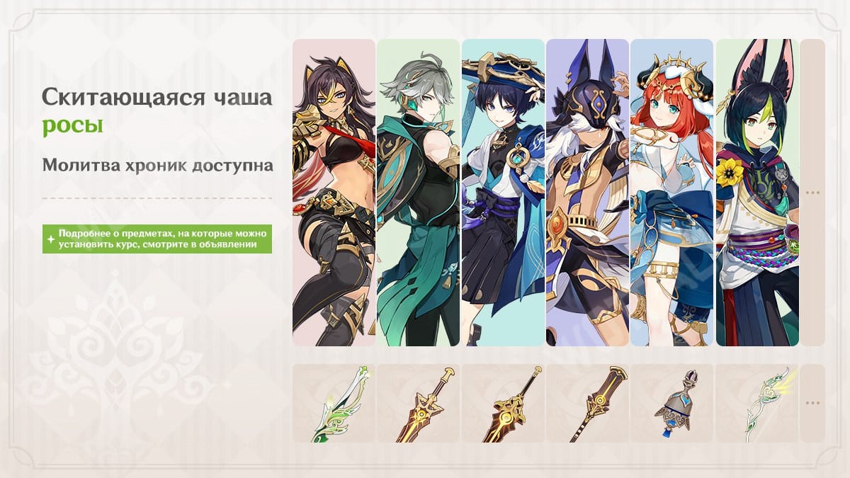 Вместе с 5⭐ Нефер (Дендро, катализатор) в одной части окажется Фурина (Гидро, одноручное). Повысят шанс на выпадение следующих 4⭐ героев: