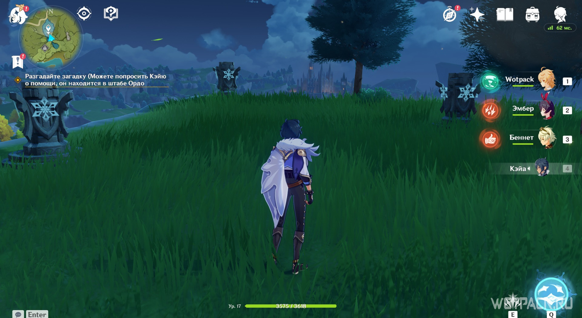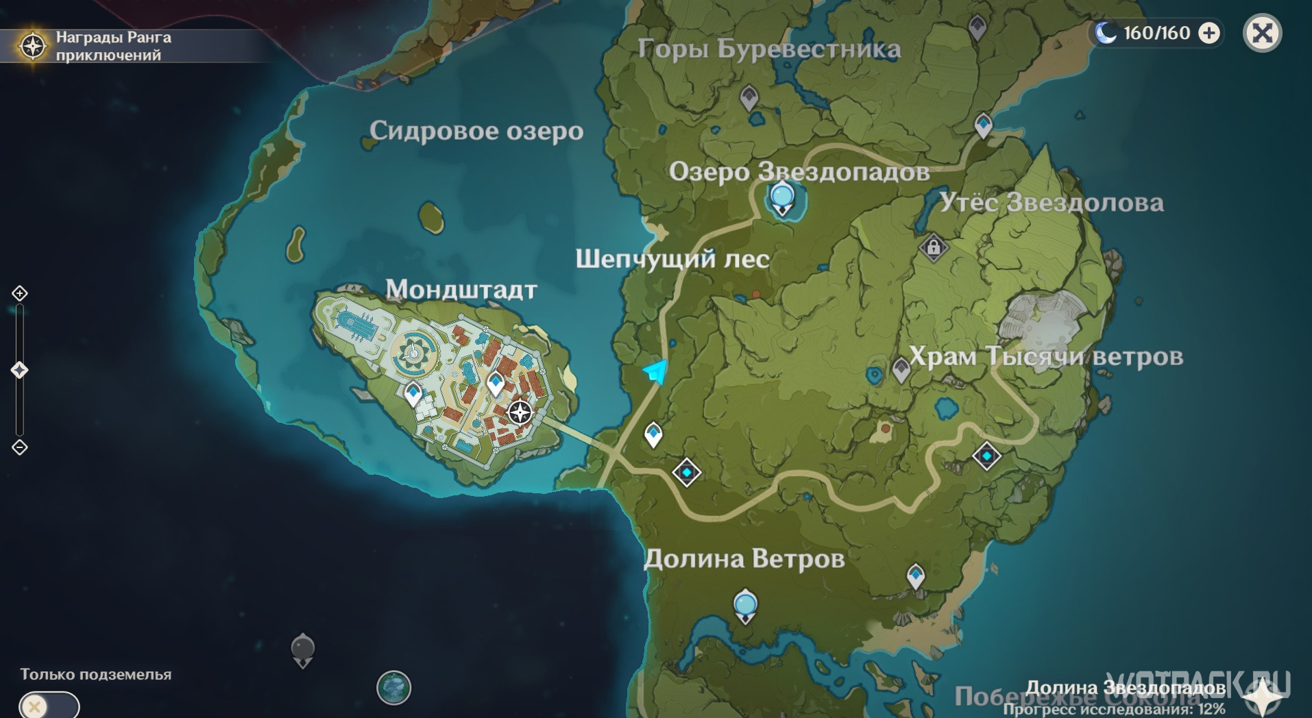Карта ведет нас в регион Спрингвейл, к озеру на юге от Мондштадта. У новичков эта часть карты еще не открыта, поэтому рекомендуем переместиться к статуе Анемо Архонта в Долине Ветров.