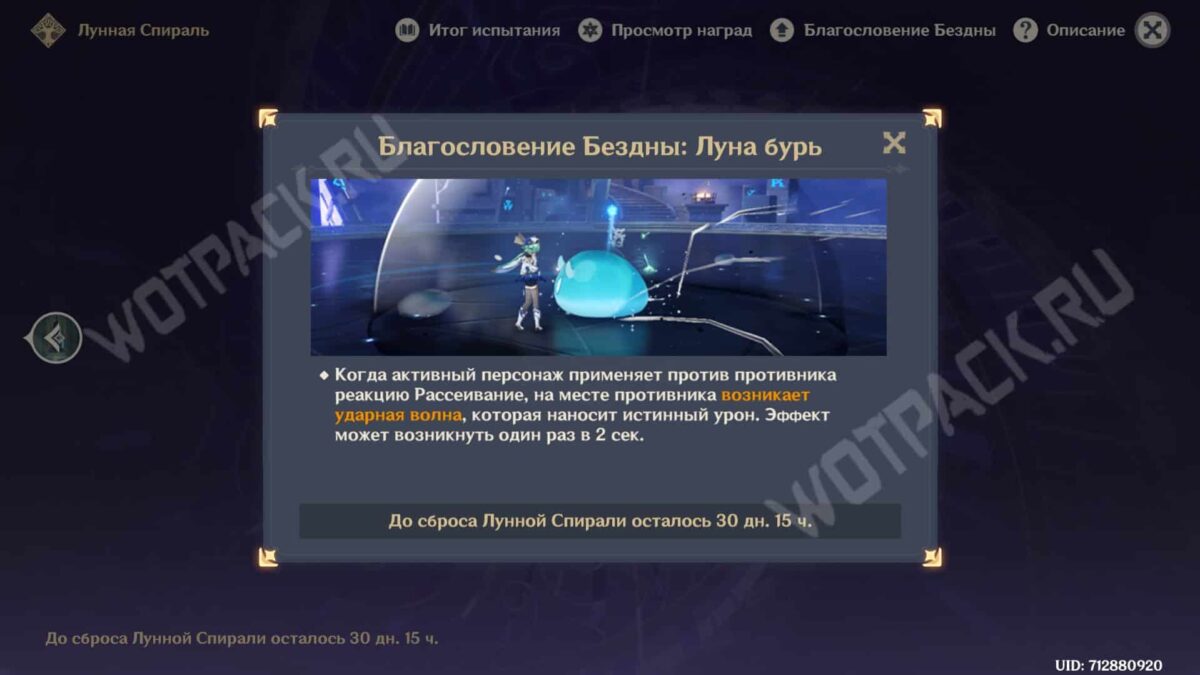 Текущее Благословение Бездны — Луна бурь. Когда активный герой активирует реакцию Рассеивание, врагов бьёт ударная волна с истинным уроном. Эффект может возникнуть один раз в 2 секунды.