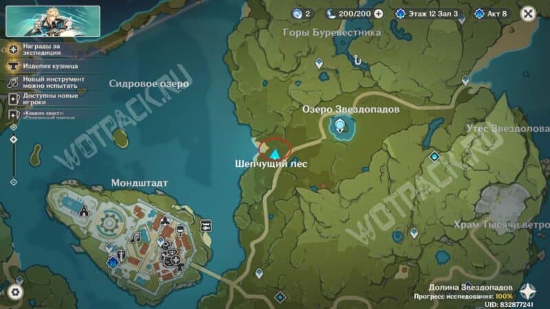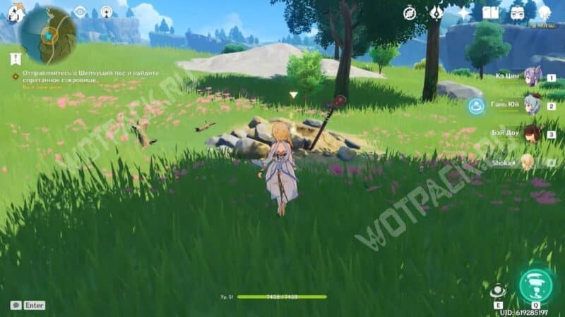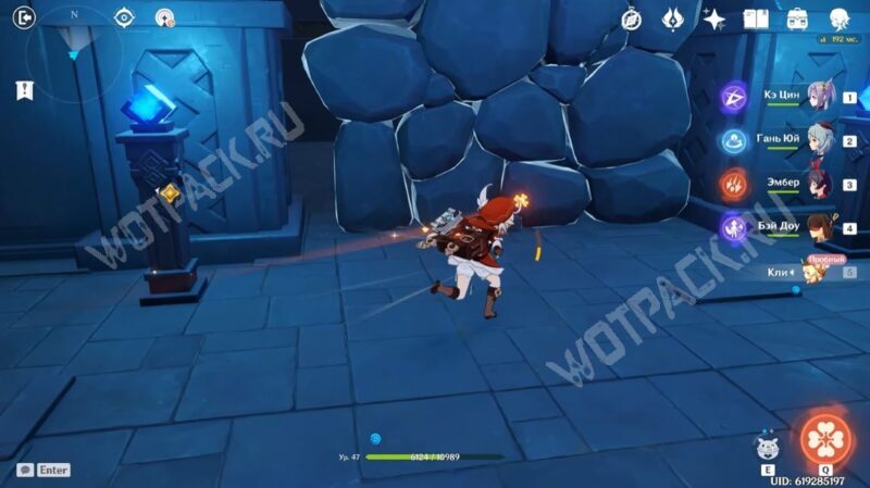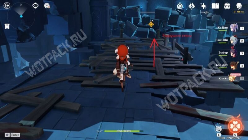 Пересеките мост, убейте хиличурла и пройдите направо. Затем разбейте каменную кладку посередине стены и войдите в комнату, в которой есть богатый сундук.