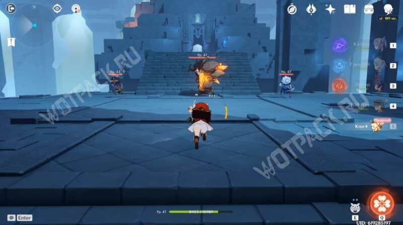 Первый раз будет совсем недалеко, на уступе. Монстр призовёт двух маленьких и одного большого Пиро слайма. Они не самые сильные враги, но преимуществом против них имеют Гидро и Крио персонажи.