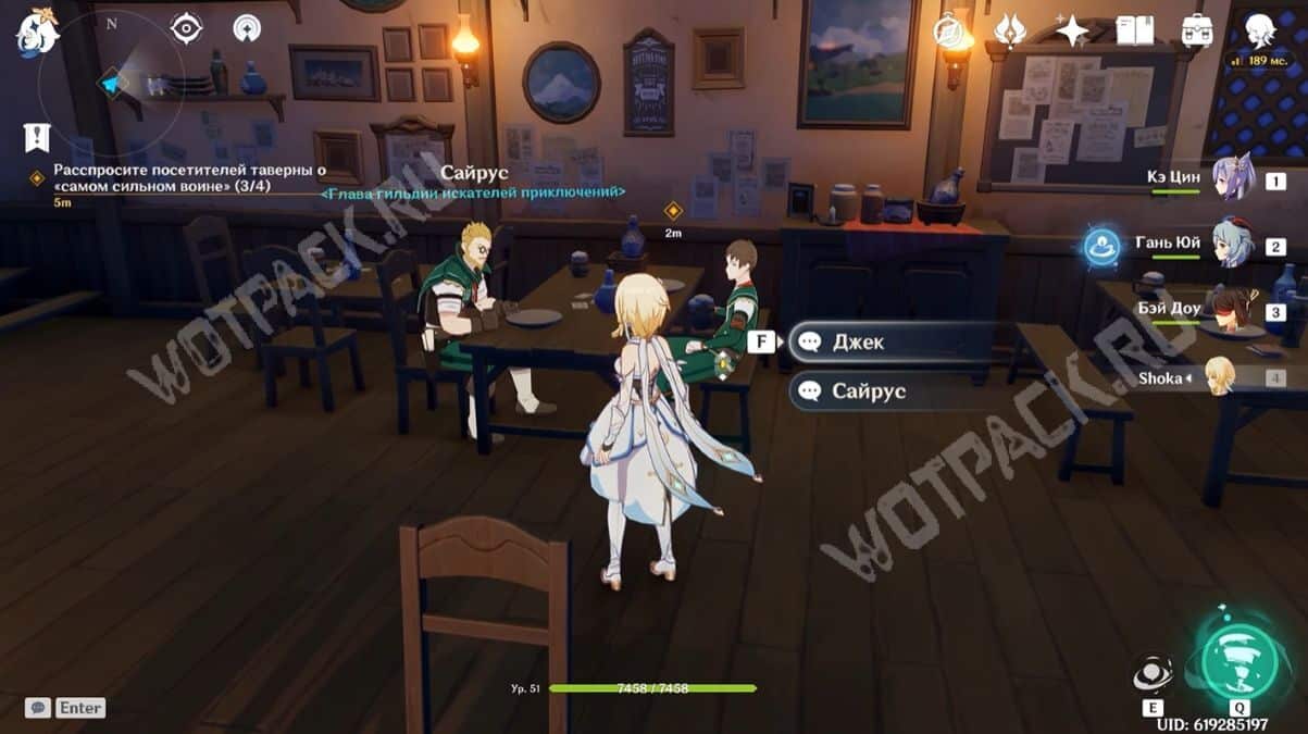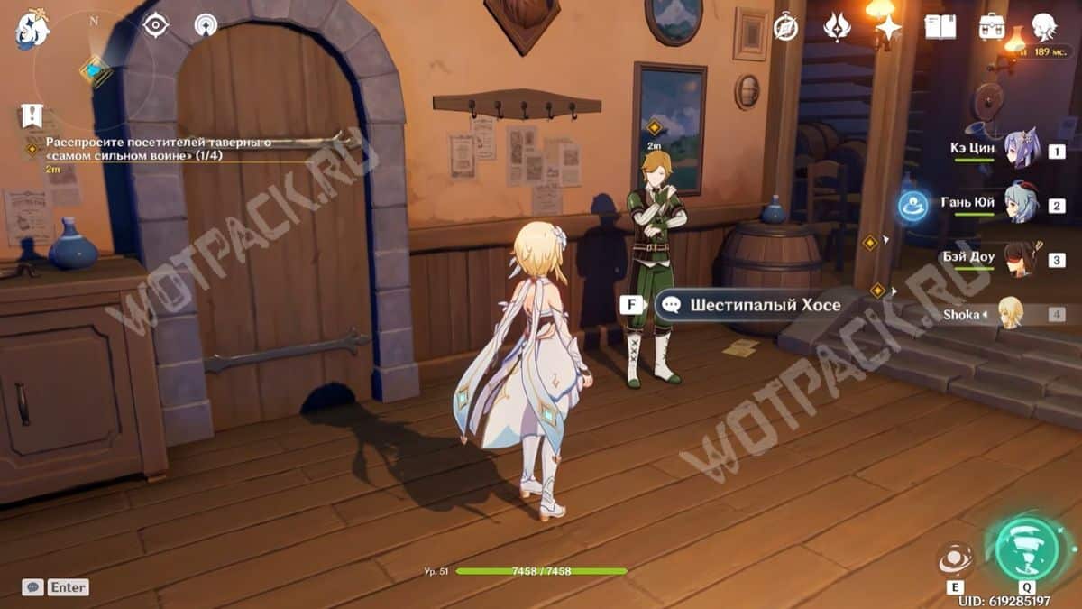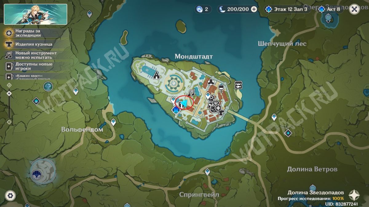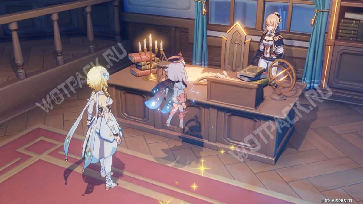 Войдя в здание, поверните налево и в кабинете магистра спросите Джинн о сильнейшем воине из Мондштадта. Она расскажет, что записей о таком никто не ведёт, а также добавит, что неподалёку от города заметили одного мага Бездны, и попросит с ним разобраться.