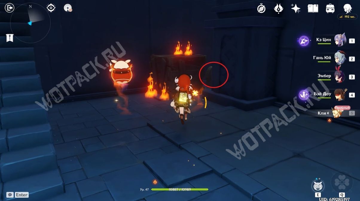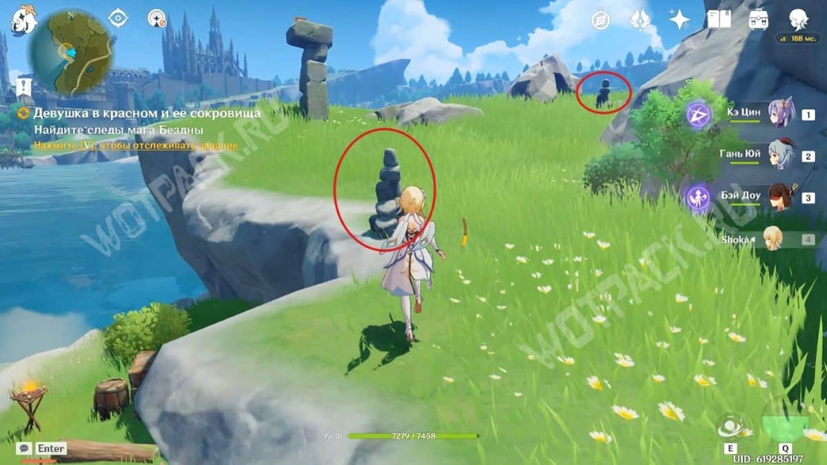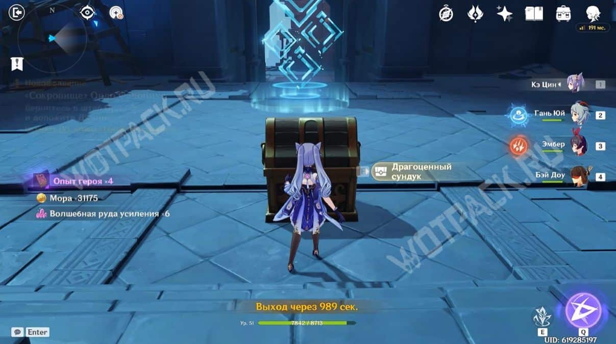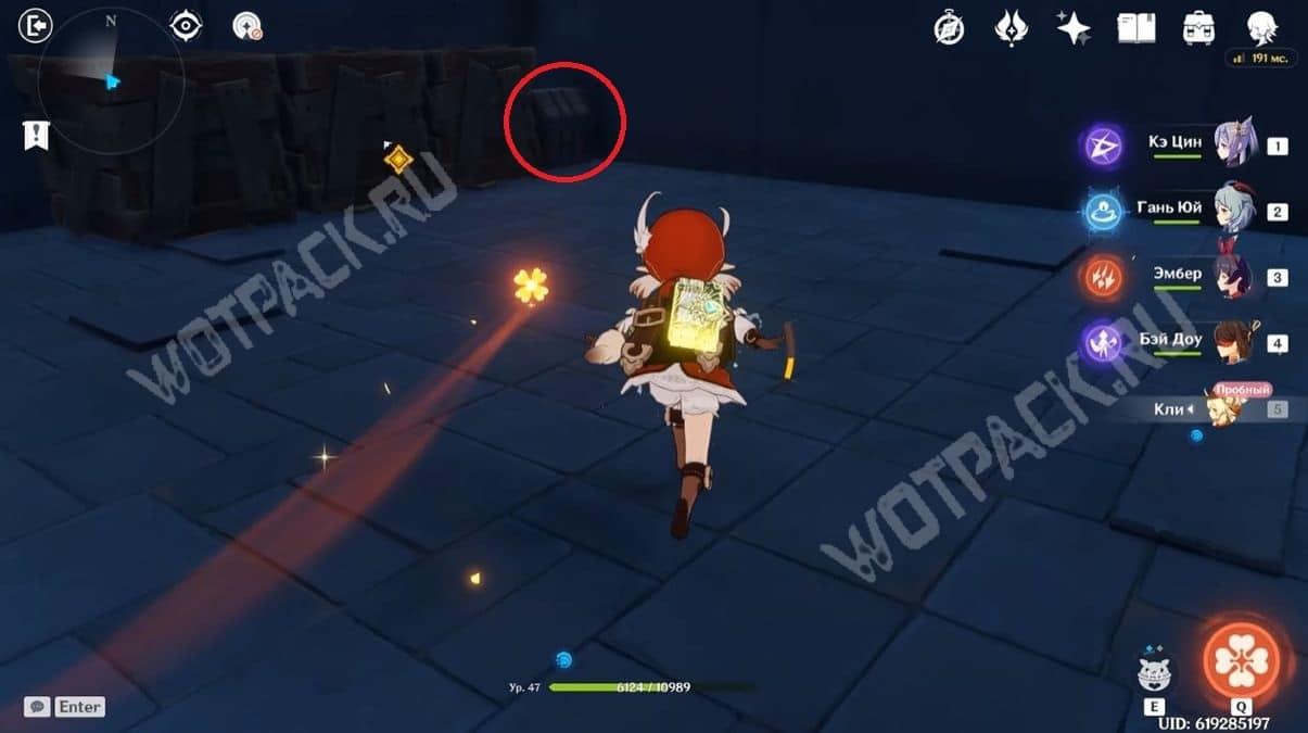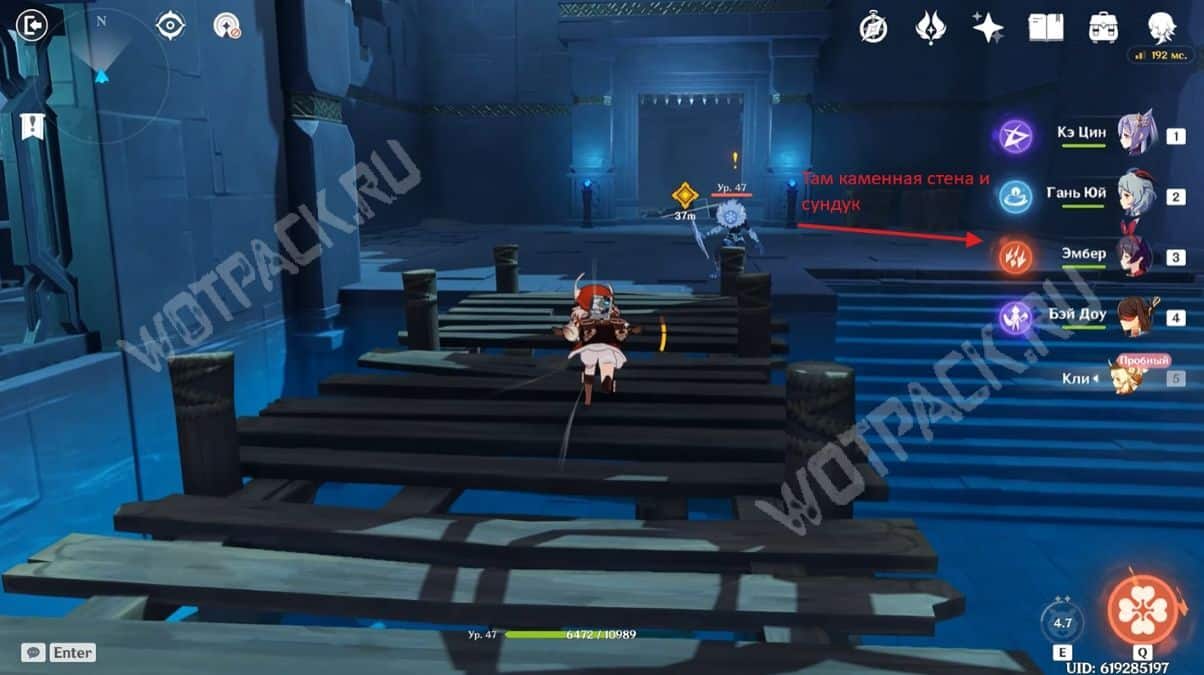 Пересеките мост, убейте хиличурла и пройдите направо. Затем разбейте каменную кладку посередине стены и войдите в комнату, в которой есть богатый сундук.