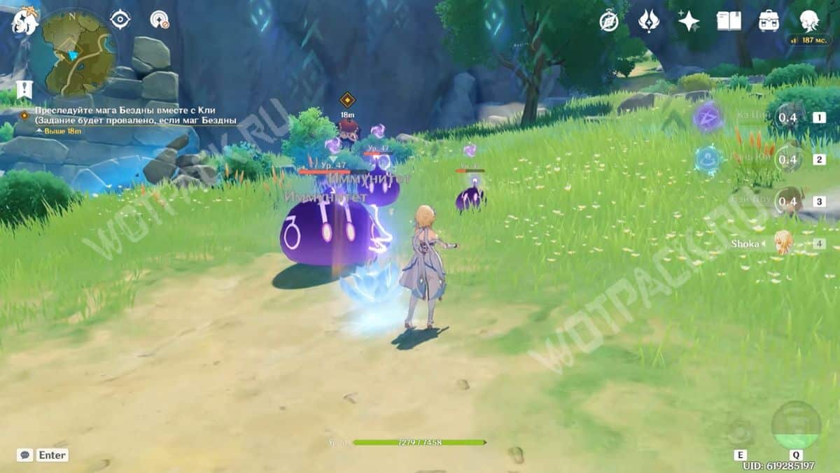 Далее появятся большие земляные слаймы. Чтобы разбить их щит, используйте персонажей с двуручным мечом или прожмите Е-шку героев с Гео элементом.