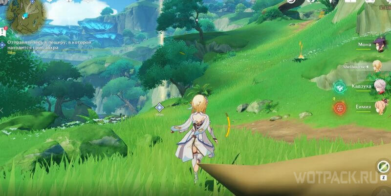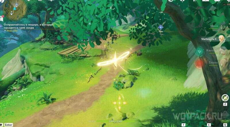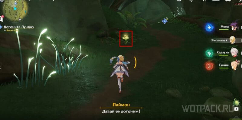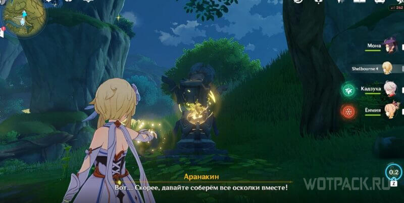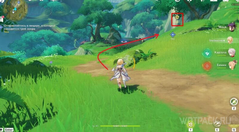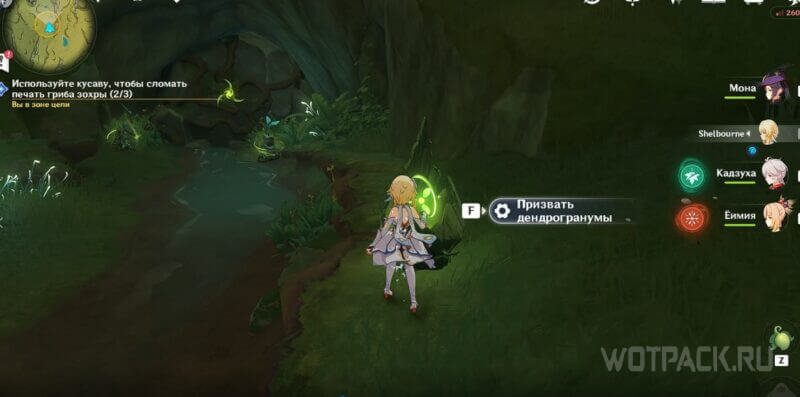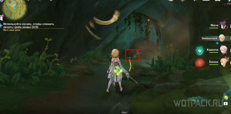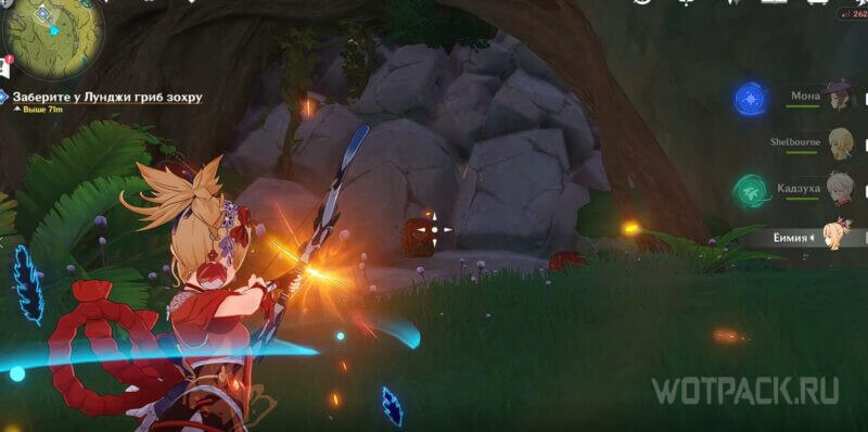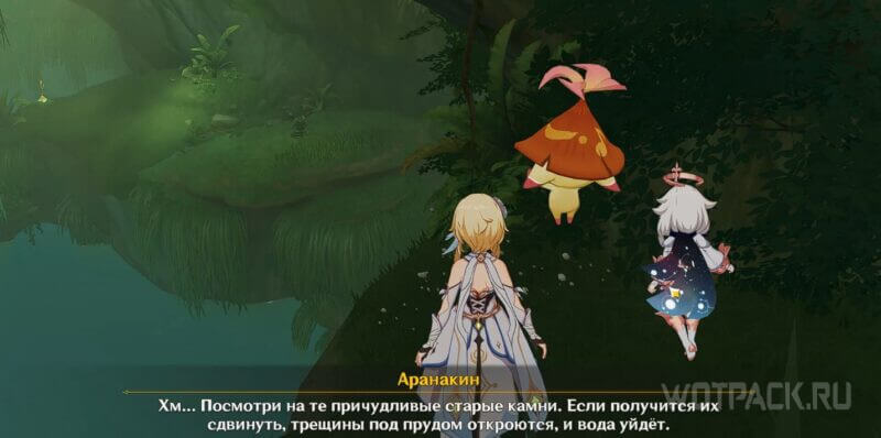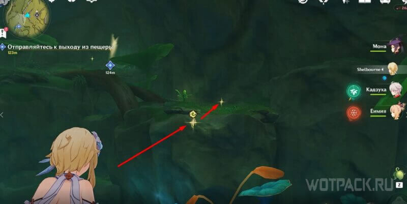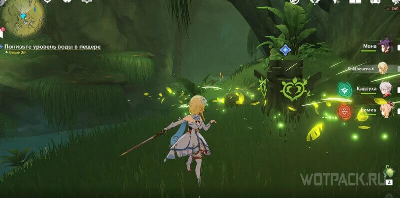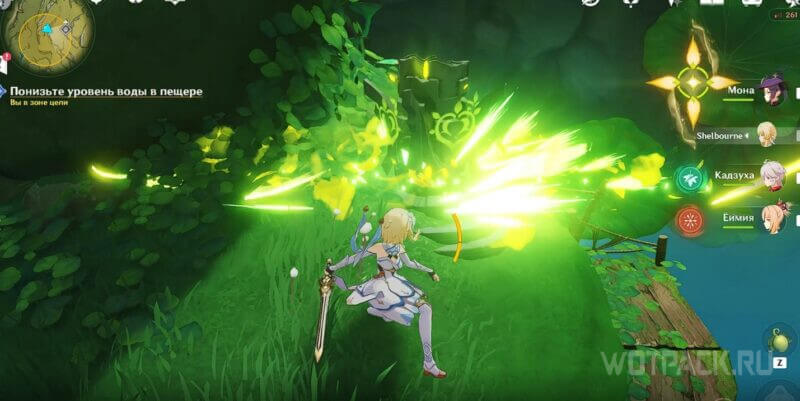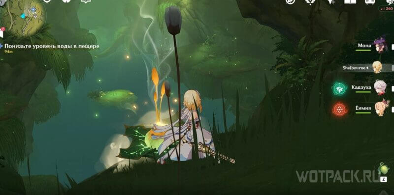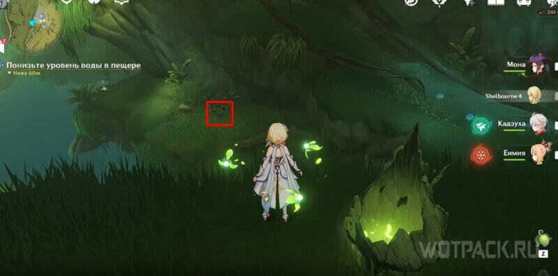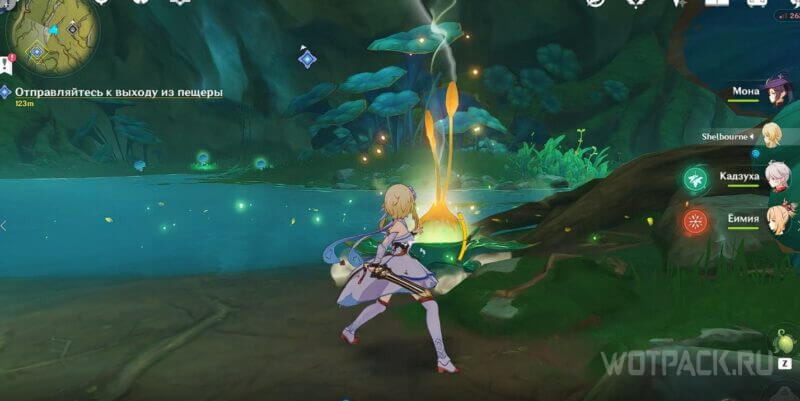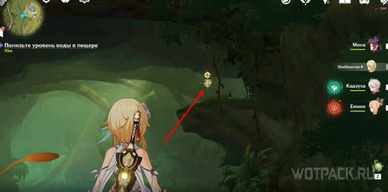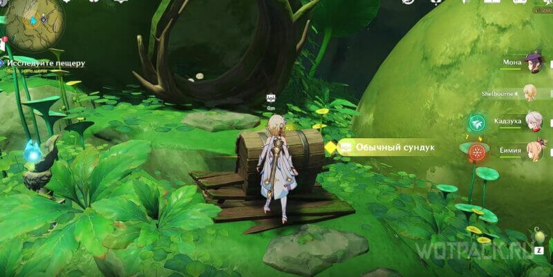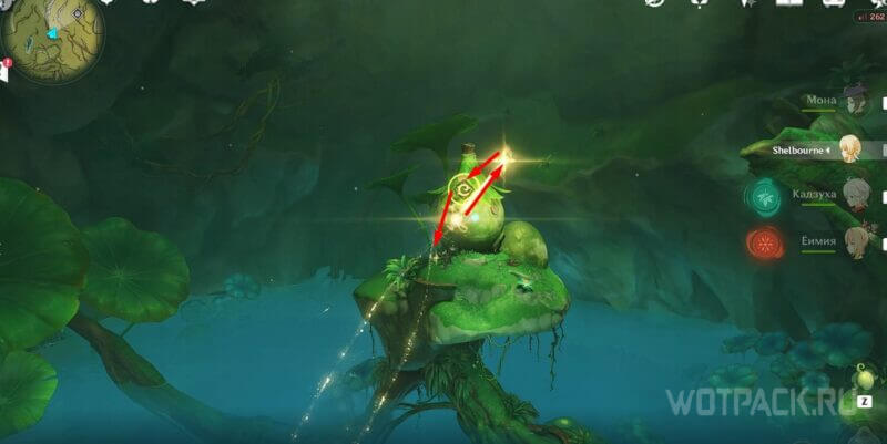 - Активируйте его Дендро стихией, чтобы еще раз опустить воду в пещере. Фея-проводница наконец попадет в свой сад и появится возможно забрать сундук.