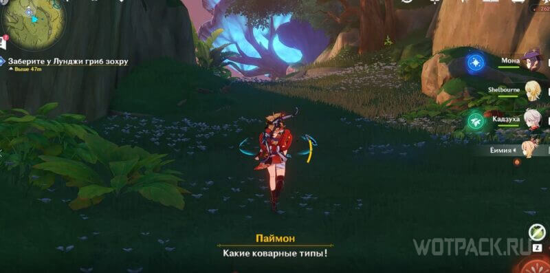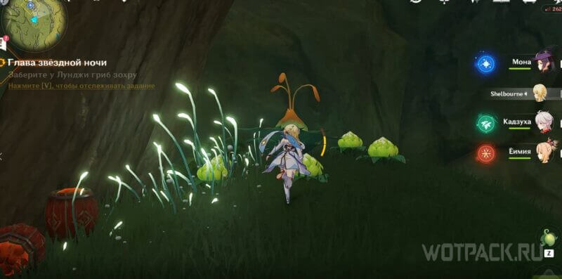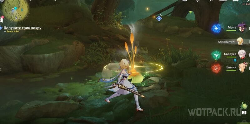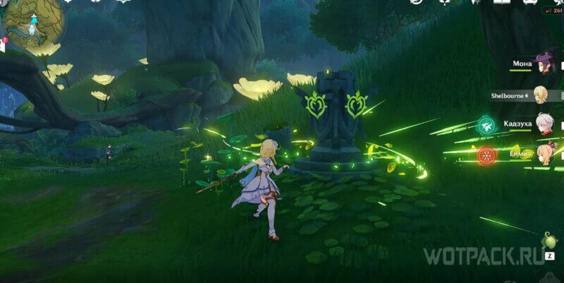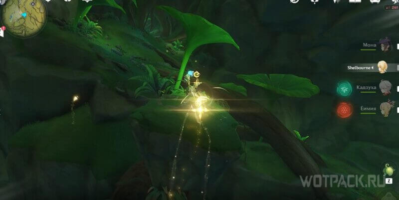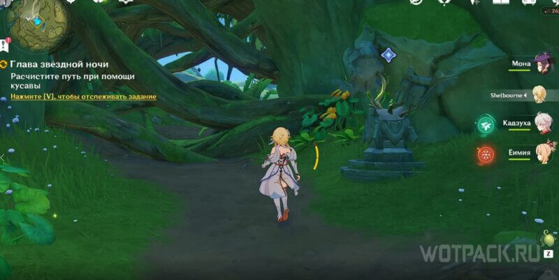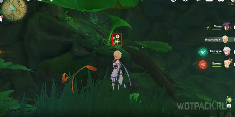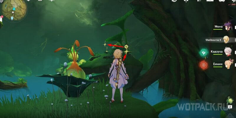 - Взаимодействуйте с тычинкой в виде луковицы поблизости, применив силу Дендро, чтобы появился четырехлистный символ.