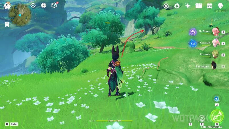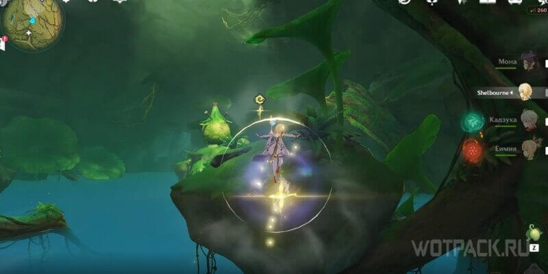 Для того чтобы покинуть текущую зону, выйдите из-под корня дерева к луковице и используйте любой Дендро навык, чтобы создать четырехлистный символ. Поднимитесь с его помощью наверх.