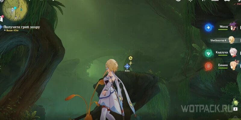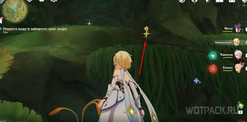 Как только все печати окажутся разблокированы, можно вернуться к грибу. Используйте Дендро на тычинке неподалеку и телепортируйтесь наверх при помощи символа. Однако зохры на месте не окажется.