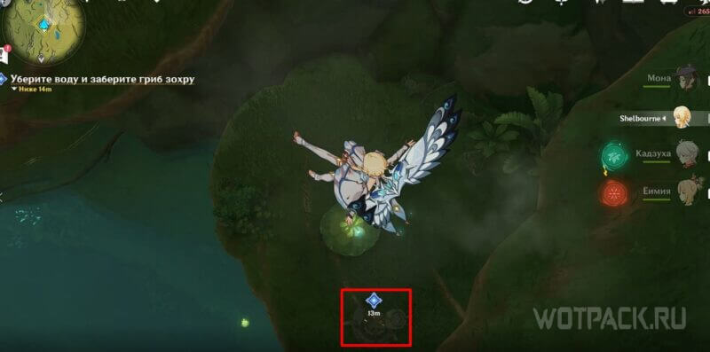 - Парите до выступа слева – там располагается монумент. Активируйте на нем инструмент и атакуйте Дендро стихией, чтобы спустить воду.
