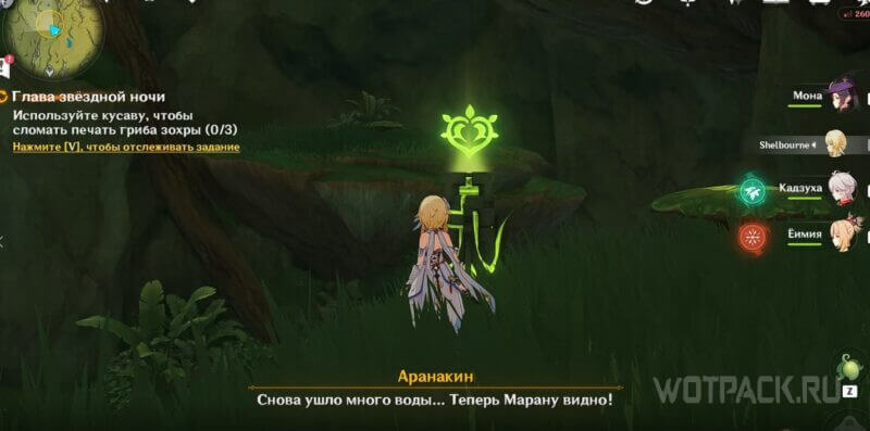 - Как только окажетесь рядом с тотемом, используйте Кусаву и почините его, после чего атакуйте Дендро элементом. Начнется мини-катсцена и вода немного опустится.