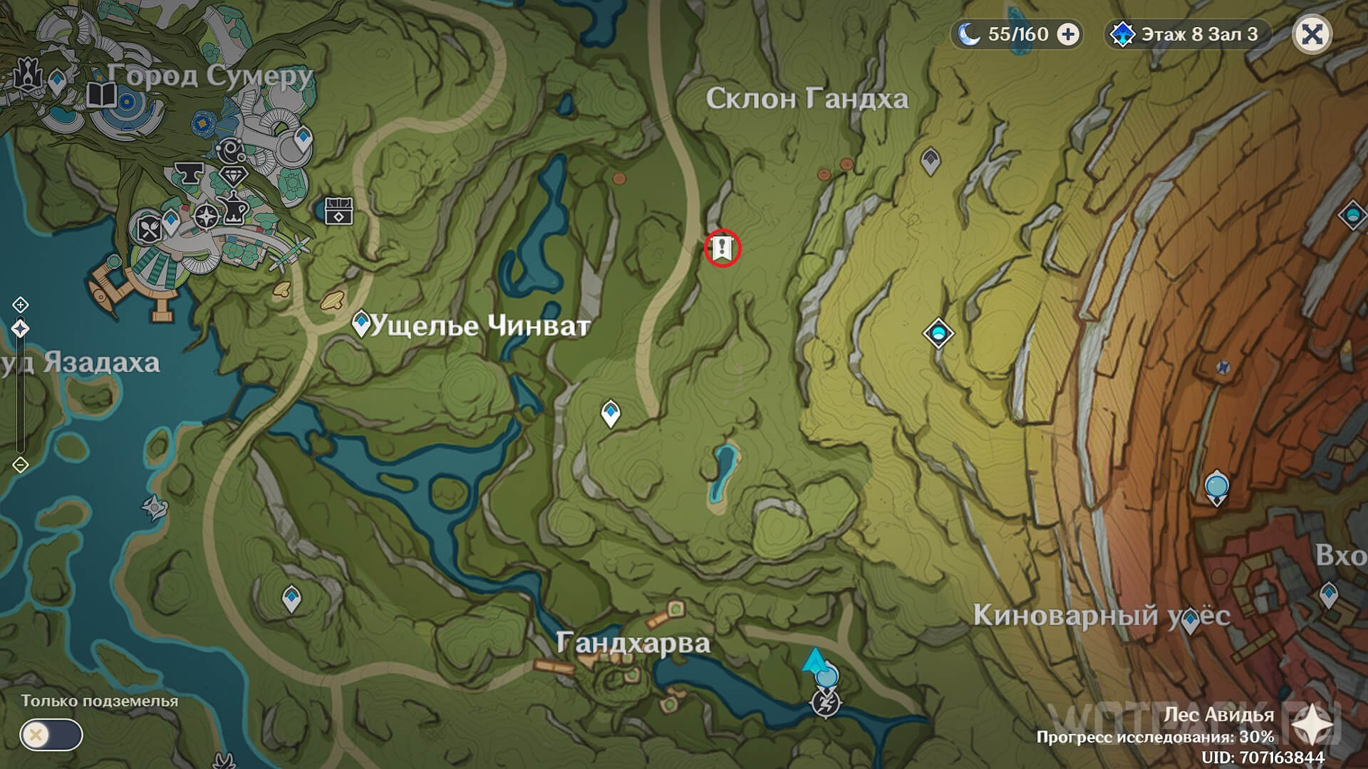 Войдите в пещеру, практически полностью затопленную водой. Используйте силу Кусавы, чтобы восстановить все Дендро тотемы и активировать их – это позволит снизить уровень воды в пещере.