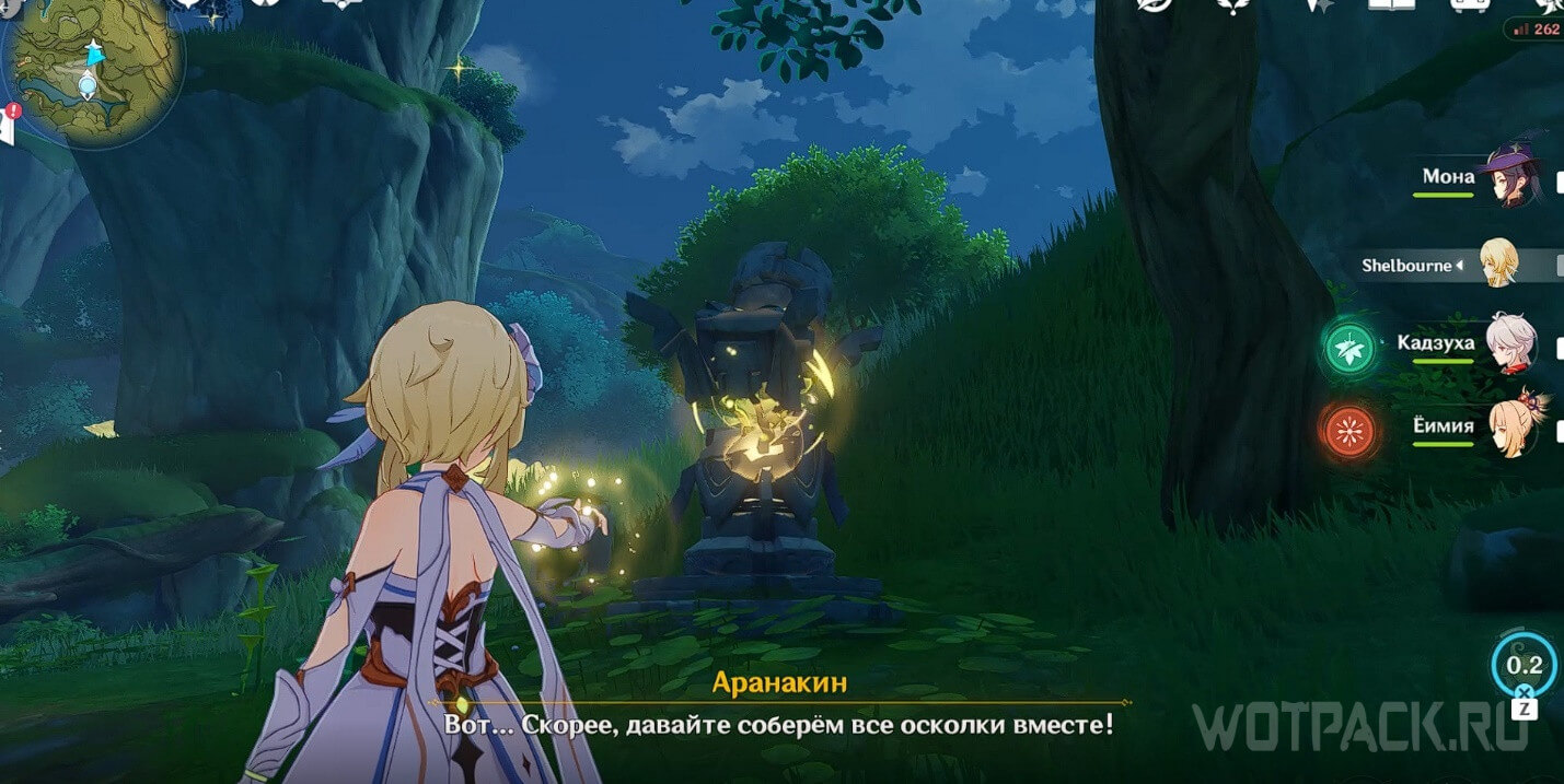 Для того чтобы использовать Кусаву, направьте ее на сломанный Дендро тотем. Нажмите на кнопку с инструментами («Z» на ПК), чтобы призвать Аранакина, который вернет механизм в состояние, пригодное для взаимодействия. После этого используйте способность Дендро, чтобы активировать элементальный монумент и открыть путь.