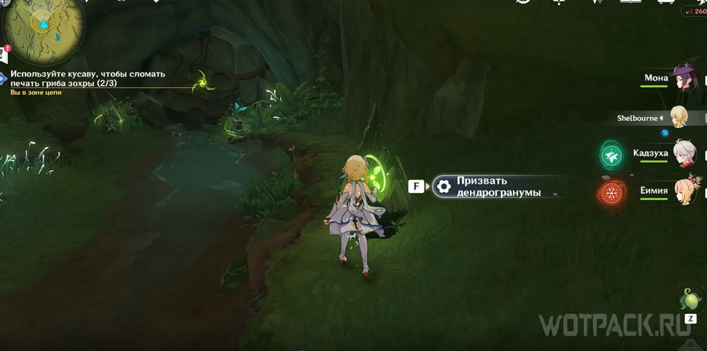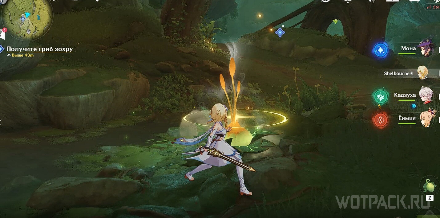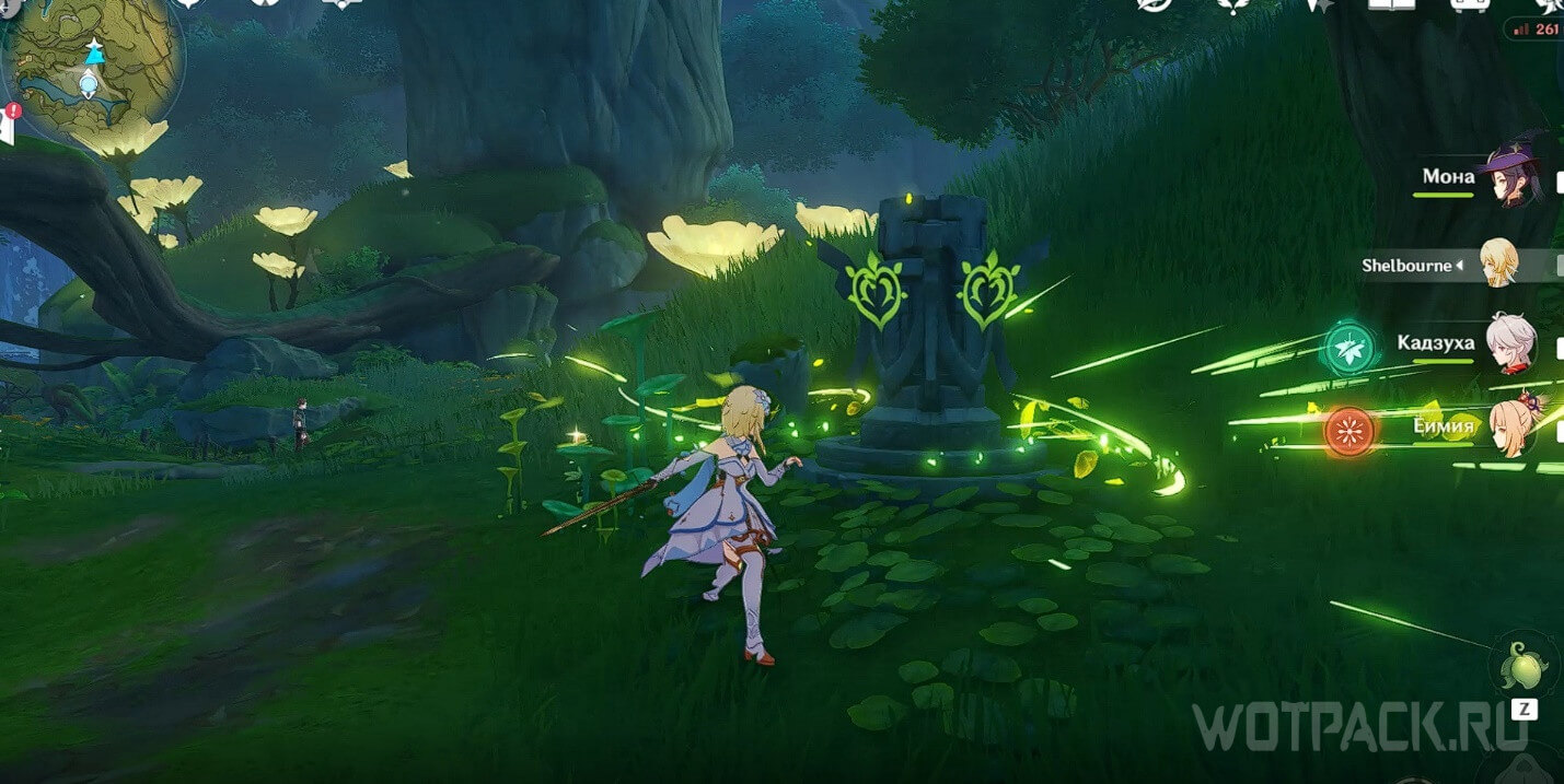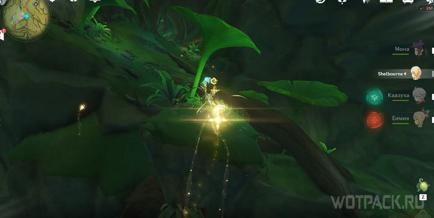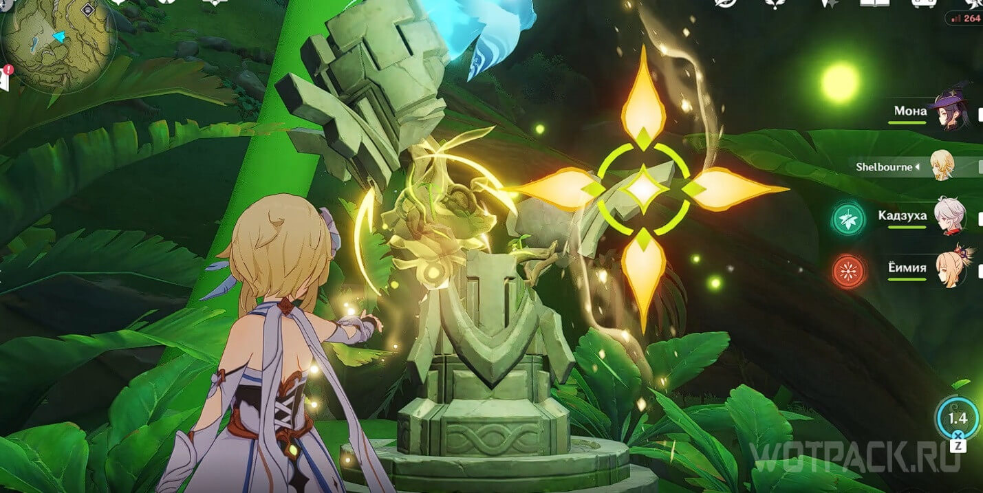 - Взаимодействуйте с тычинкой в виде луковицы поблизости, применив силу Дендро, чтобы появился четырехлистный символ.