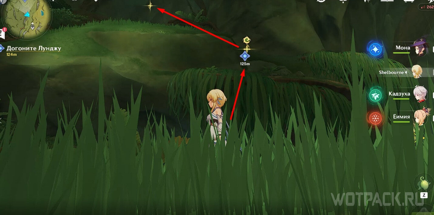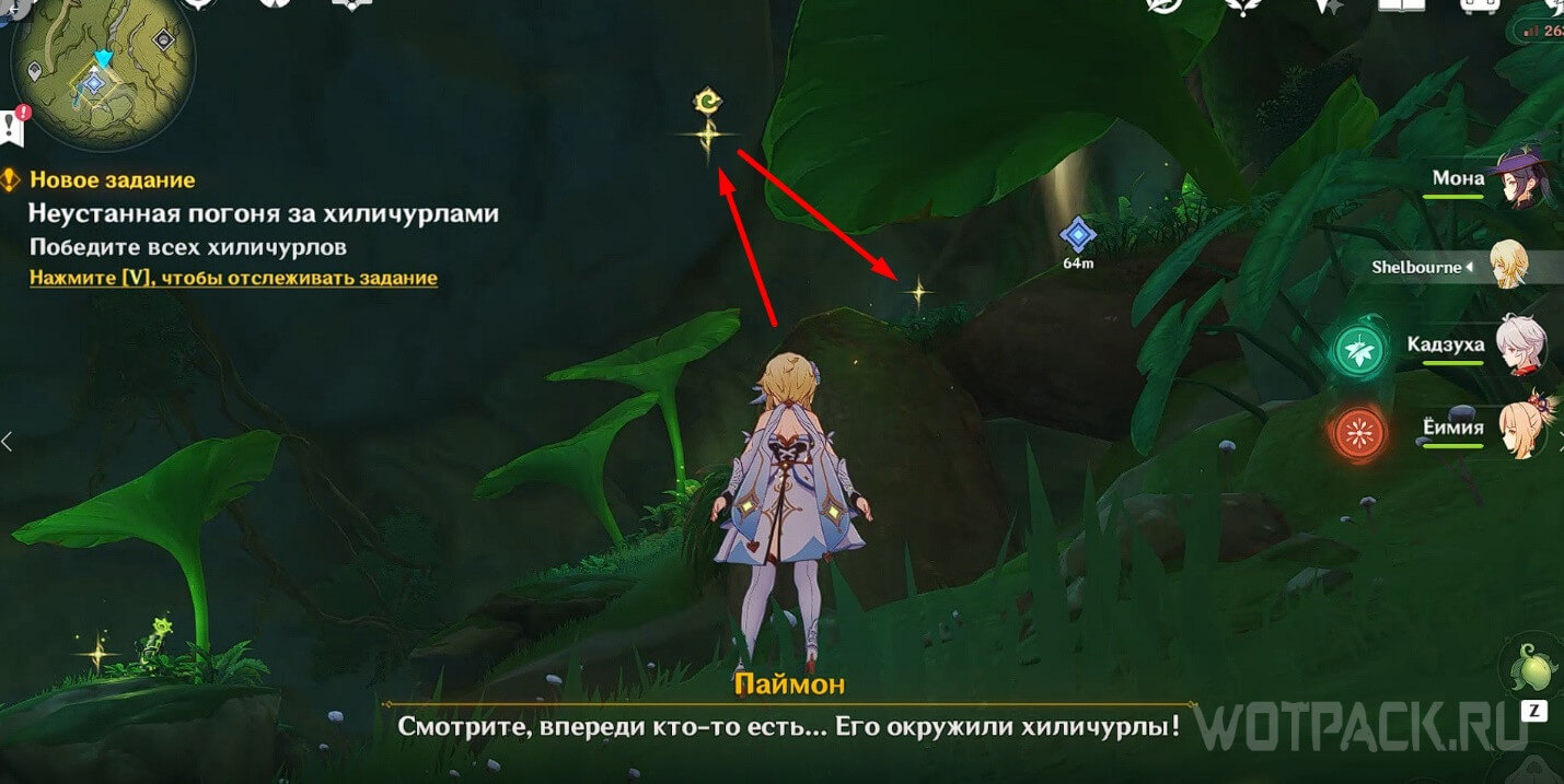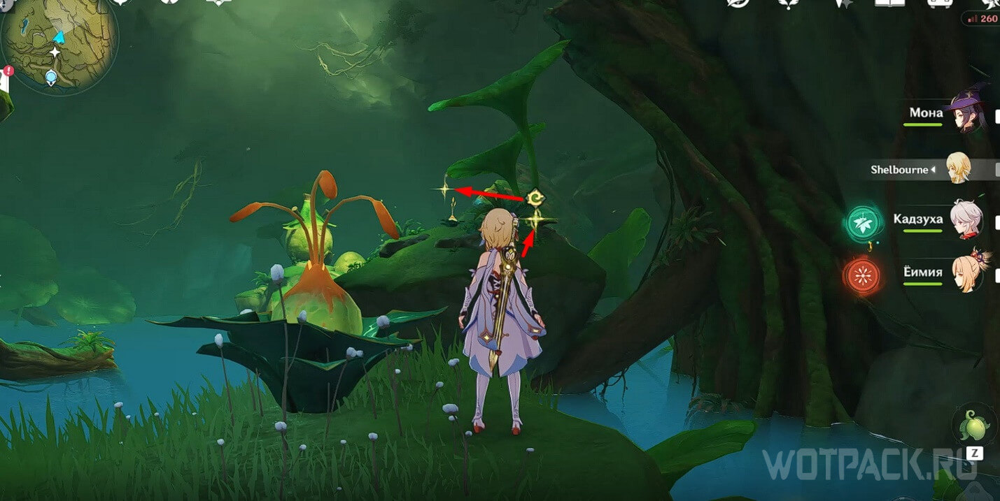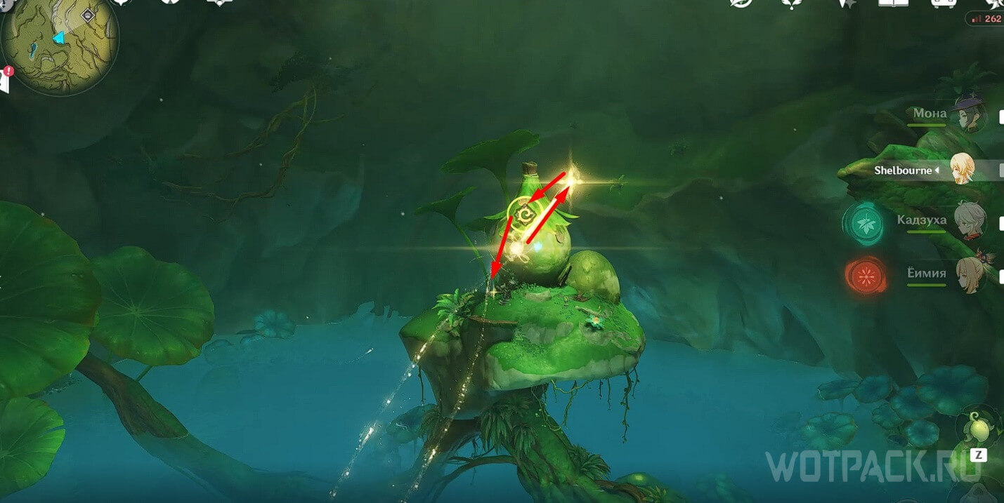 Поднимитесь по небольшой горке наверх к тычинке, перед этим издалека взорвав Дендро-мины для избежания урона. Активируйте луковицу и переместитесь с помощью символа направо вверх.