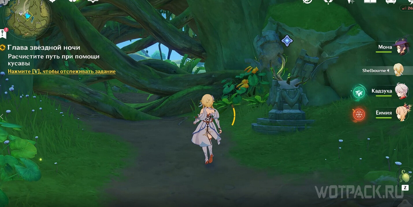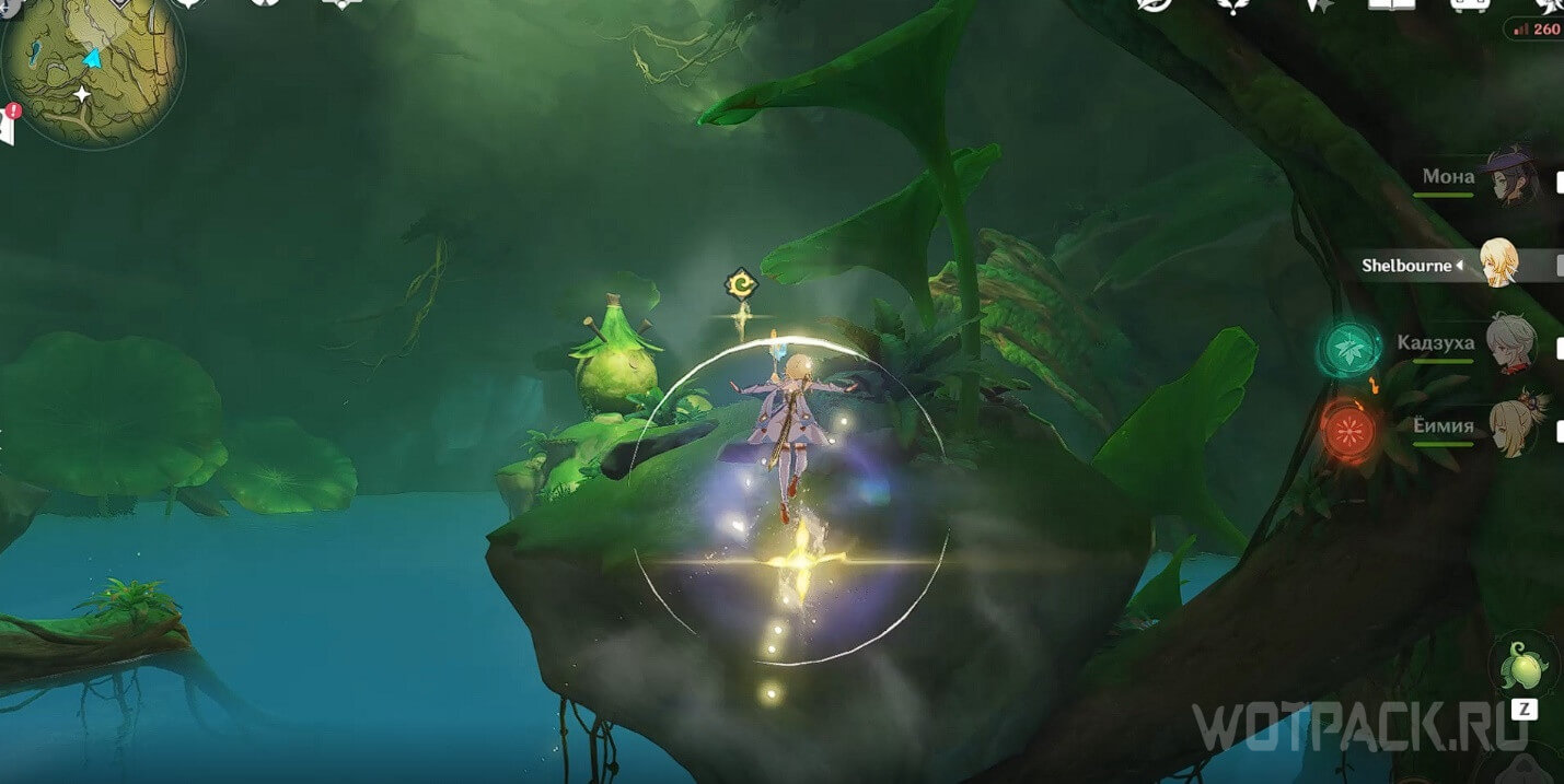 Для того чтобы покинуть текущую зону, выйдите из-под корня дерева к луковице и используйте любой Дендро навык, чтобы создать четырехлистный символ. Поднимитесь с его помощью наверх.