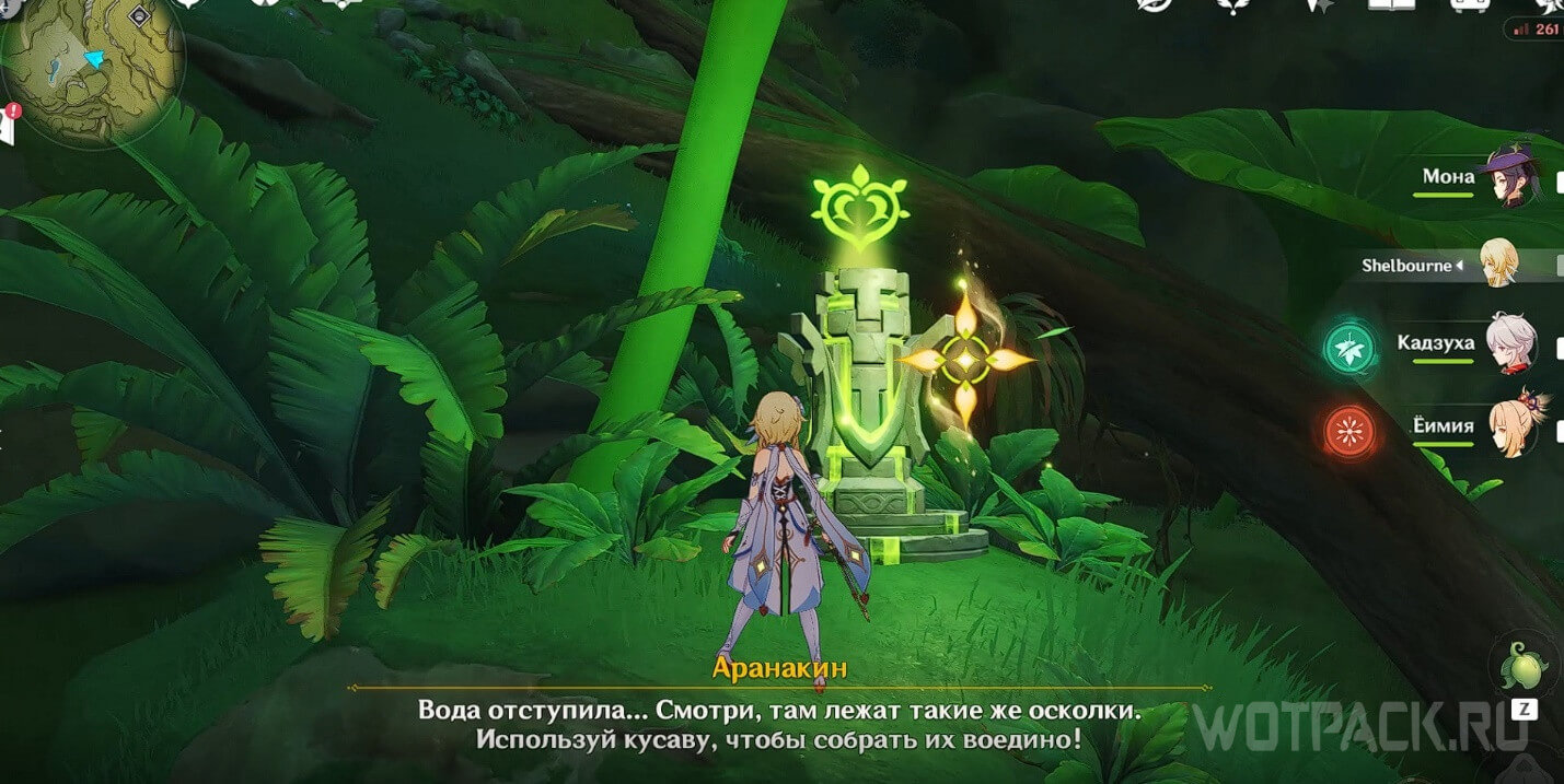 - Как только окажетесь рядом с тотемом, используйте Кусаву и почините его, после чего атакуйте Дендро элементом. Начнется мини-катсцена и вода немного опустится.