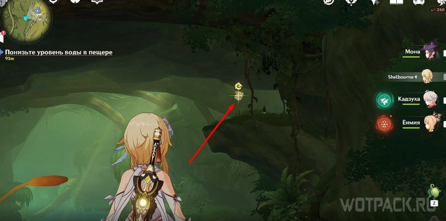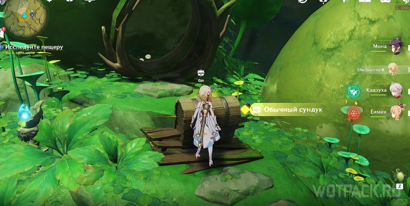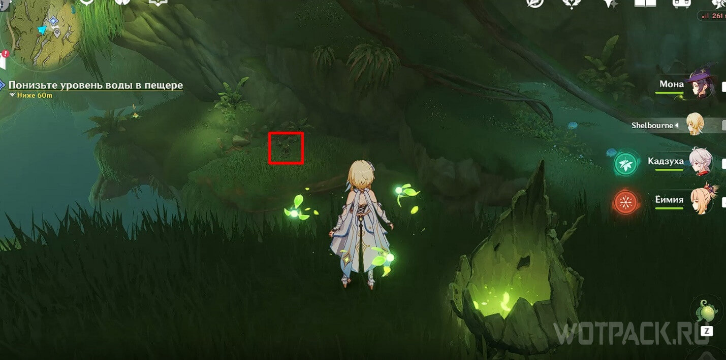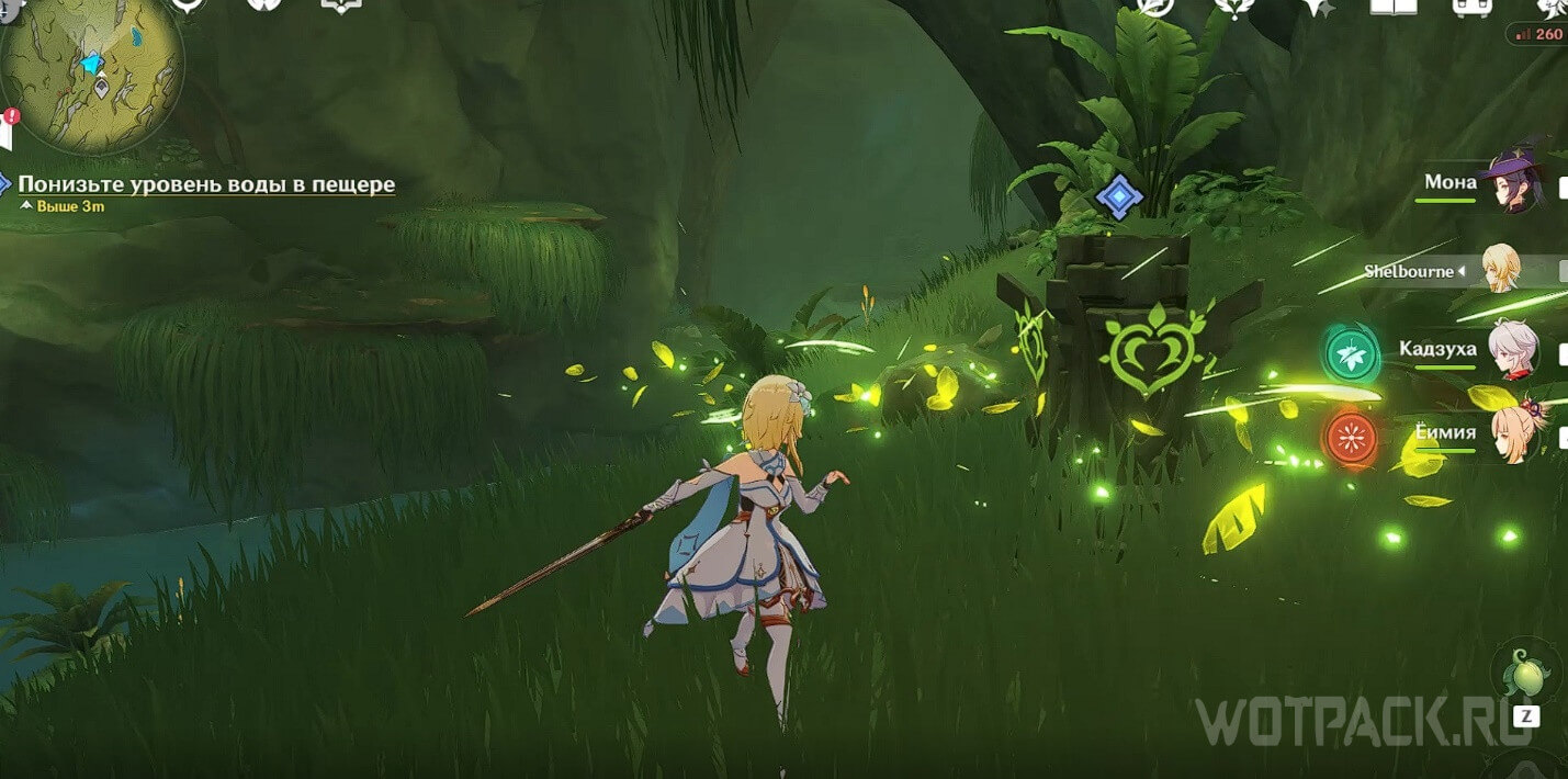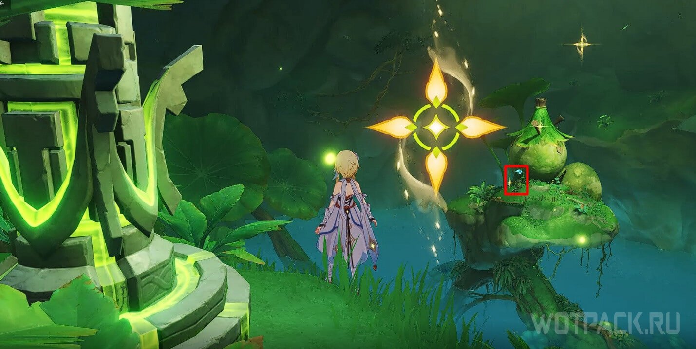 - Активируйте его Дендро стихией, чтобы еще раз опустить воду в пещере. Фея-проводница наконец попадет в свой сад и появится возможно забрать сундук.