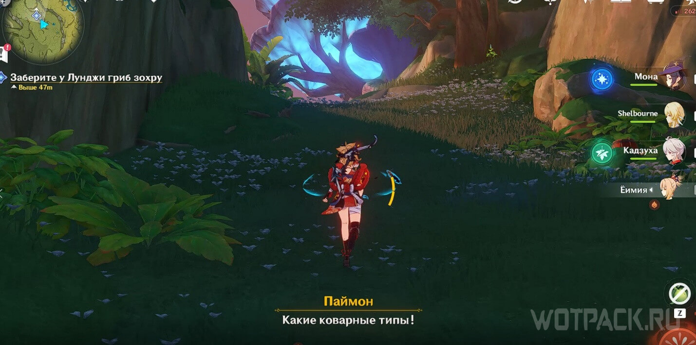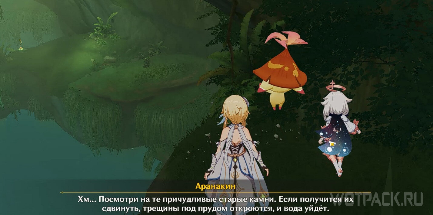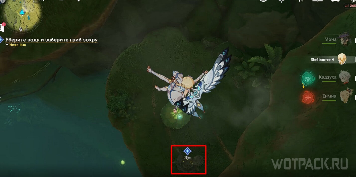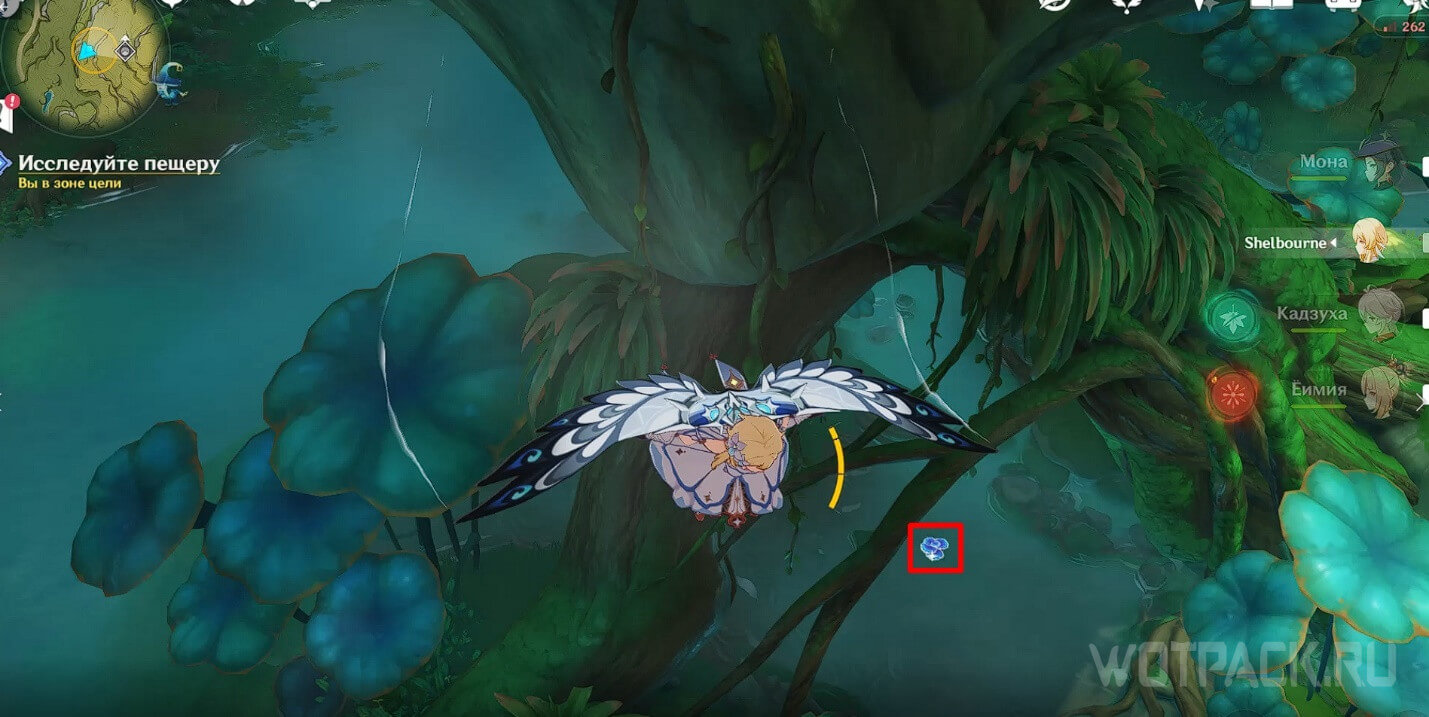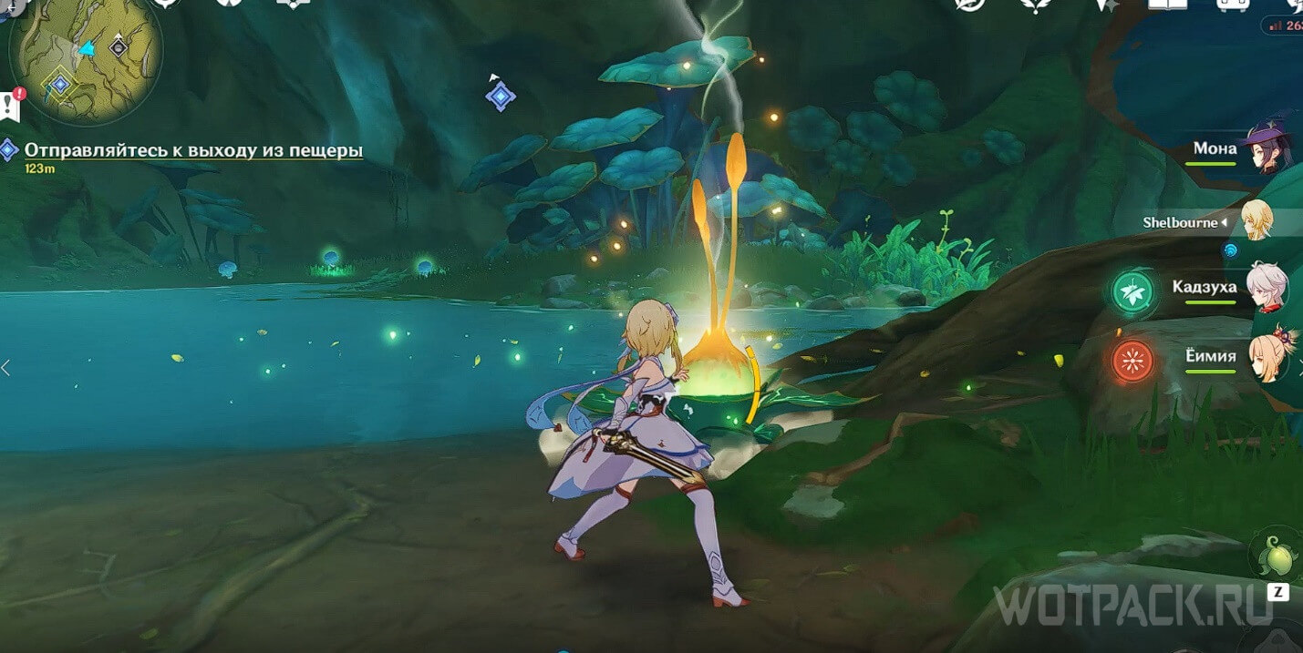- Активируйте его Дендро стихией, чтобы еще раз опустить воду в пещере. Фея-проводница наконец попадет в свой сад и появится возможно забрать сундук.