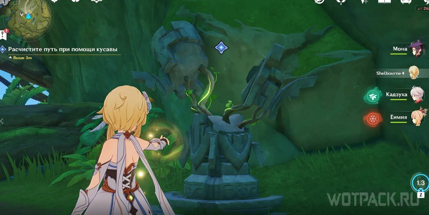 Проход снова окажется заблокирован ветвями. Используйте Кусаву на элементальном монументе рядом, чтобы восстановить его, и активируйте при помощи Дендро.