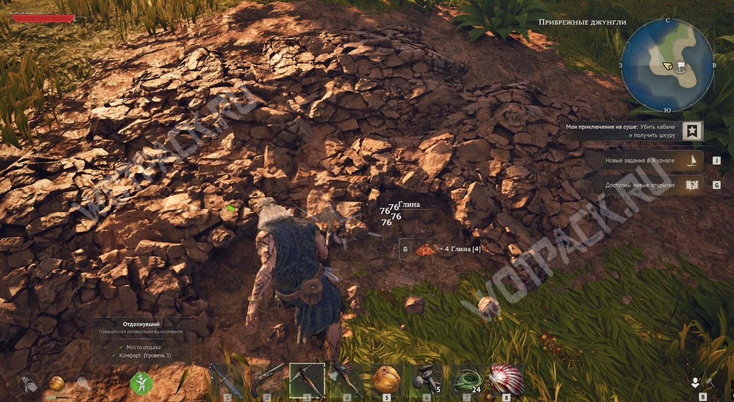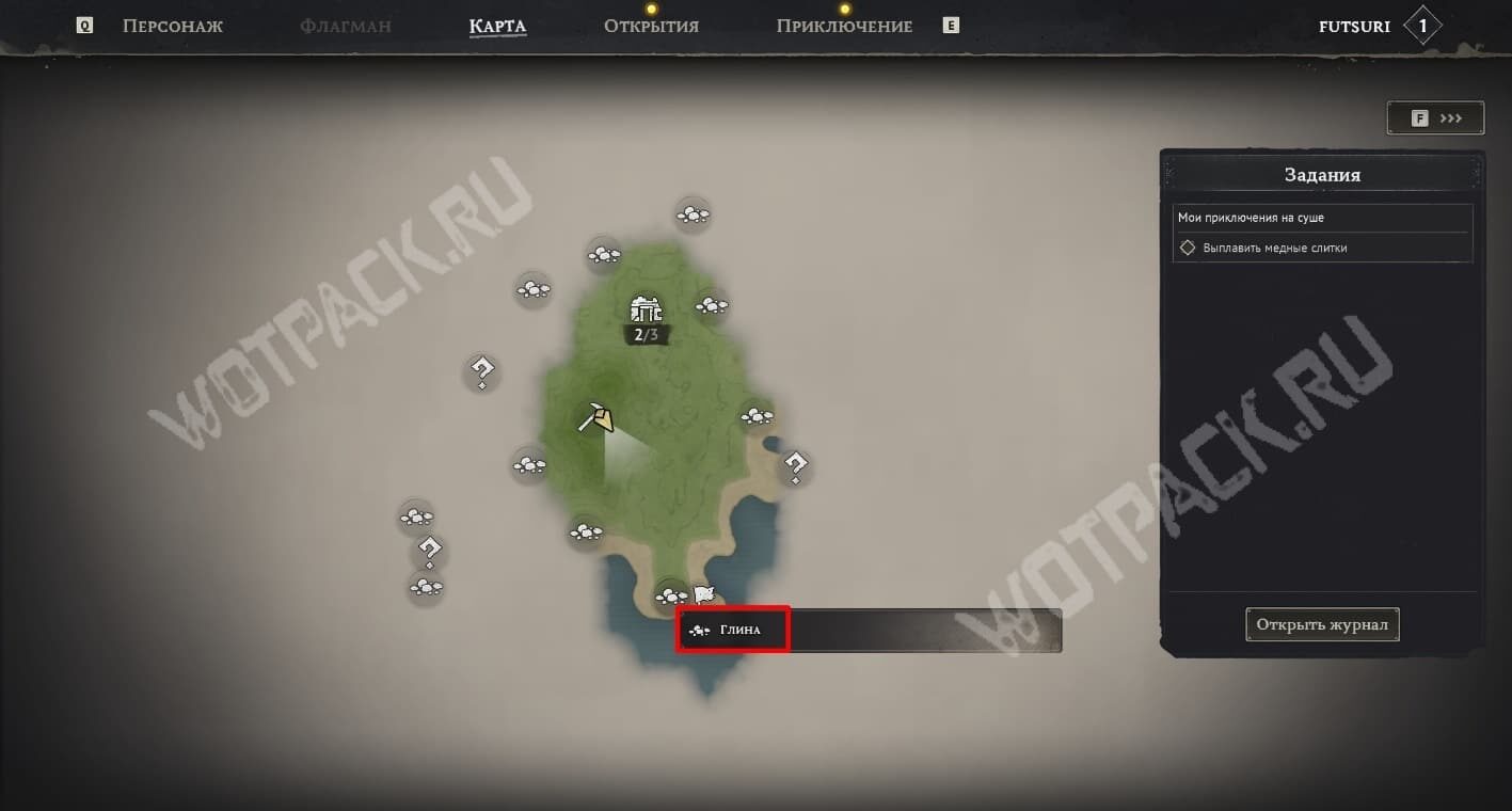 Когда продвинетесь дальше по квесту «Мои приключения на суше», получите задание по переплавке медной руды. Как только добудете её, на карте появится множество меток с залежами глины.