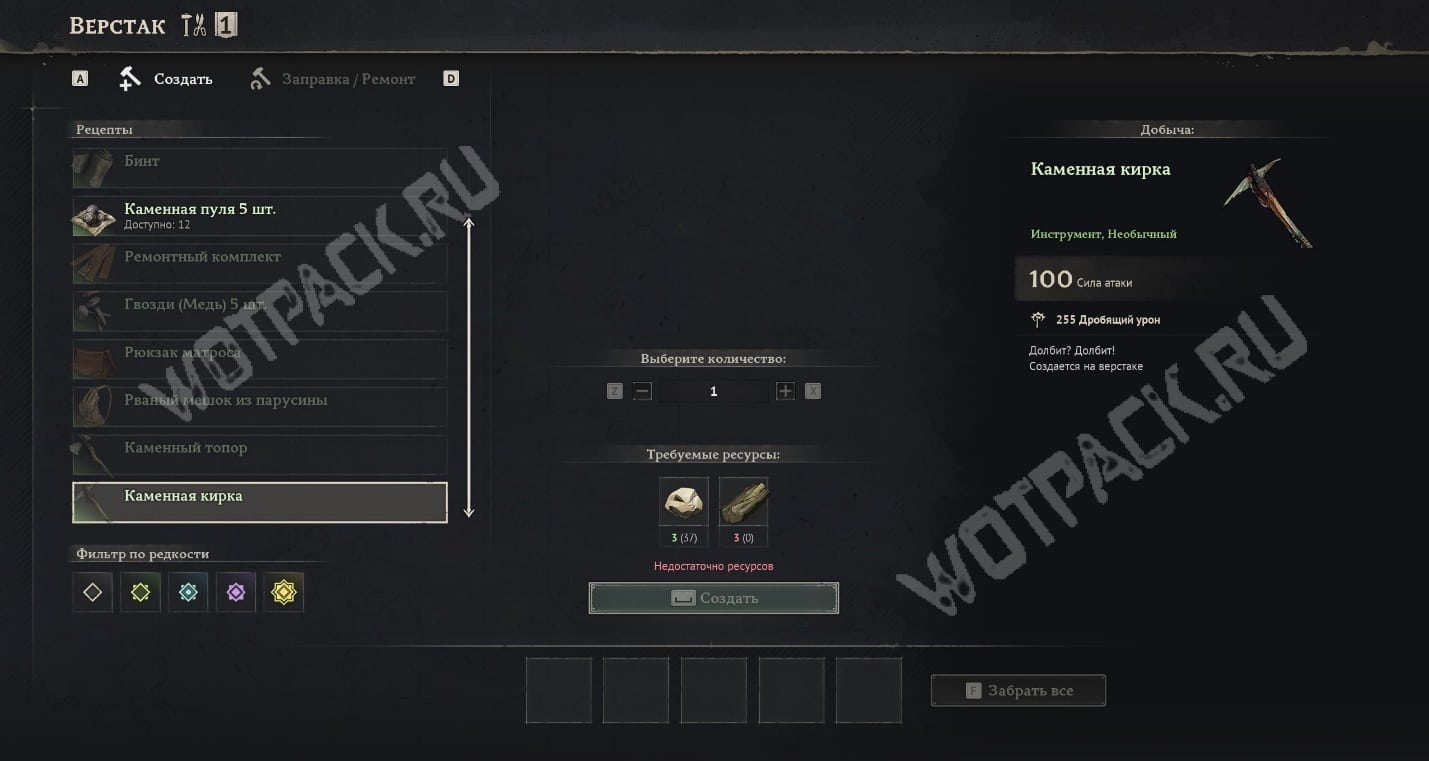 Каменная кирка создается на базовом верстаке из трёх камней и трёх единиц древесины. На старте все эти ресурсы можно найти на побережье, добывать их инструментами необязательно.