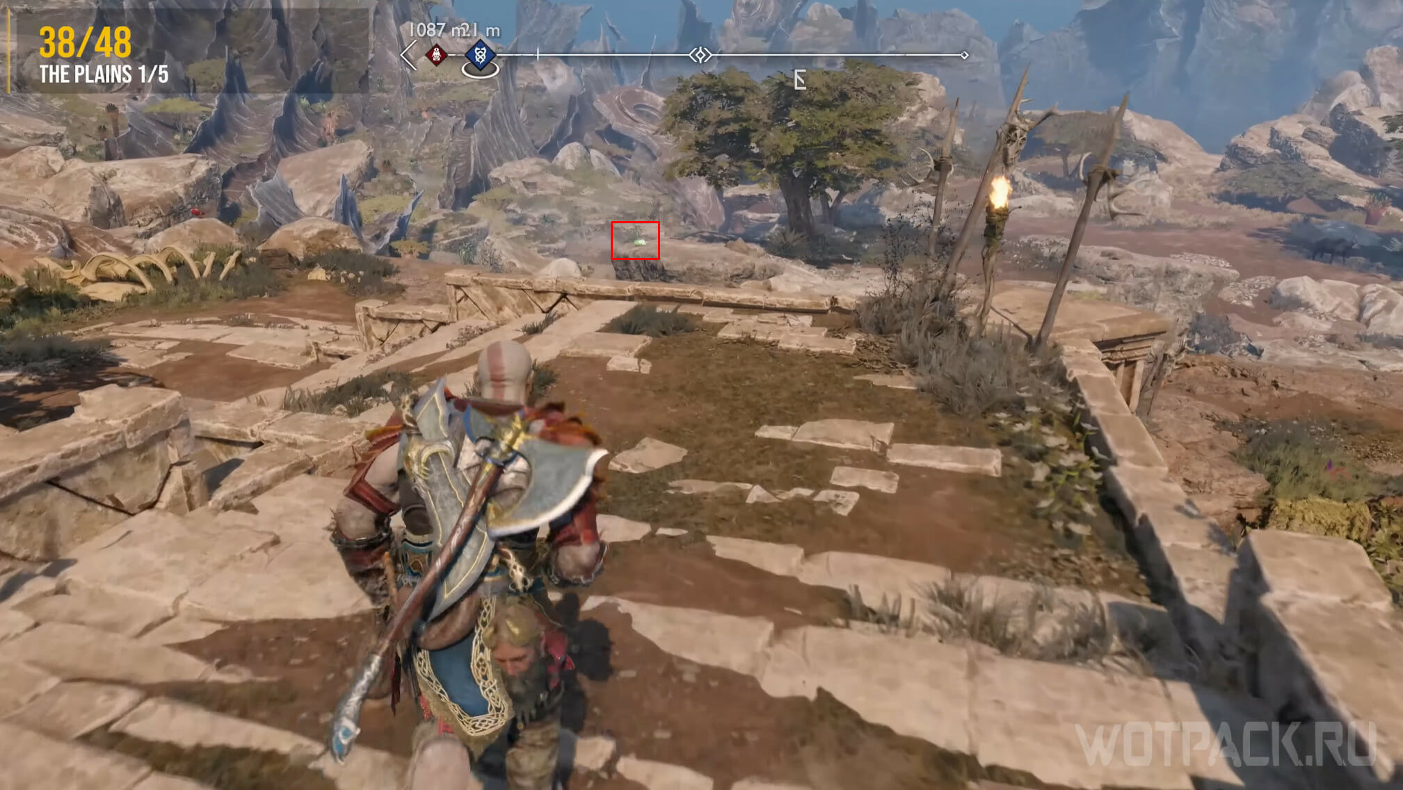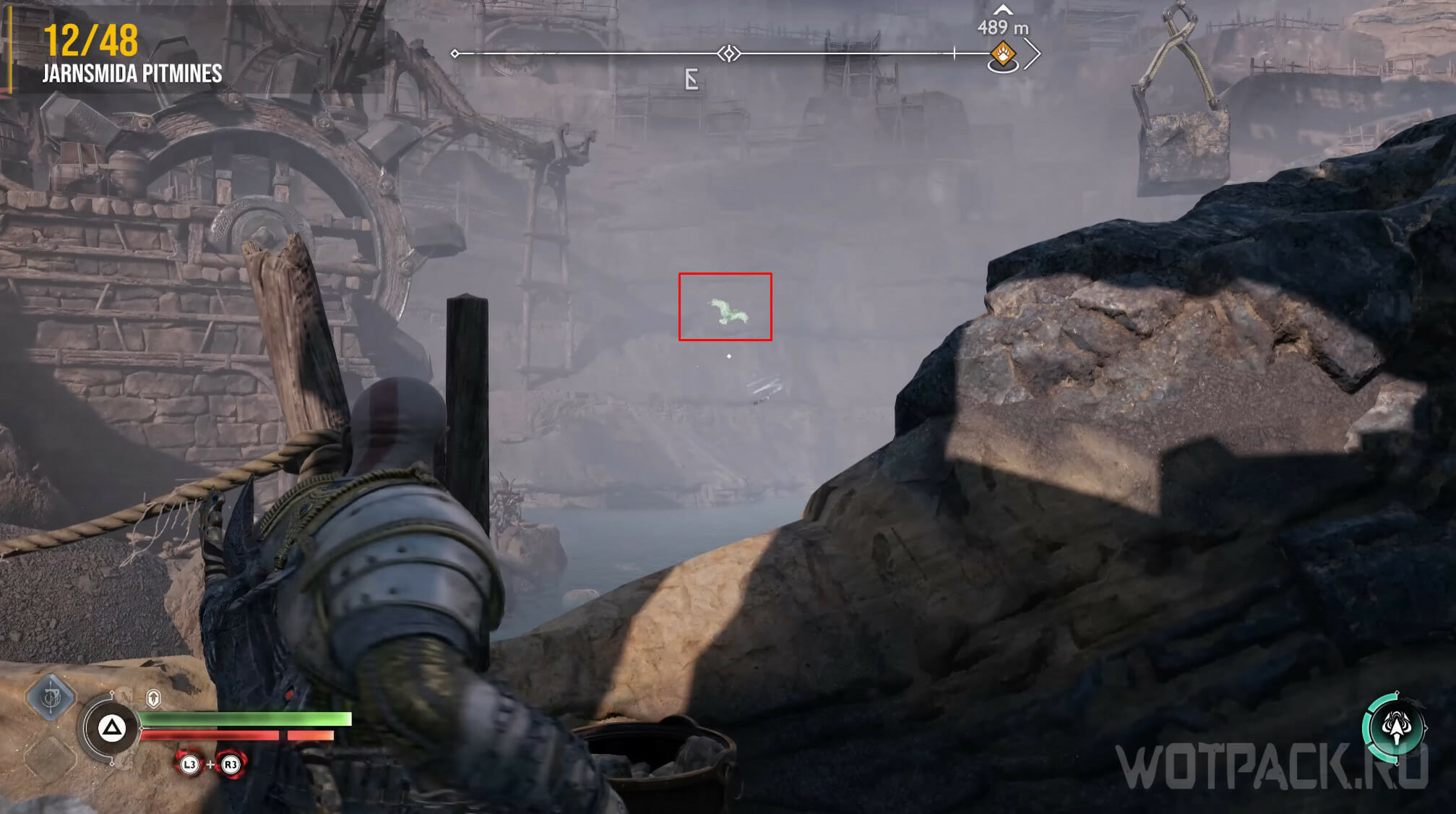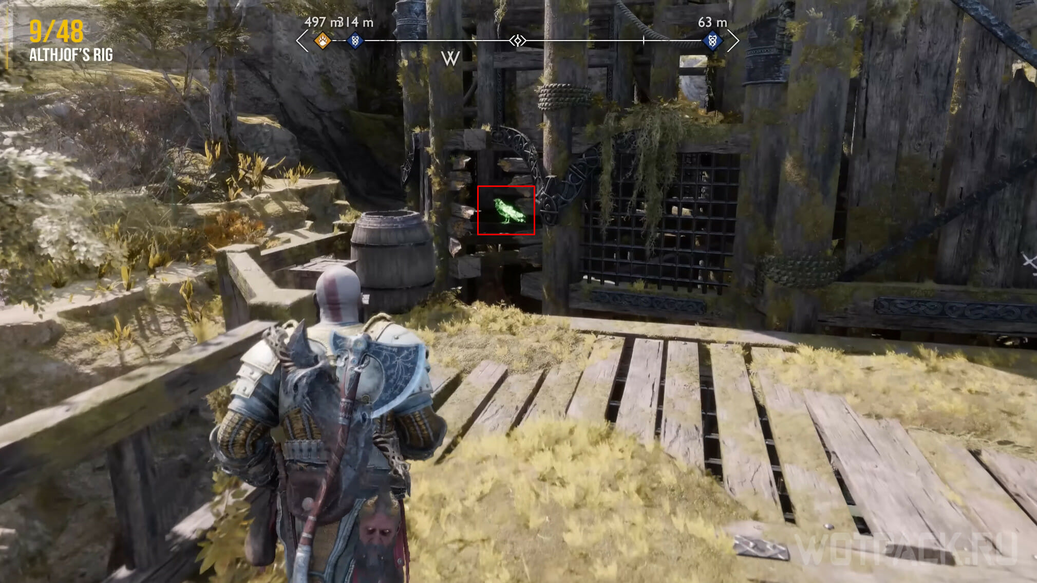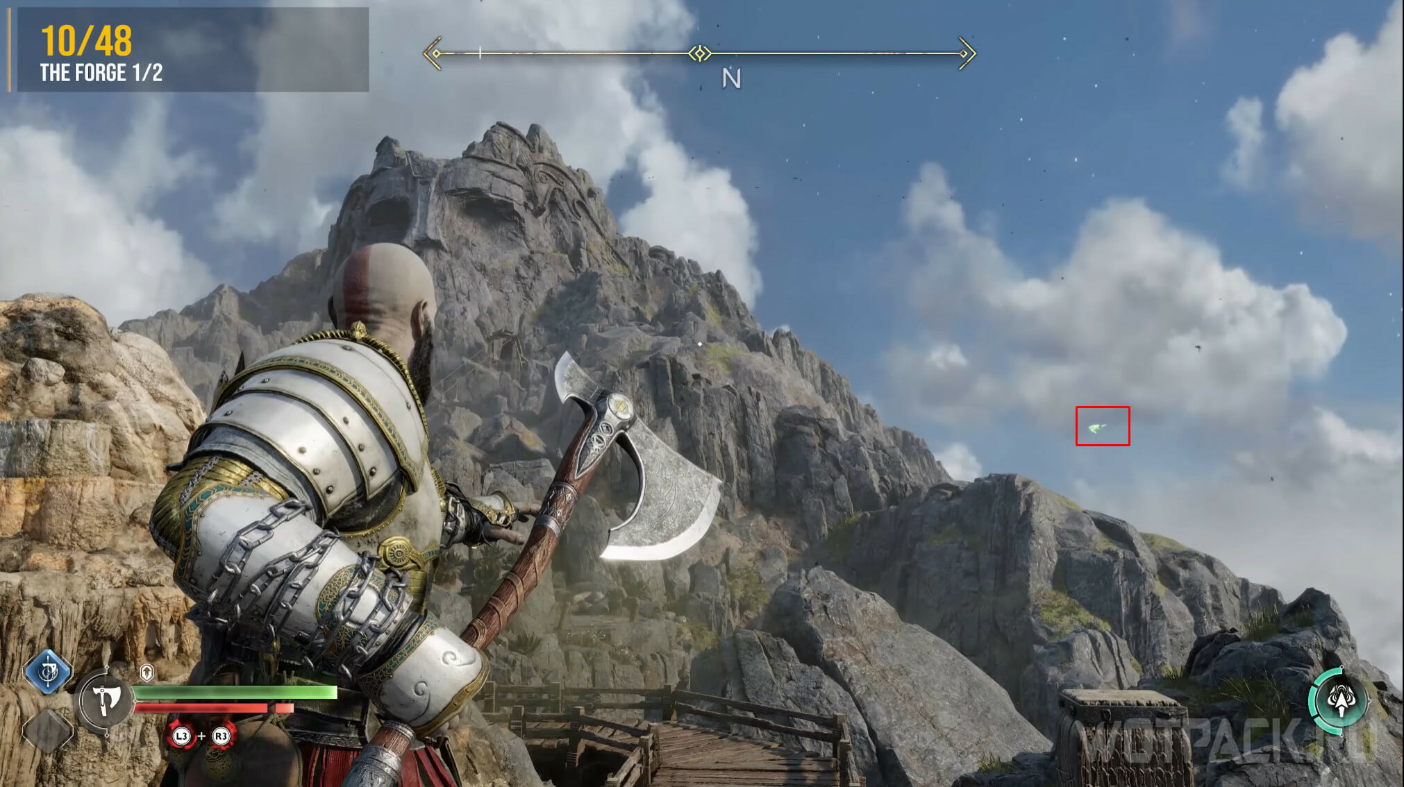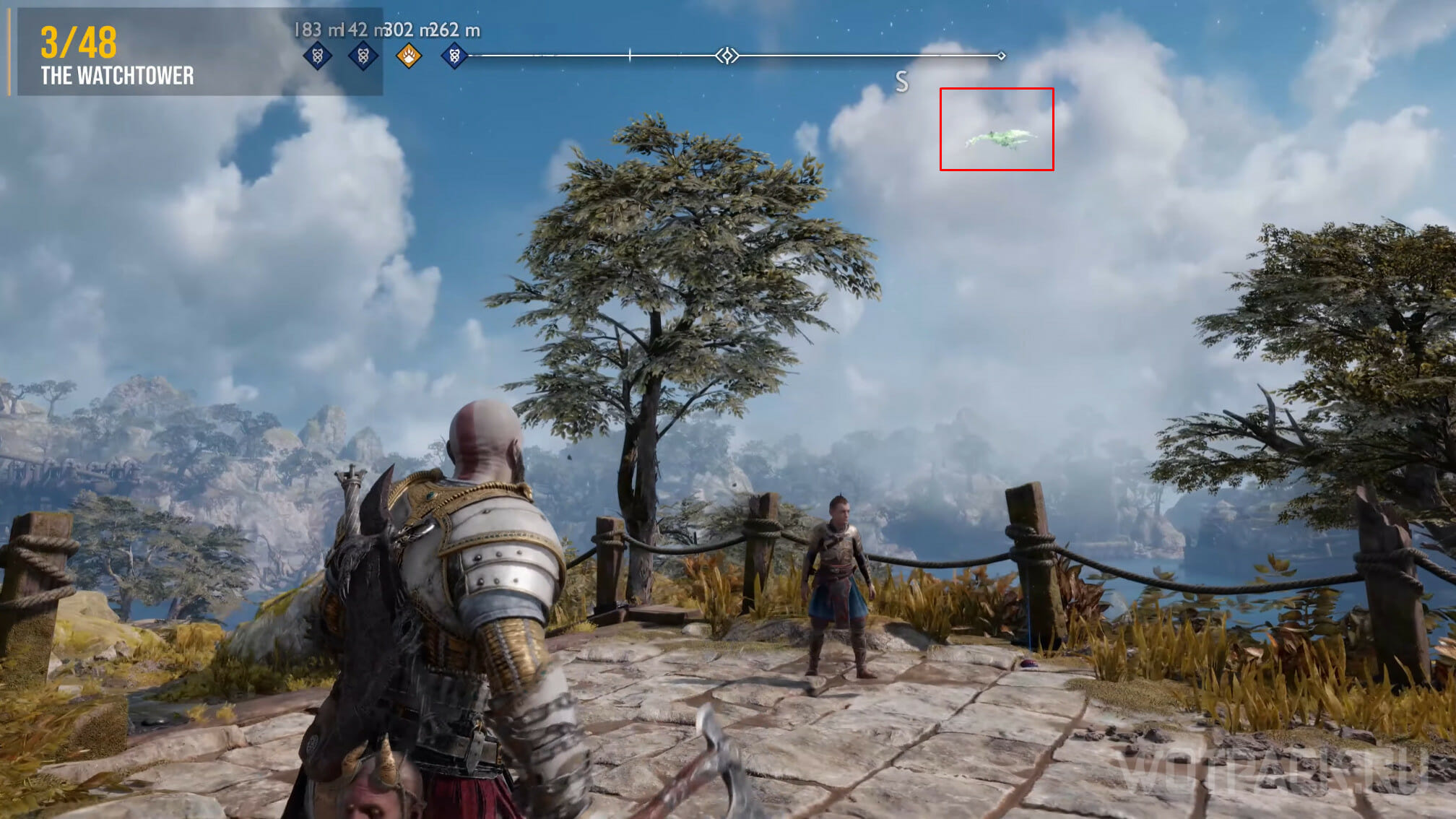 Найдите возвышенность в центре, через которую Кратос проходил по сюжету. Здесь же есть сундук Норн. Спрыгните слева и посмотрите за забор: там летает птица.