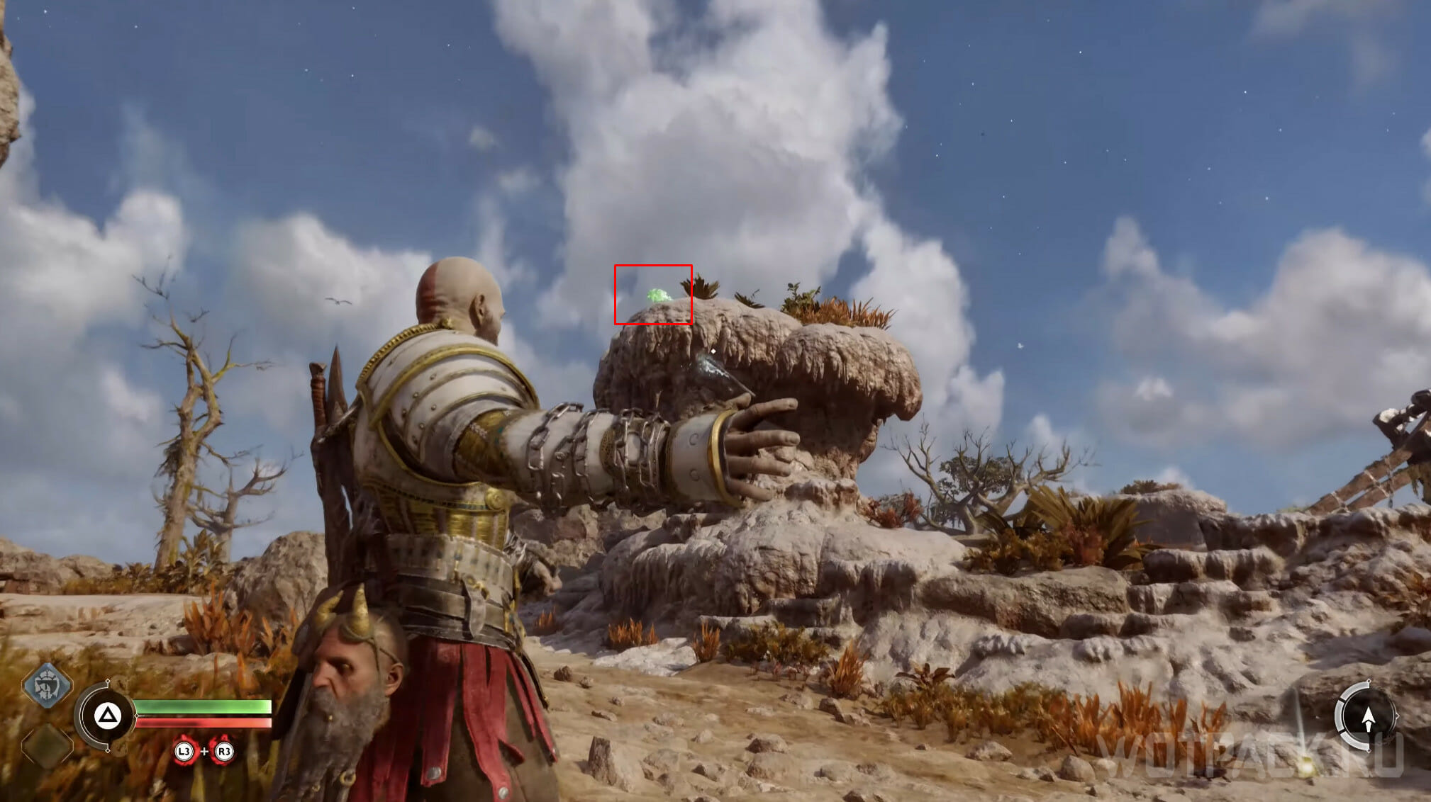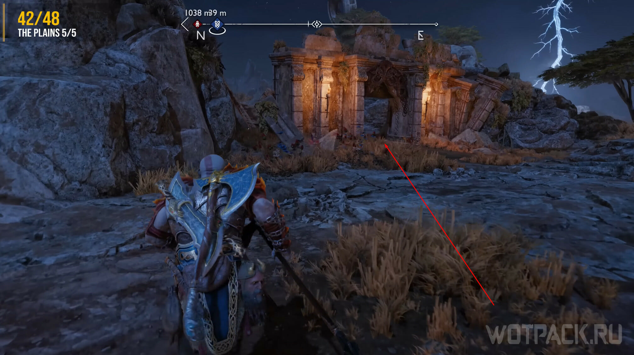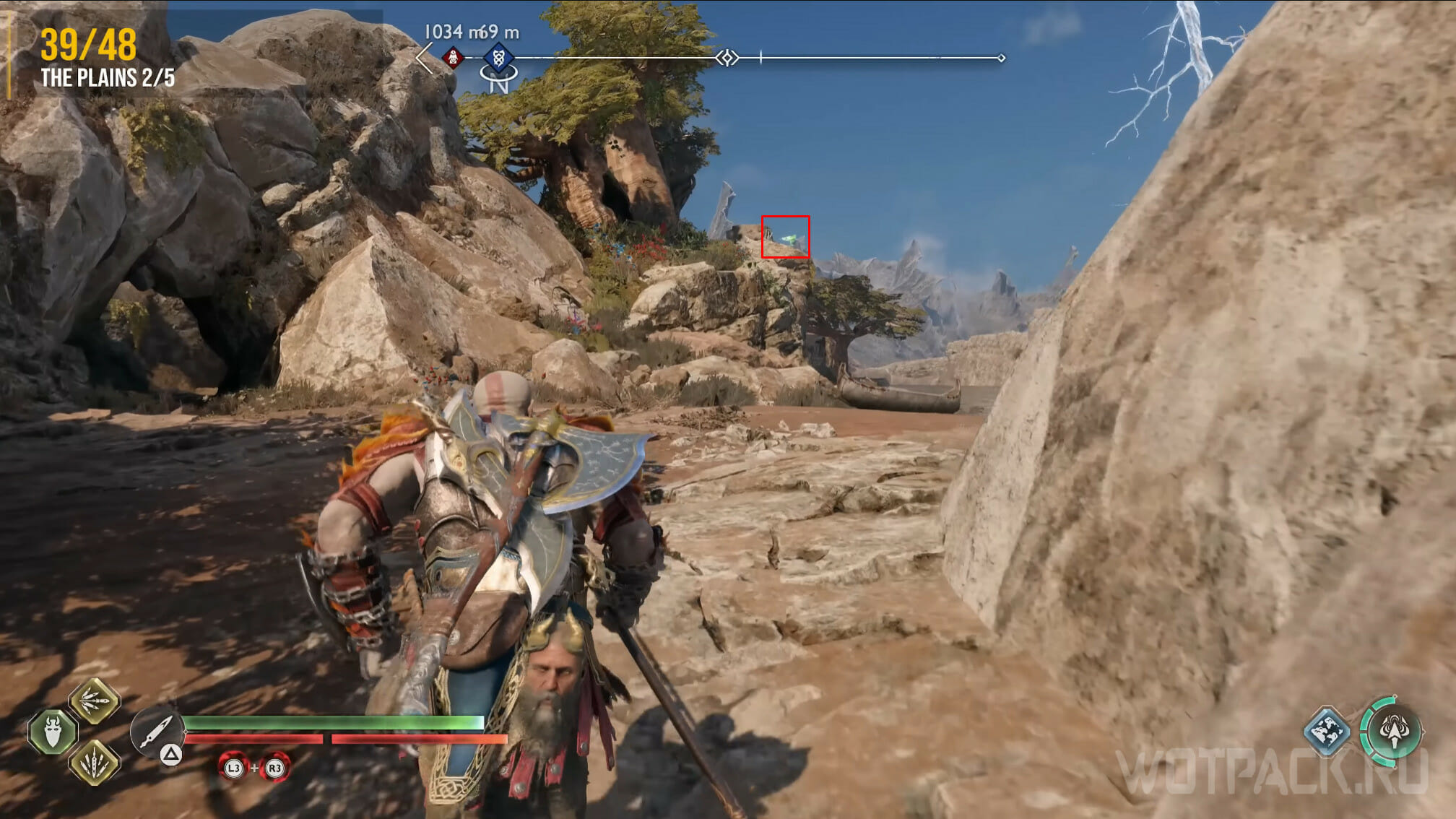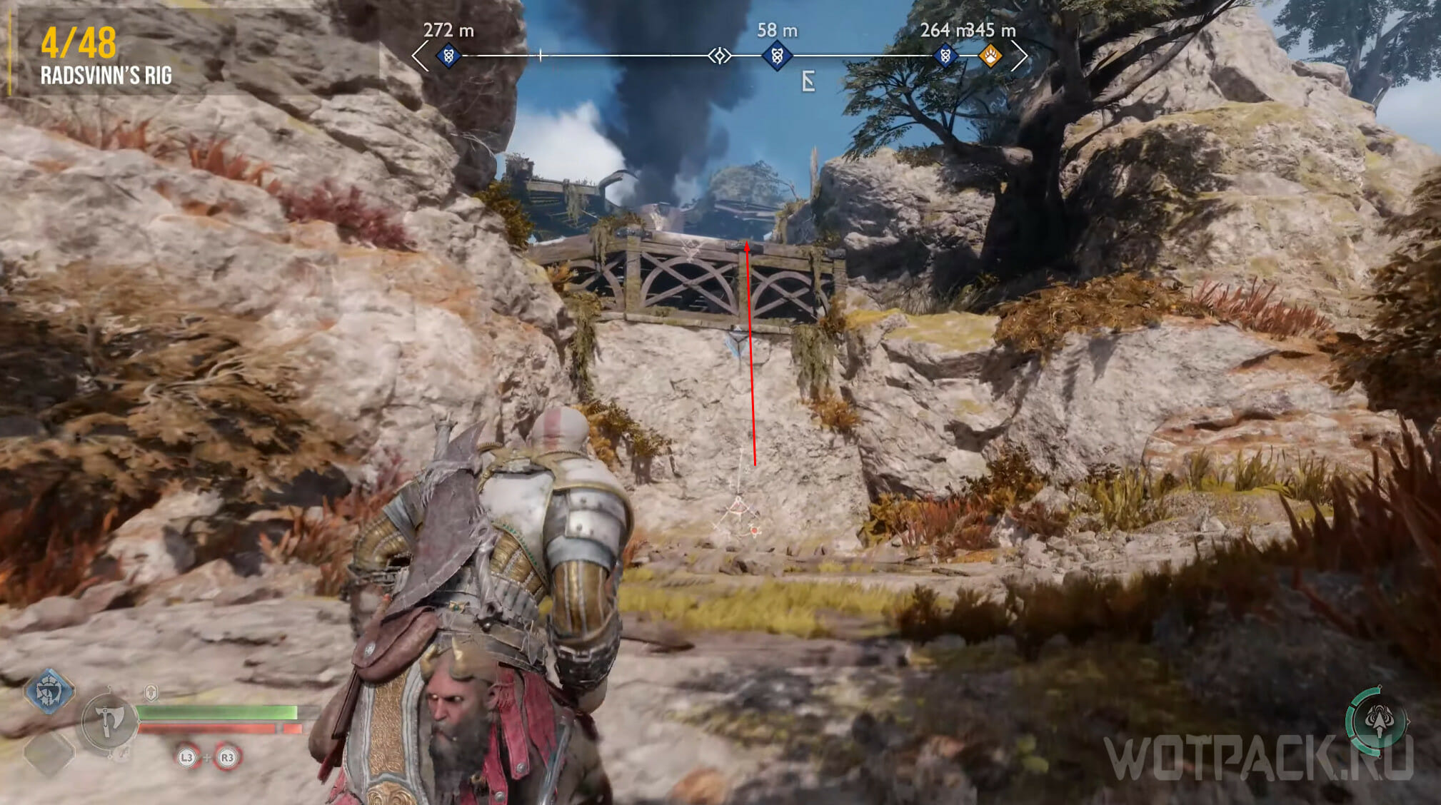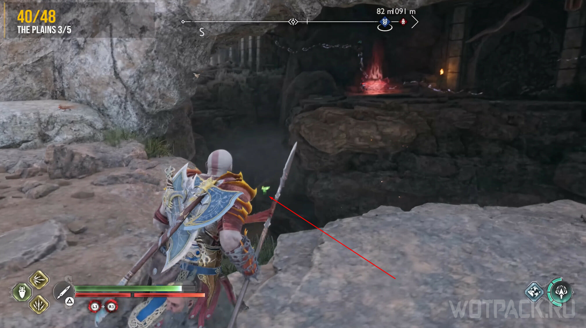Найдите возвышенность в центре, через которую Кратос проходил по сюжету. Здесь же есть сундук Норн. Спрыгните слева и посмотрите за забор: там летает птица.