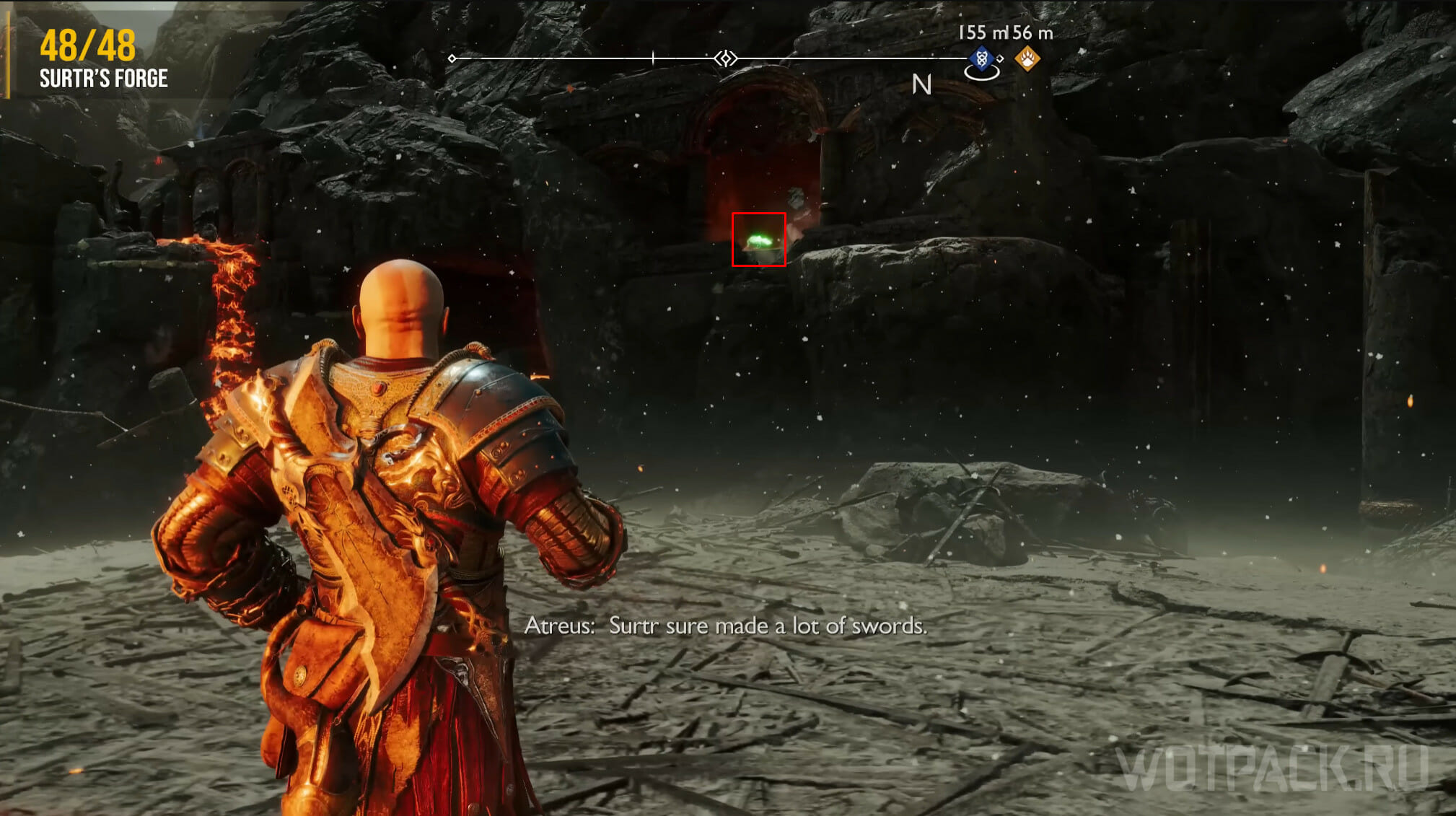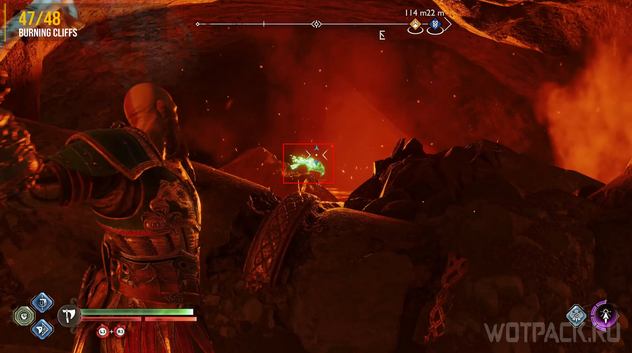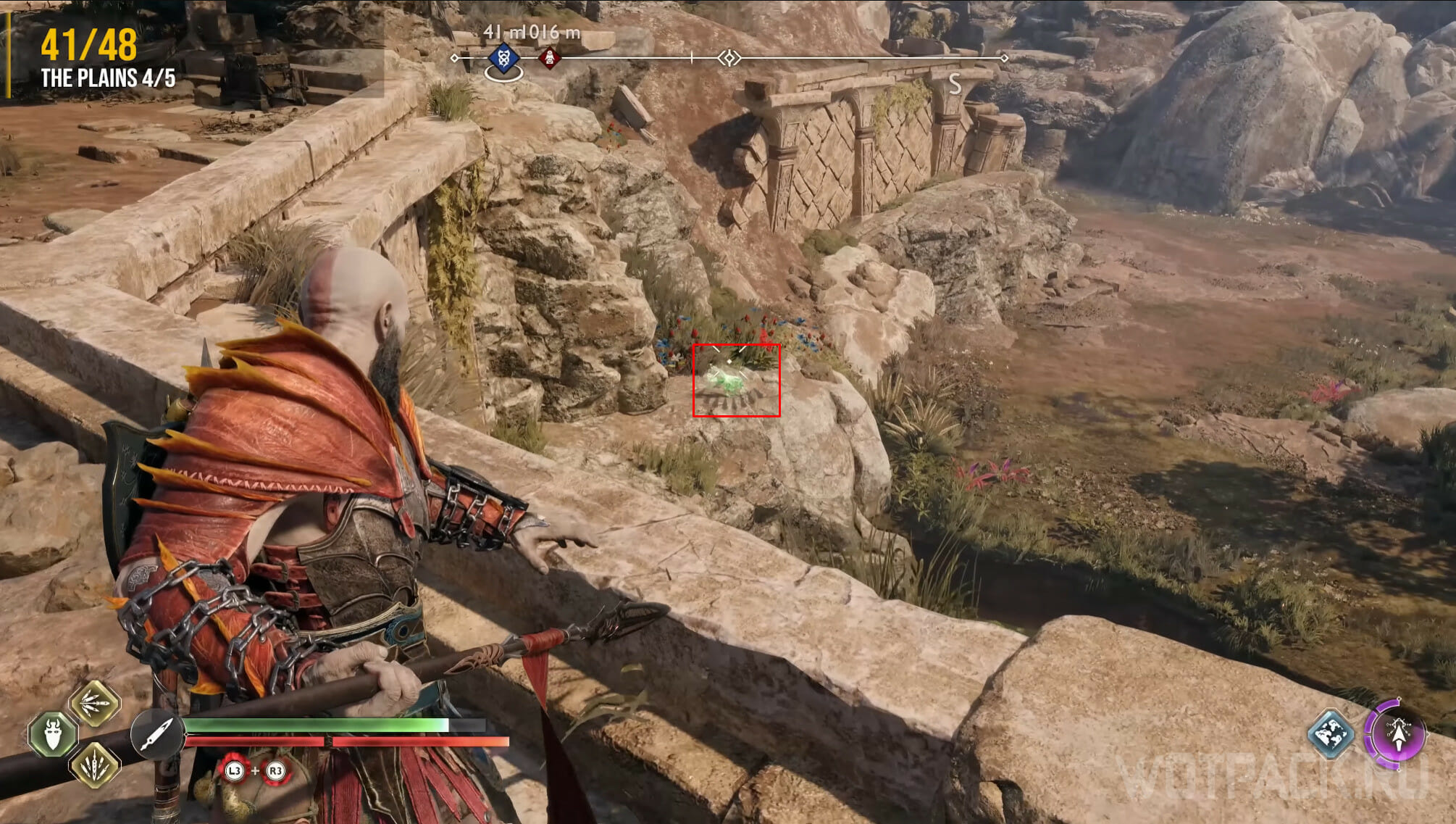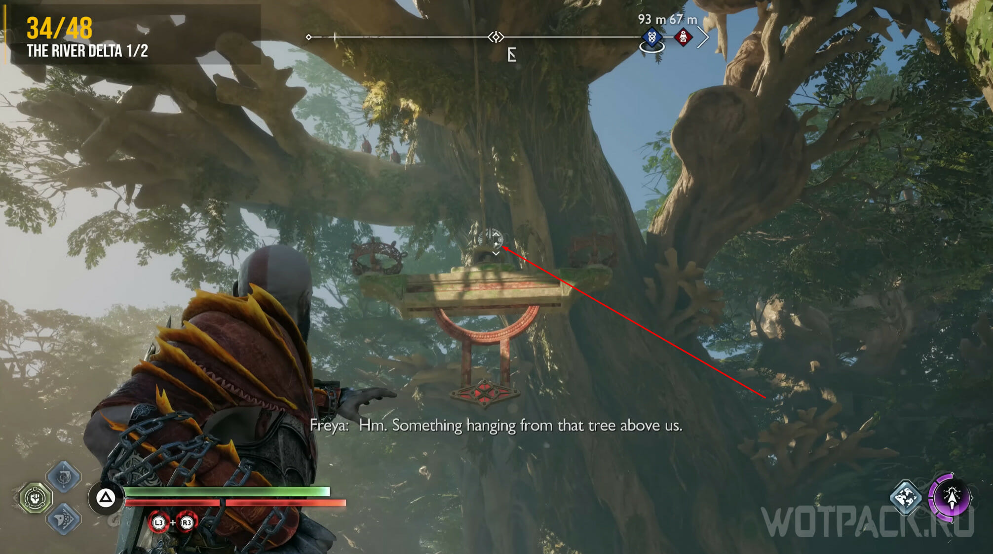 Найдите возвышенность в центре, через которую Кратос проходил по сюжету. Здесь же есть сундук Норн. Спрыгните слева и посмотрите за забор: там летает птица.