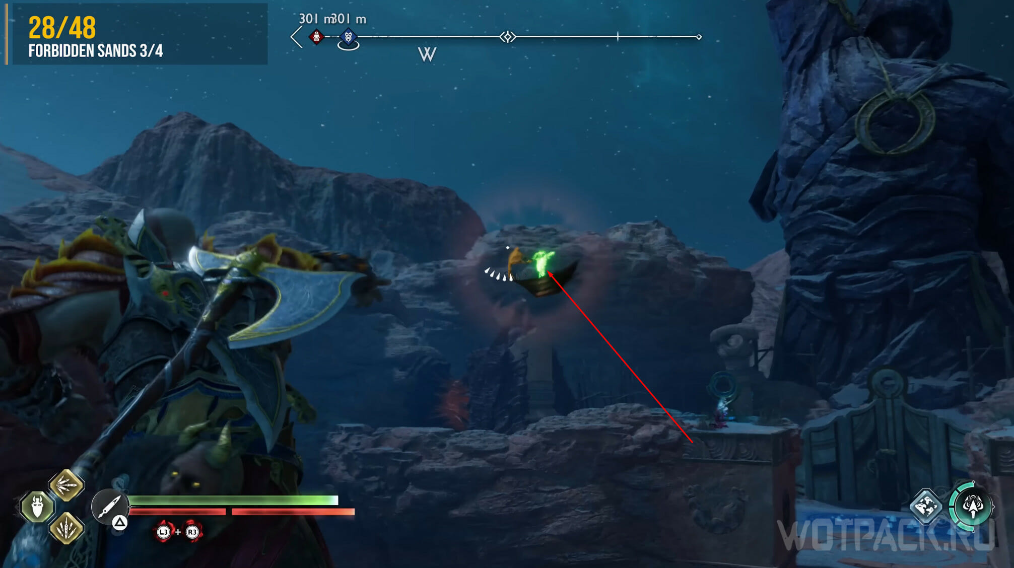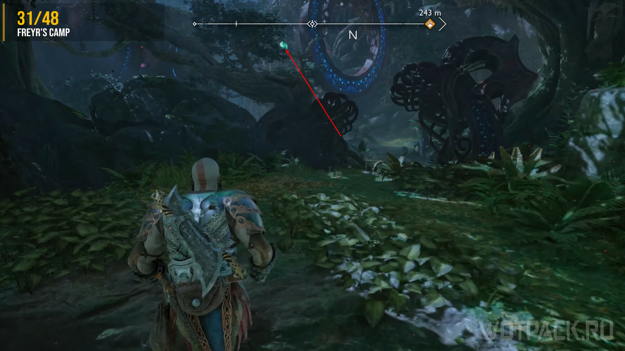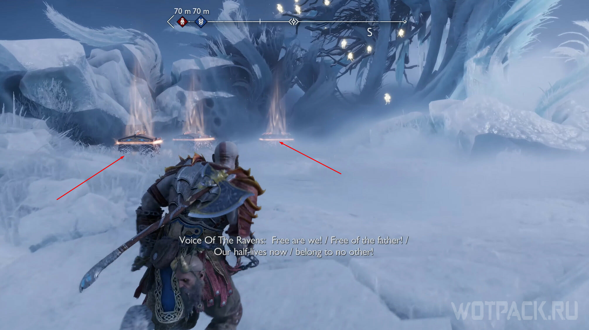 Как только откроете все шесть сундуков, появится Хранитель Воронов, которого потребуется убить для завершения просьбы «Глаза Одина». Бегите в сторону Мистических врат и сверните на арену, находящуюся справа.