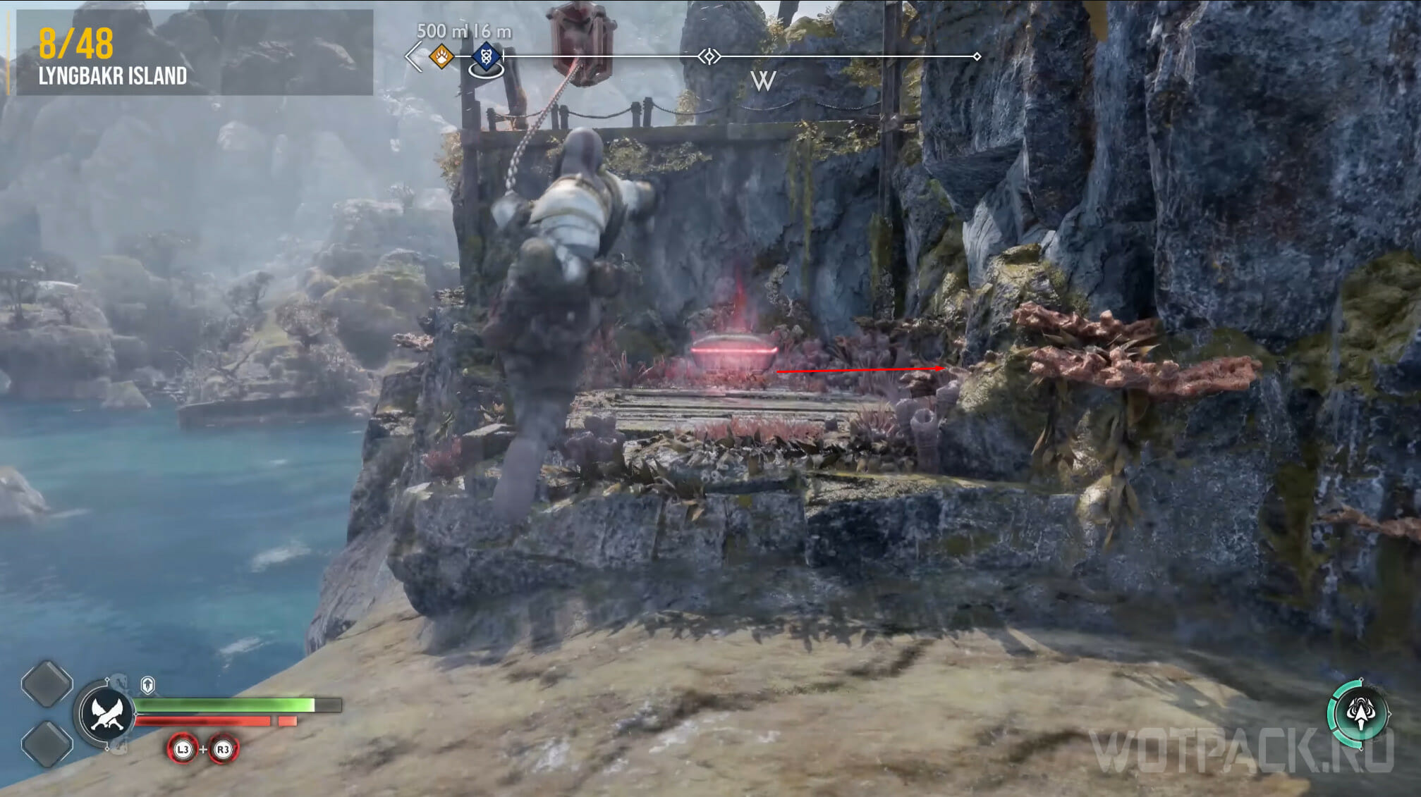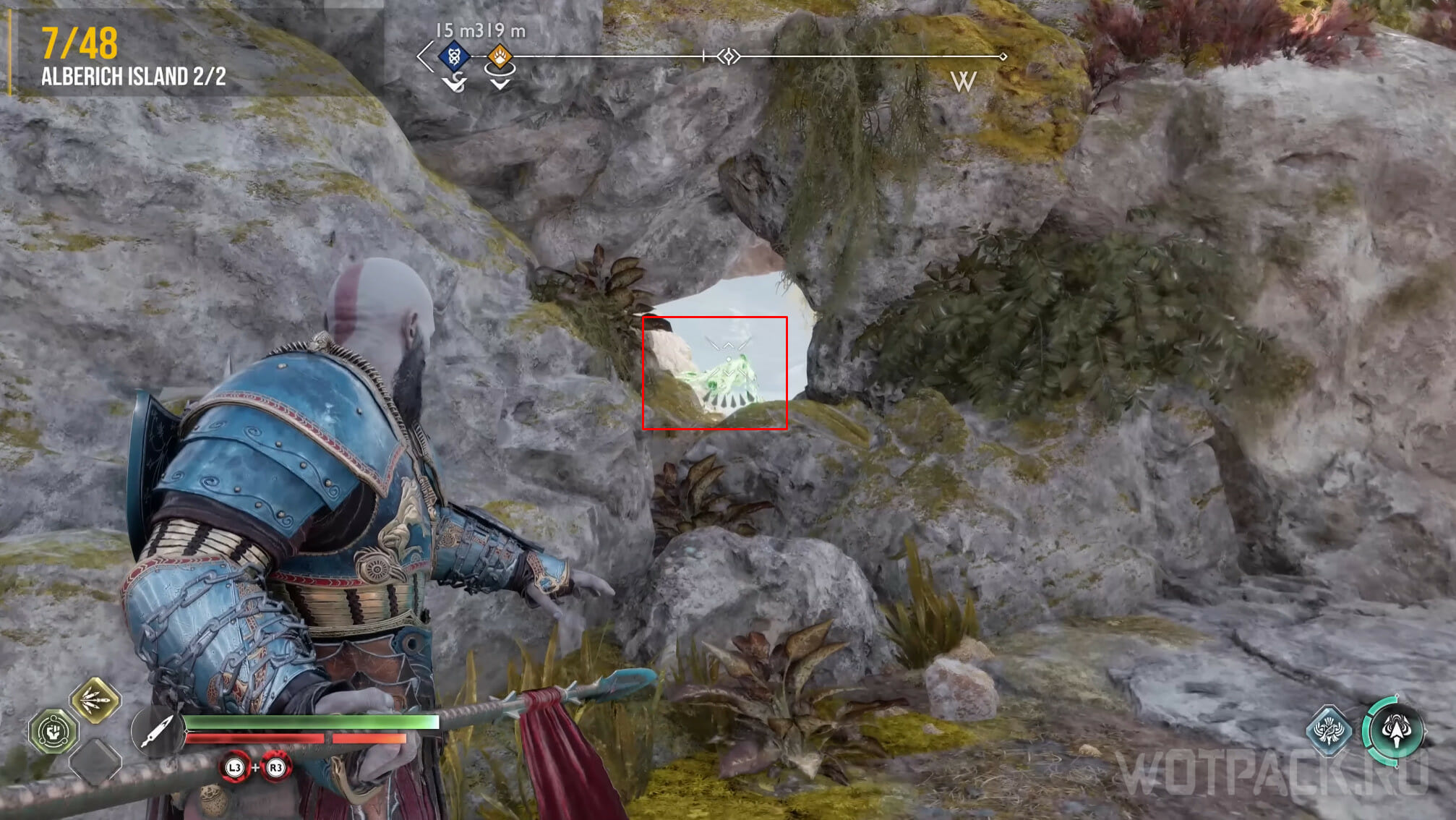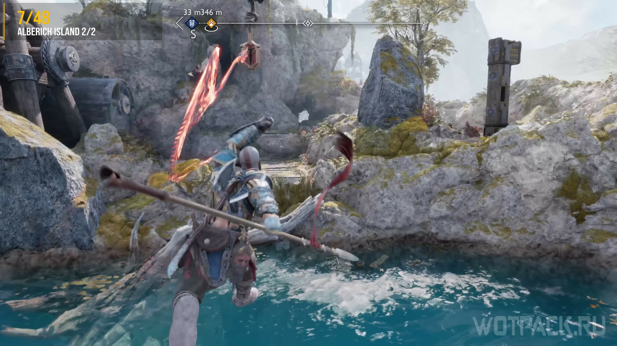 На Острове Альбериха есть еще один ворон. Не отходите далеко от места, где уничтожили предыдущего. Пройдите вниз и метните копье, чтобы взорвать камень. Вернитесь наверх, пройдите под конструкцией и переберитесь через деревянный помост на другую сторону реки.