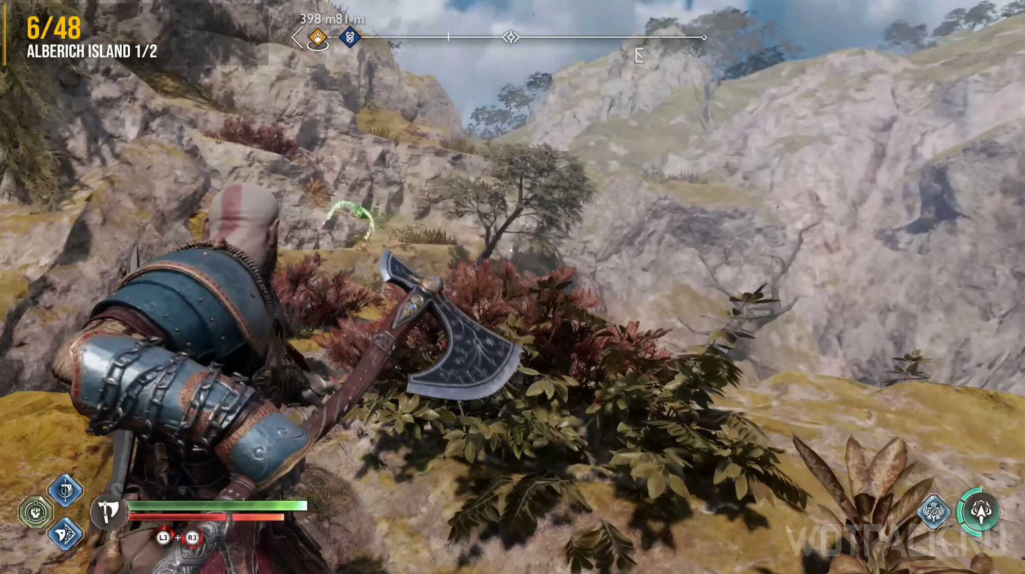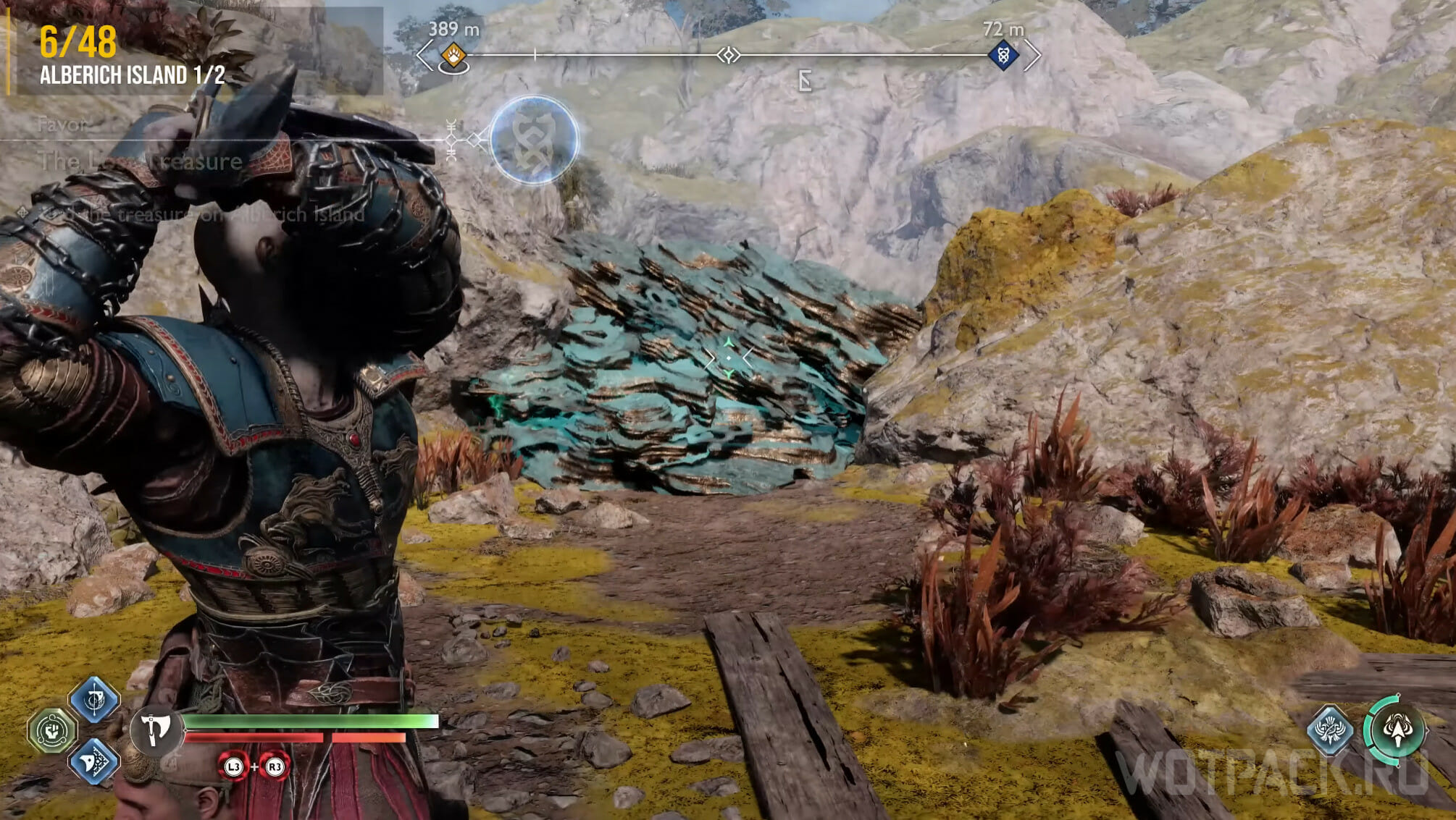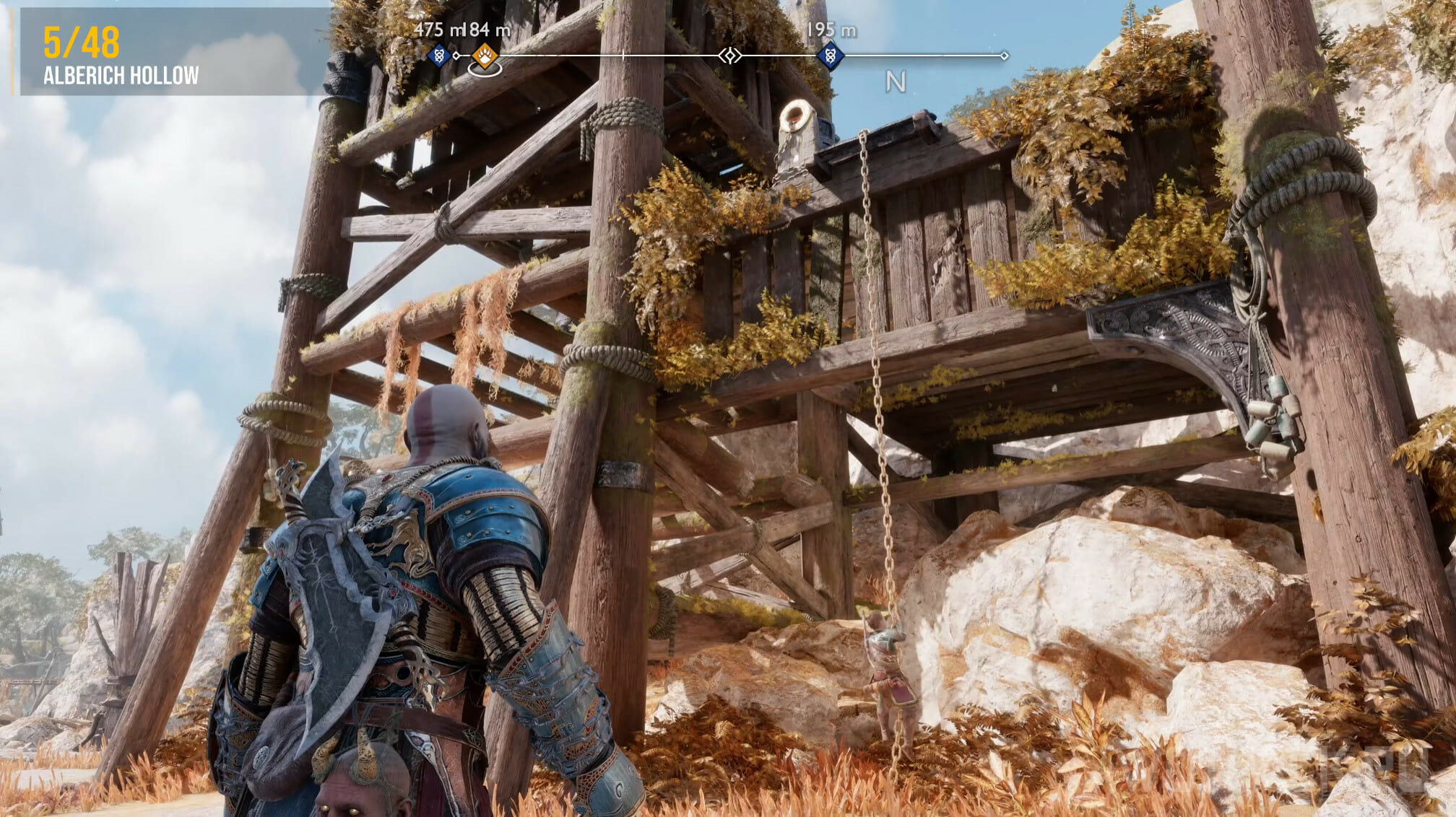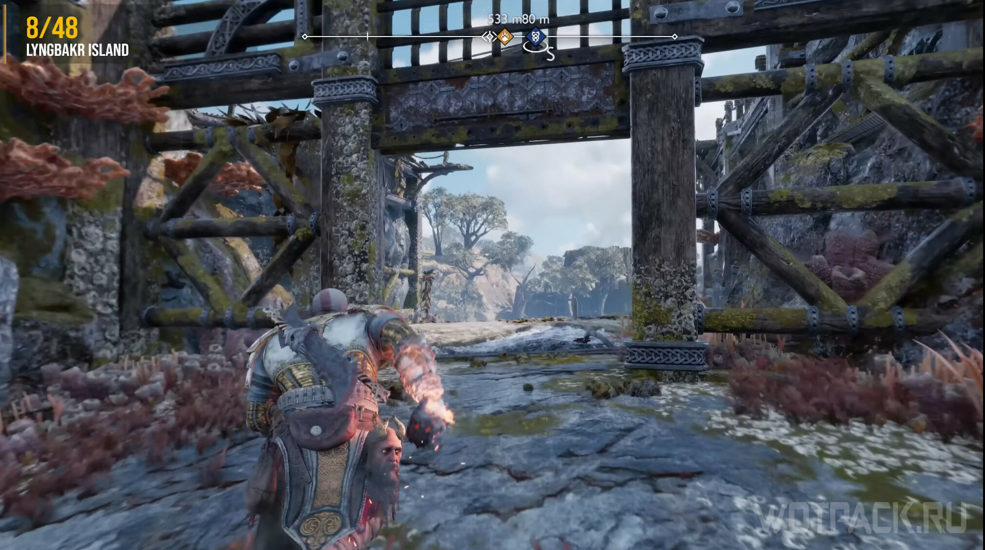 На Острове Альбериха есть еще один ворон. Не отходите далеко от места, где уничтожили предыдущего. Пройдите вниз и метните копье, чтобы взорвать камень. Вернитесь наверх, пройдите под конструкцией и переберитесь через деревянный помост на другую сторону реки.