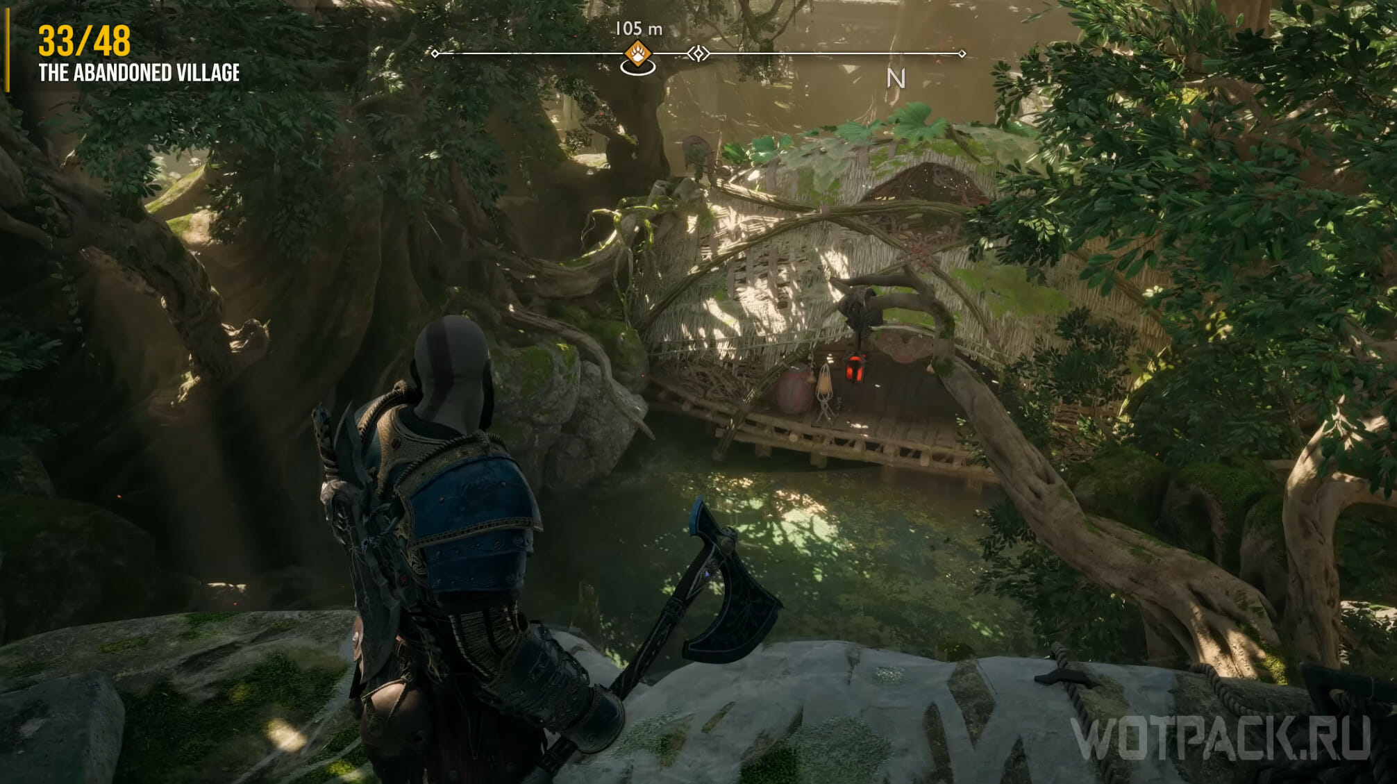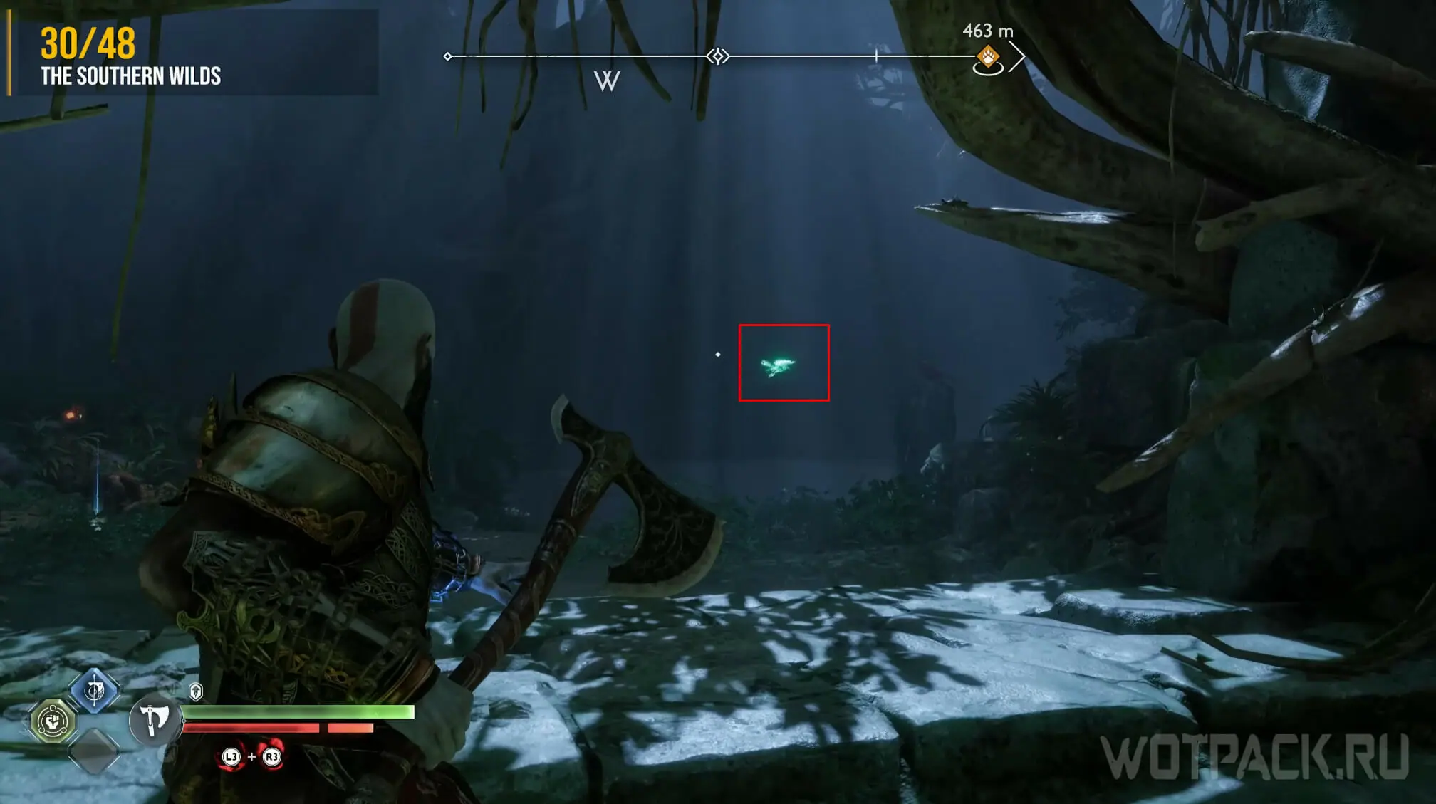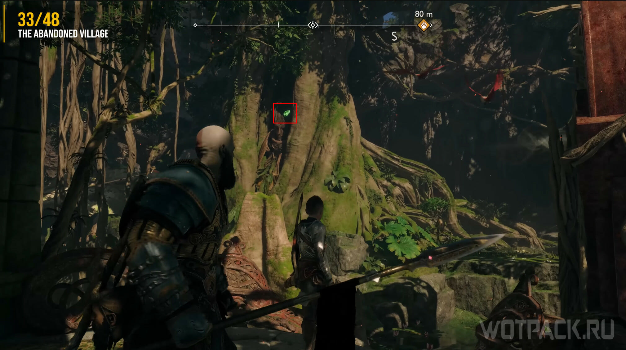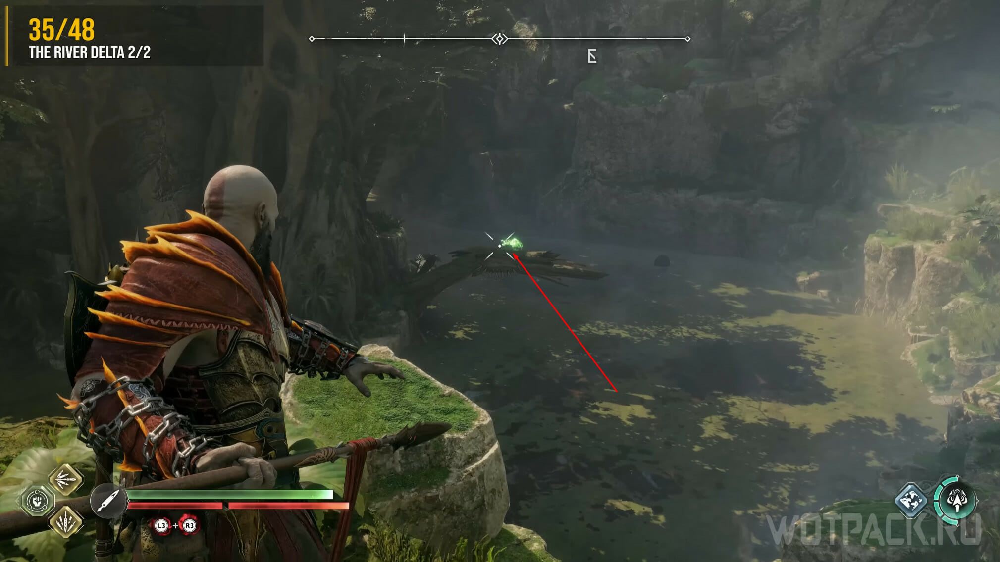 Как только выйдете на берег, сверните направо. Найдите угол, сделанный из дерева, метните в отверстие копье и заберитесь наверх. Пройдите по тропе, пока не обнаружите слева зеленую преграду. Уничтожьте ее и пройдите прямо. Встаньте, как показано на скриншоте, и ждите, пока пролетит ворон.