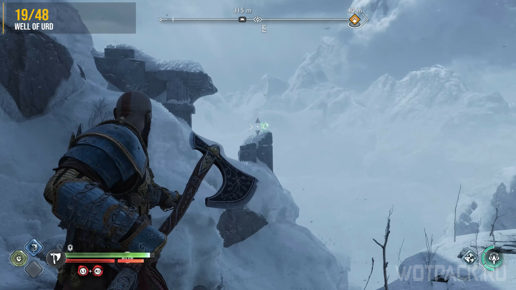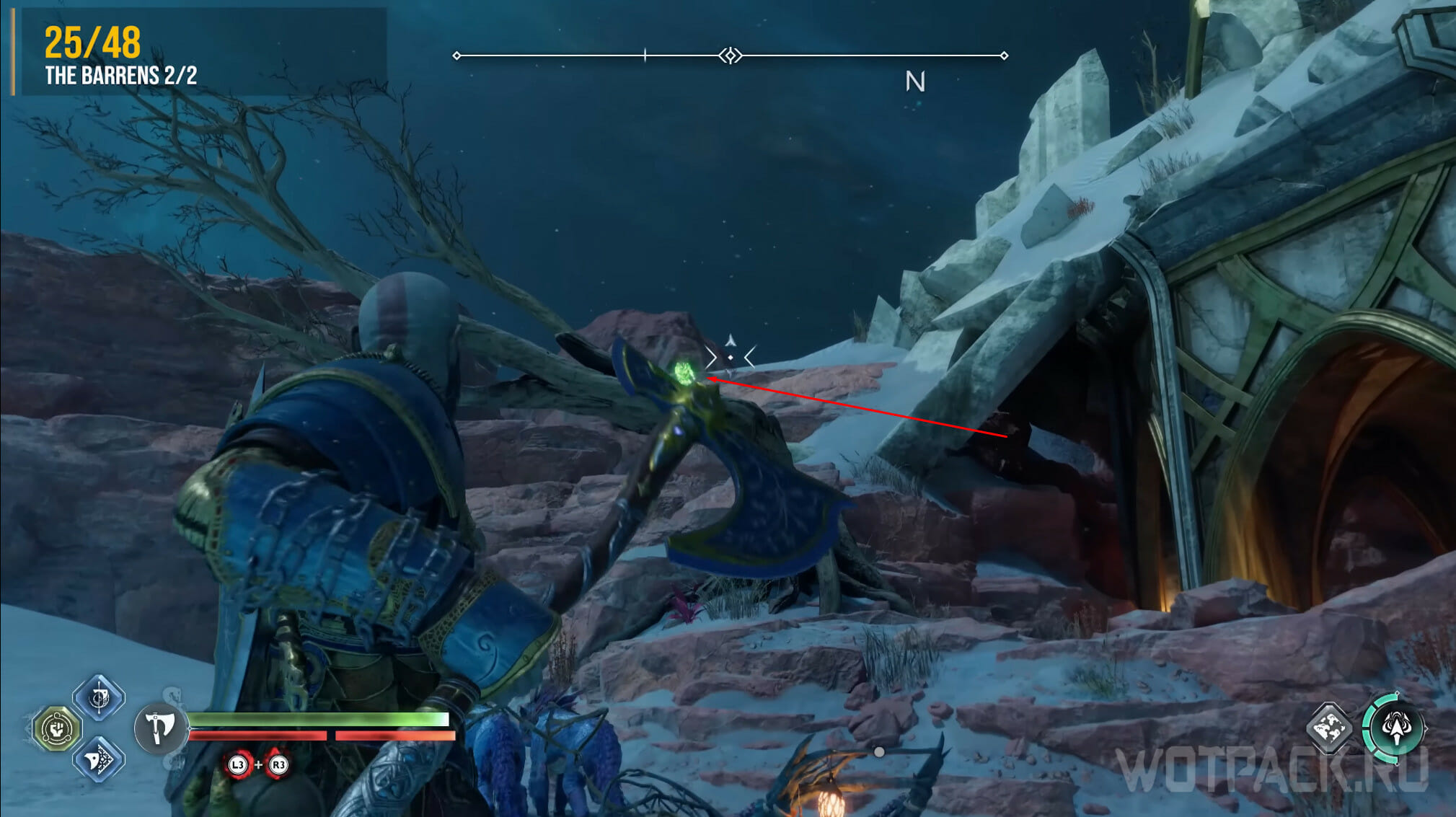 От места, где тормозит подъемник, пройдите в пещеру, протиснитесь в тонкий проем и выйдите наружу. Слева, на одной из скал сидит ворон. Подойдите поближе и метните топор.