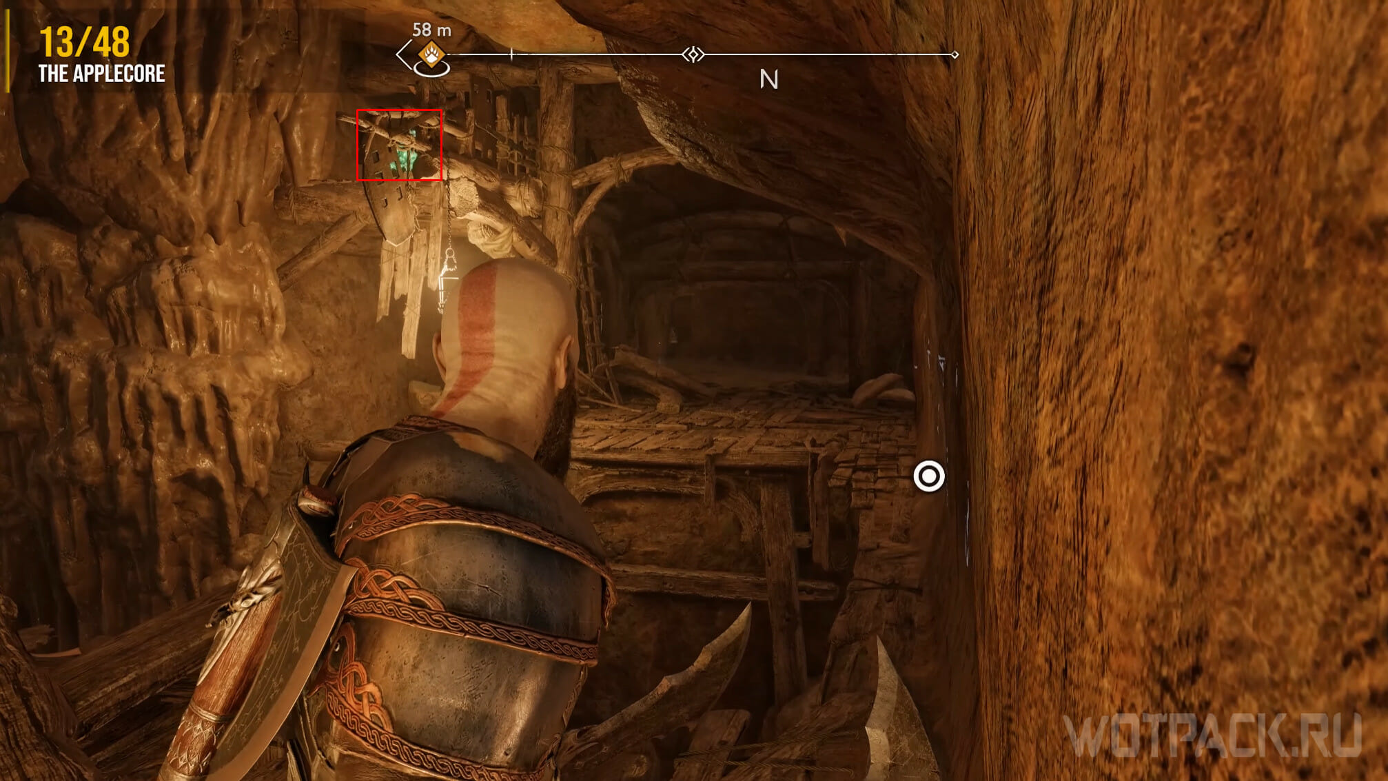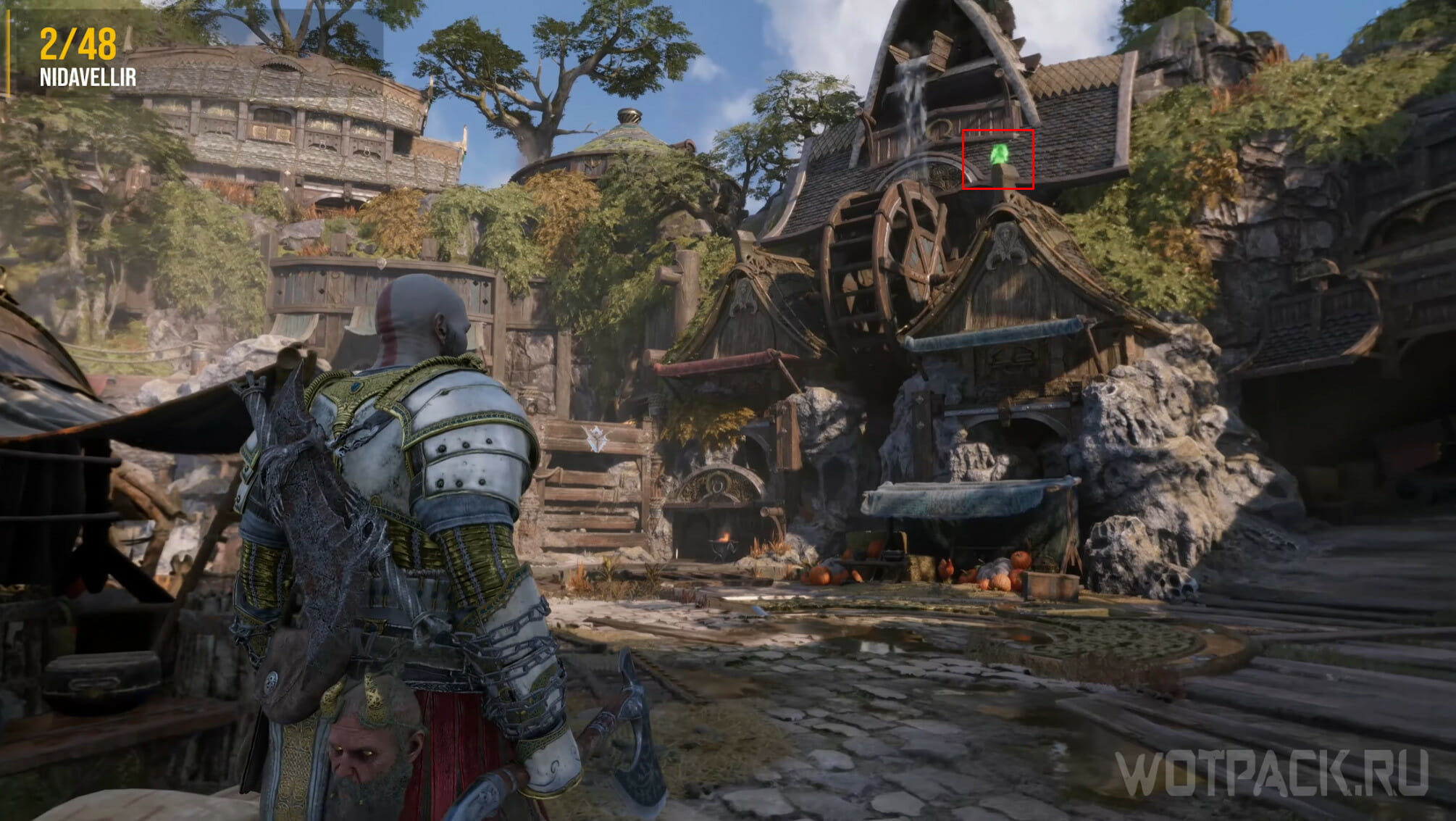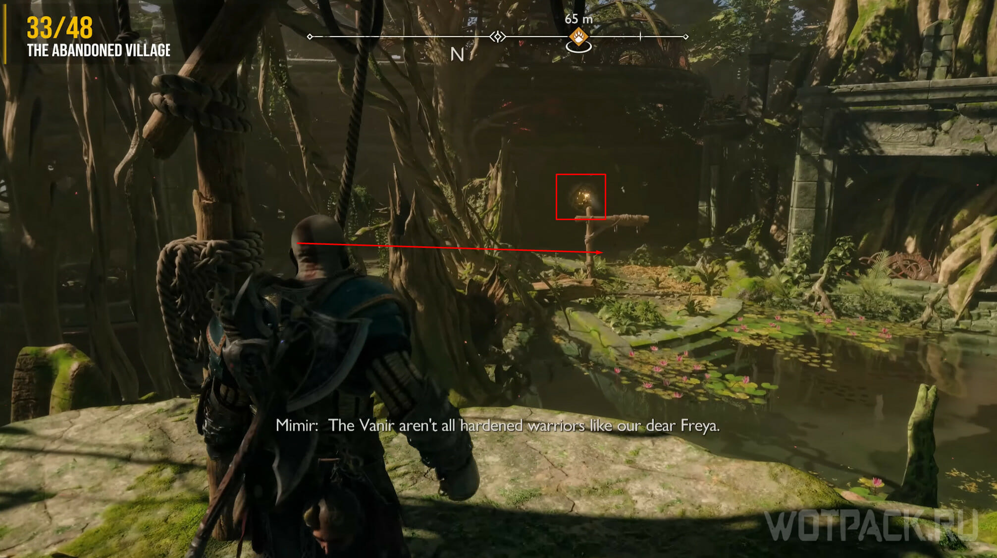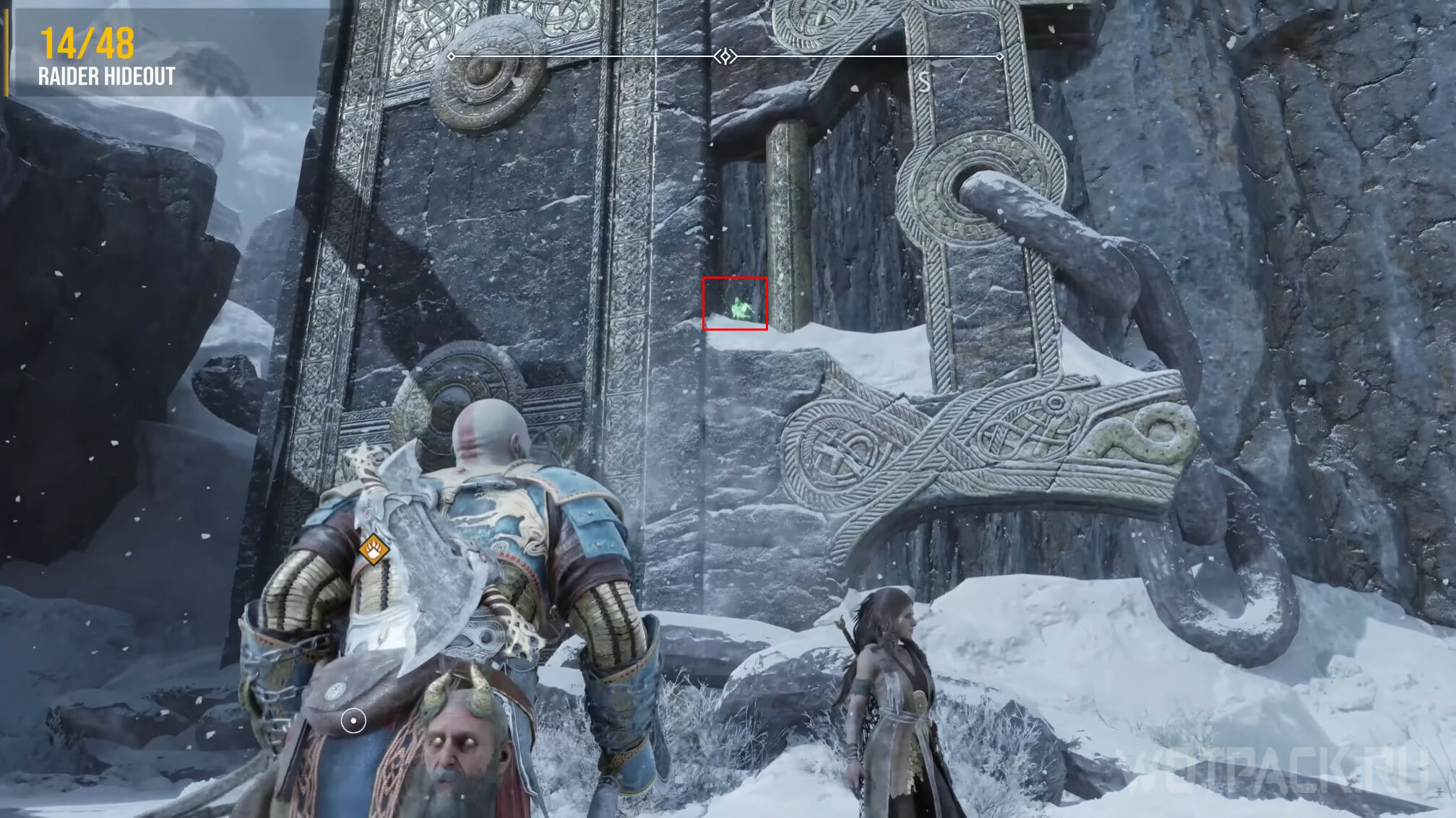 Проходя локацию, нужно добраться до момента, когда Атрей выстрелит в камень, чтобы изменить направление воды и переправить Кратоса на другую сторону. Сойдя с платформы, пройдите мимо двери прямо и, дойдя до стены, посмотрите налево. На деревянной балке сидит слуга Одина.