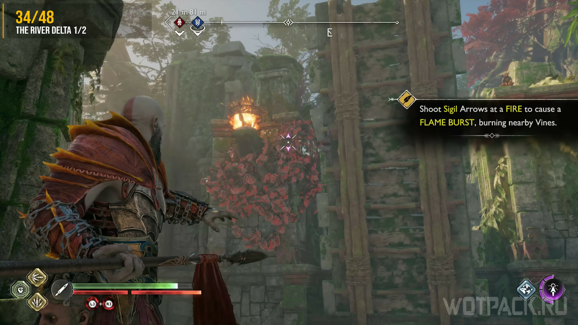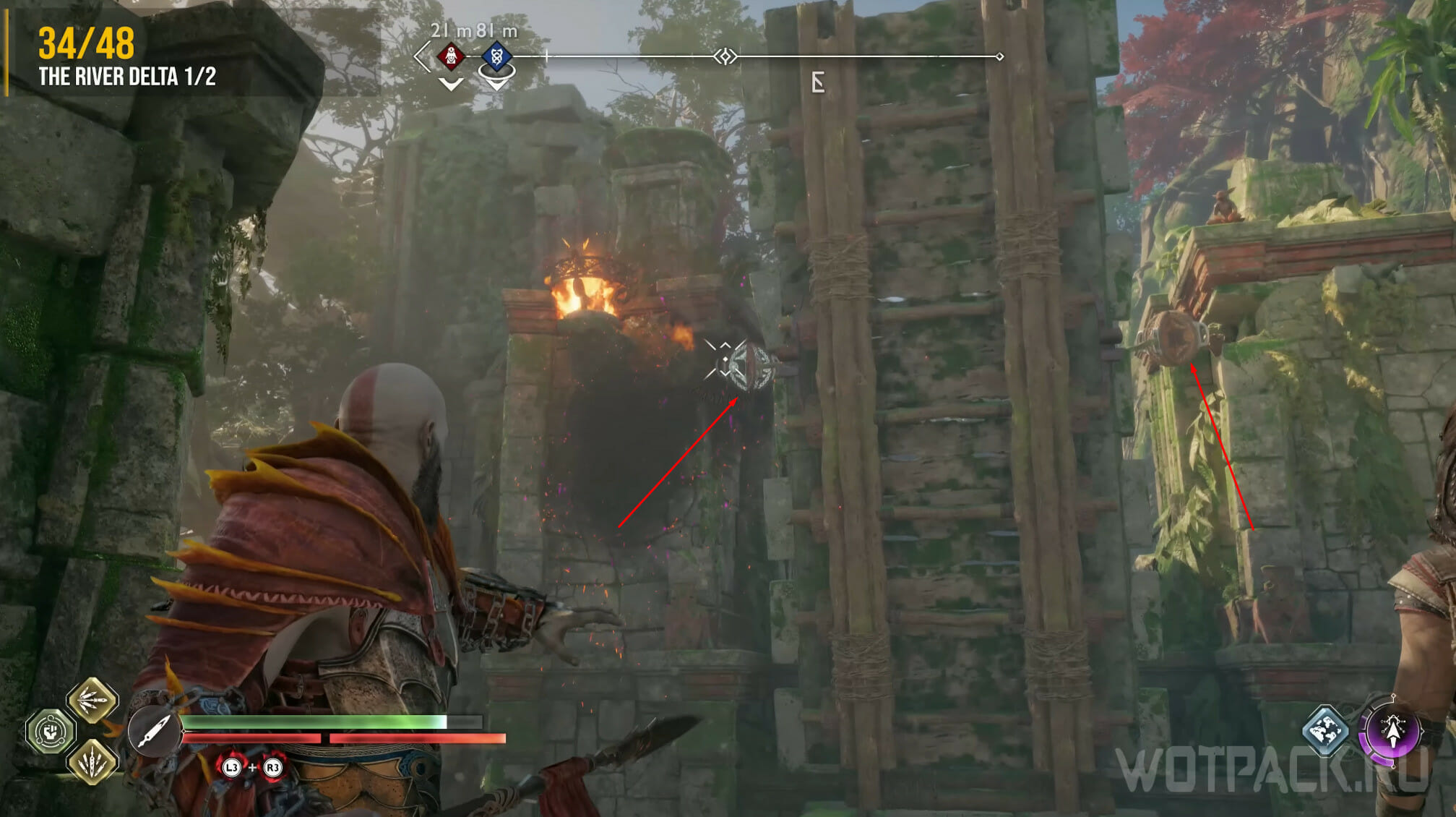 Теперь раскачайте подвес снова: жаровня передаст пламя на факел, расположенный на арке. Попросите напарника выстрелить в него фиолетовой стрелой, чтобы сжечь красную лозу. Когда растение догорит, сломайте печать и перейдите по мосту.