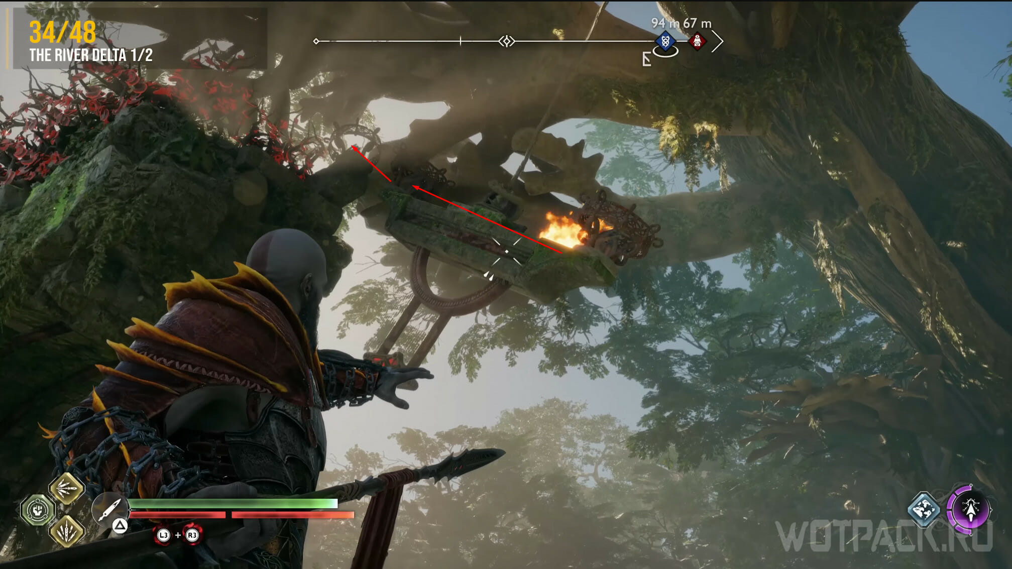 Пройдите чуть дальше и посмотрите направо. Бросьте оружие в печать, удерживающую подвес. В момент, когда конструкция приблизится к Кратосу, зацепитесь за нее. Подвес начнет качаться влево-вправо: когда правая жаровня разгорится, попросите выстрелить в механизм фиолетовой стрелой. Выстрелите повторно, чтобы повысить зону поражения, а затем поставьте напарнику метку на первый факел. Таким образом оба факела загорятся.