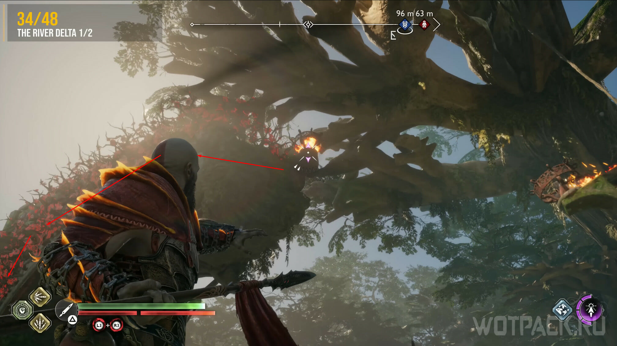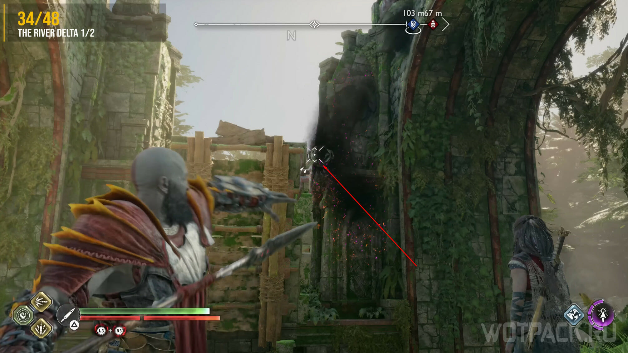 Чтобы успешно добраться до ворона, нужно опустить два моста. Для «активации» первого, попросите спутника выстрелить фиолетовой стрелой в лозу, а затем в факел, чтобы сжечь растение. После этого копьем или топором сломайте обе печати.