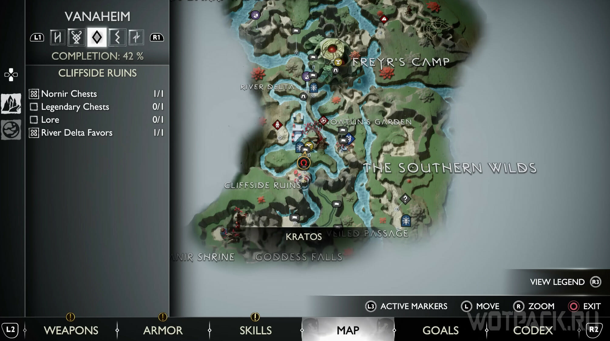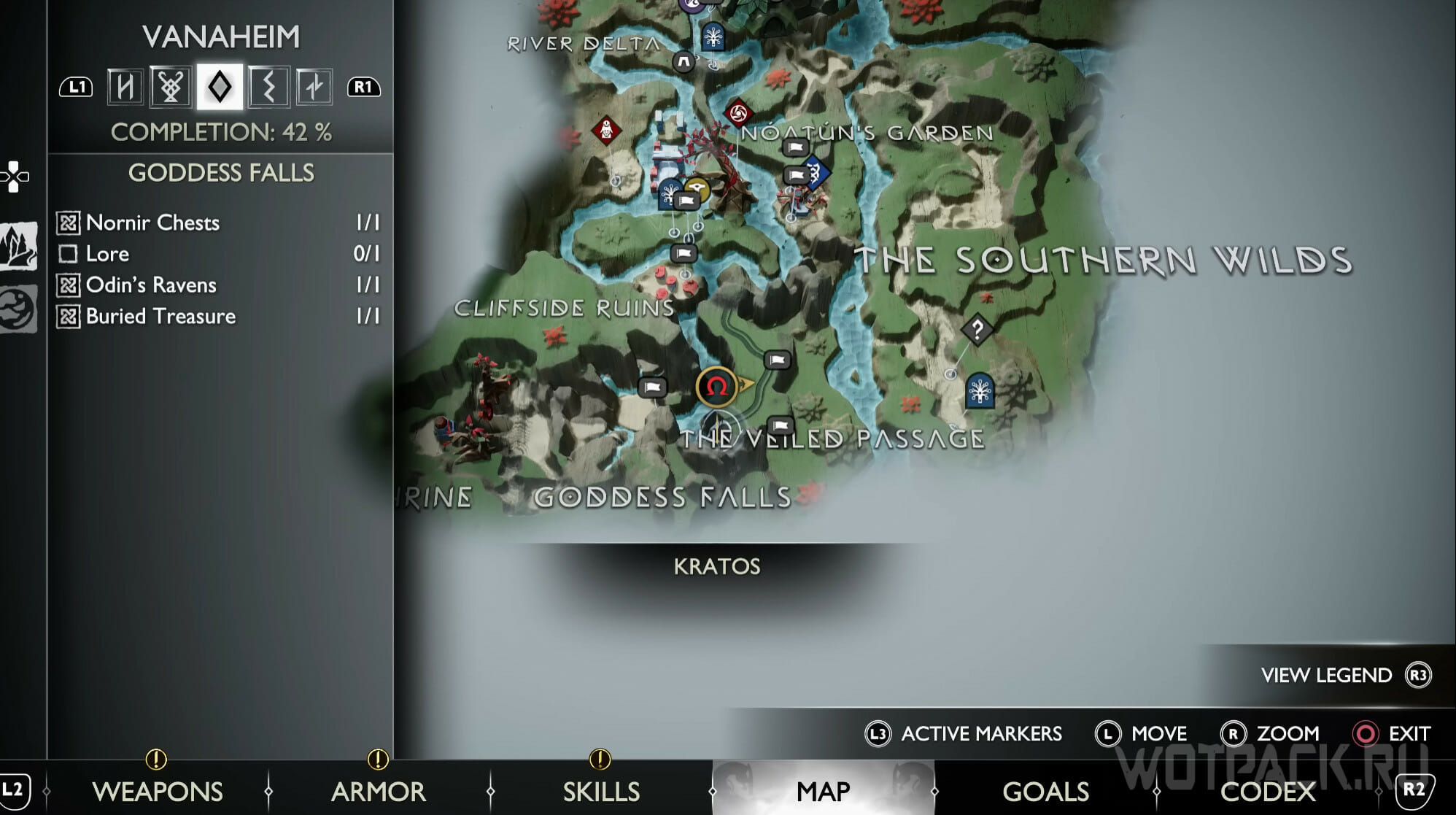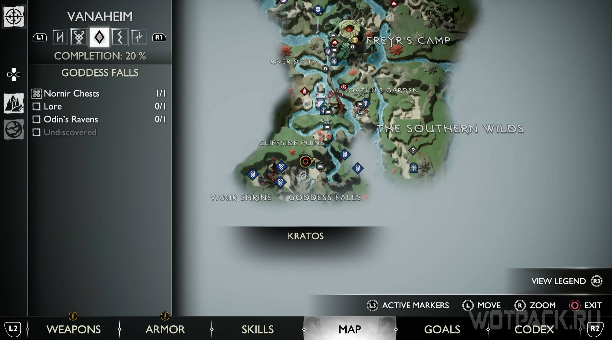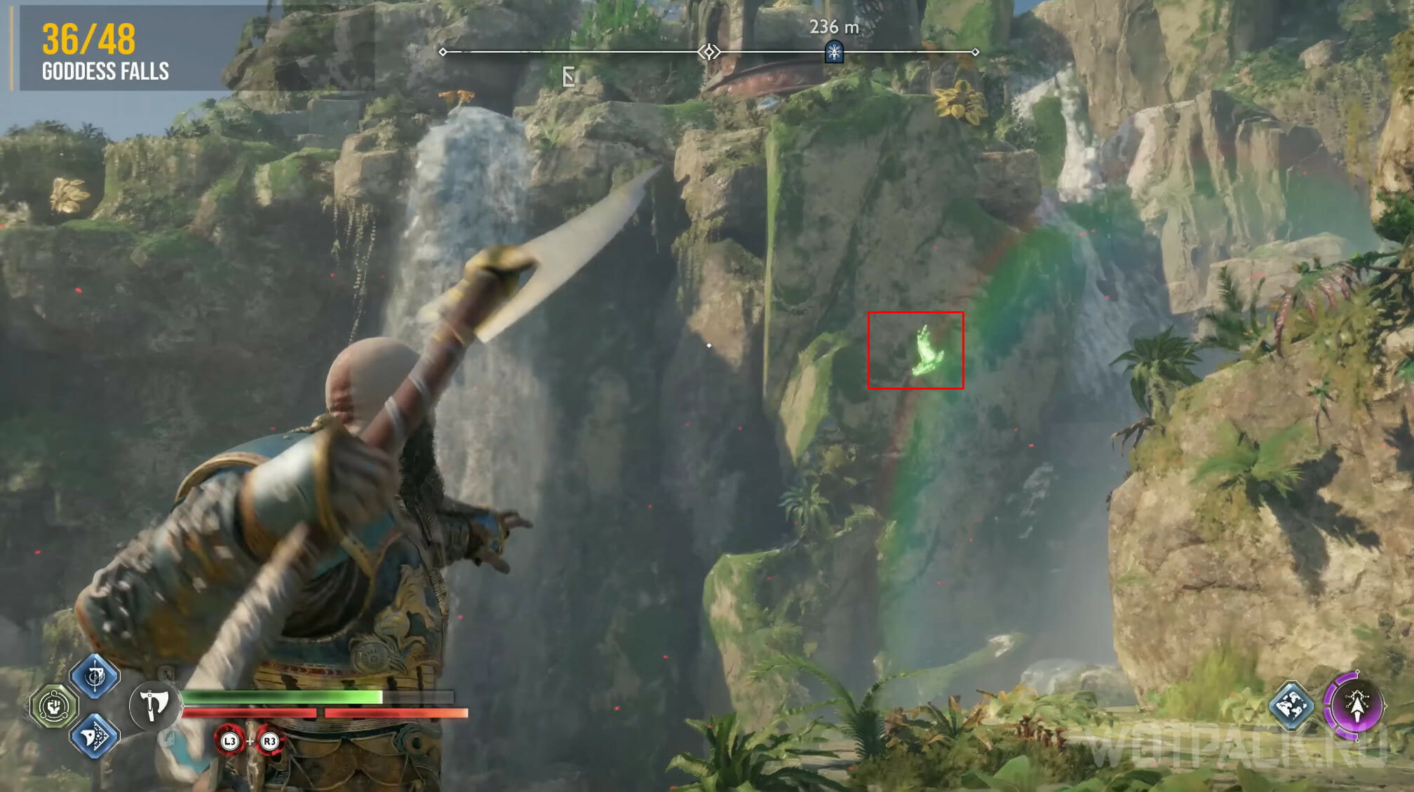 Попасть к Водопаду богини можно после главы «Расплата» самостоятельно или по просьбе «Беспокойство Фрейи». Дойдите до платформы с сундуком с ресурсами, либо же заберитесь на самую вершину водопадов. Ворон кружит рядом с этим местом.