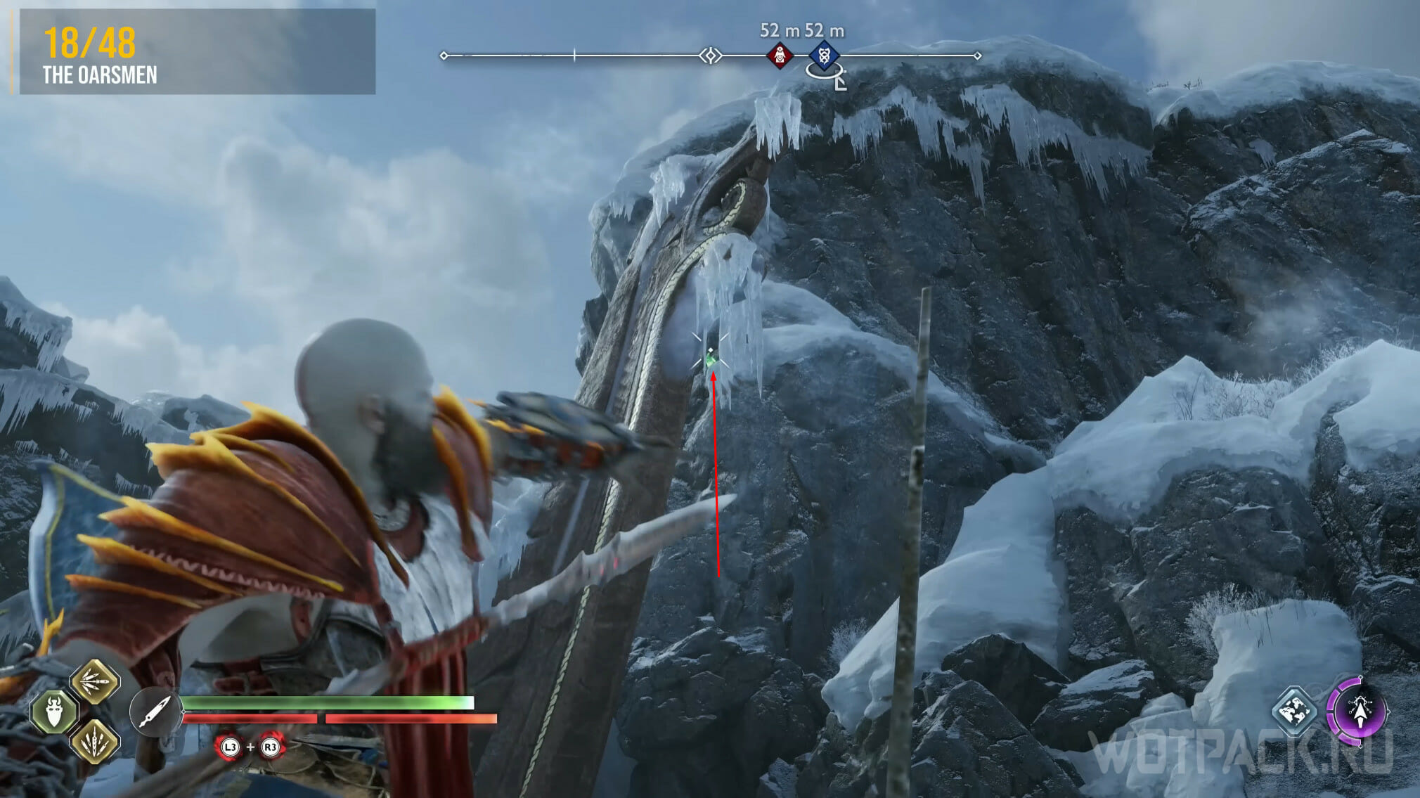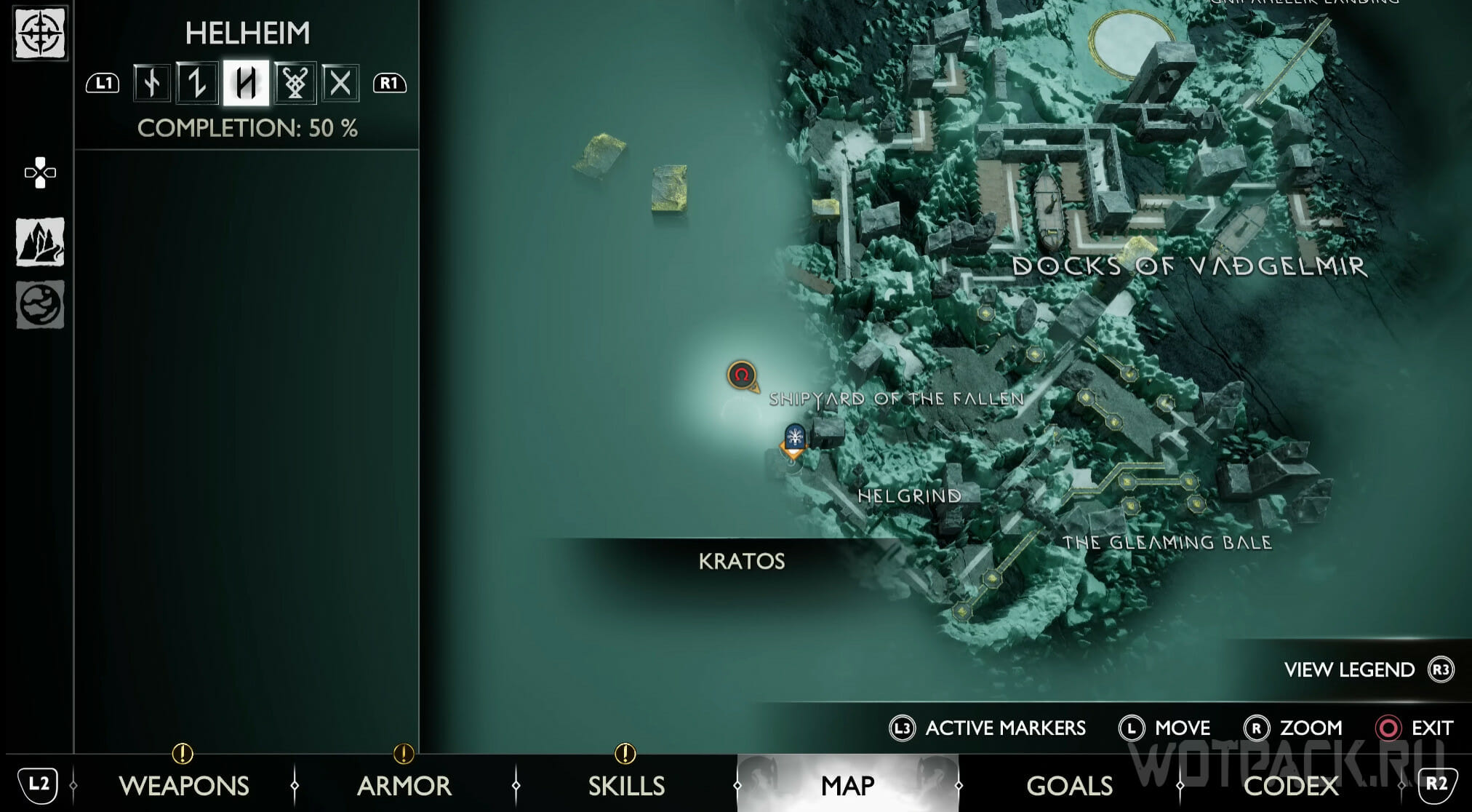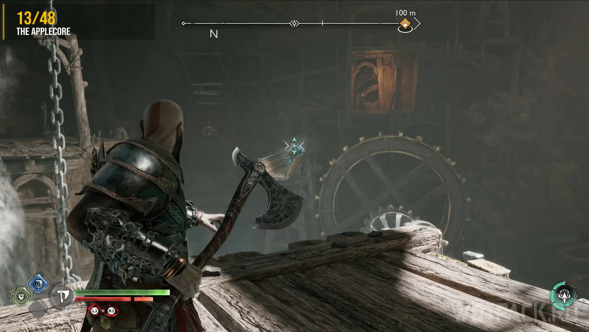Двигайтесь в сторону Верфи падших, пока не дойдете до последнего пазла. Фиолетовыми стрелами создайте области поражений, пока Кратос держит шестерню. После этого метните топор в маленькие шестеренки и заморозьте механизм.