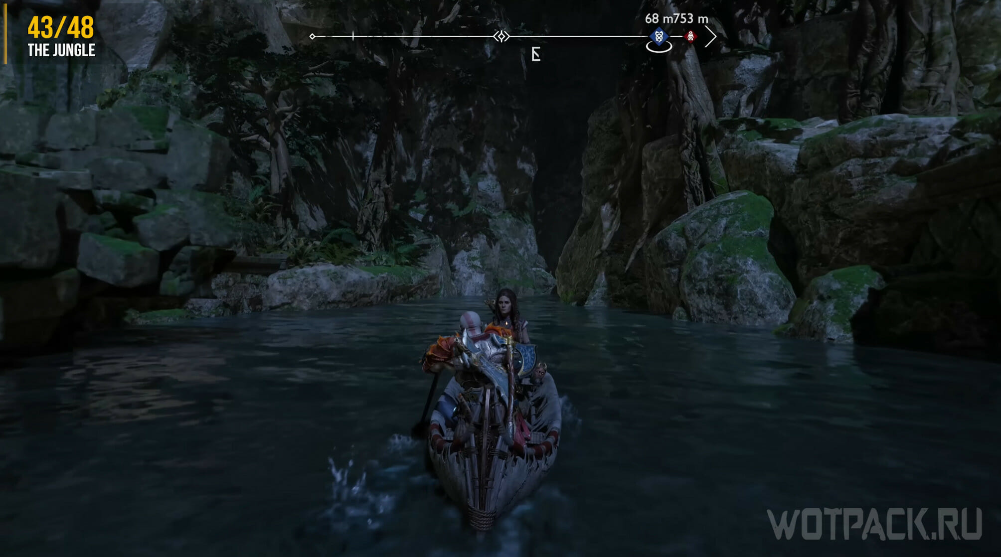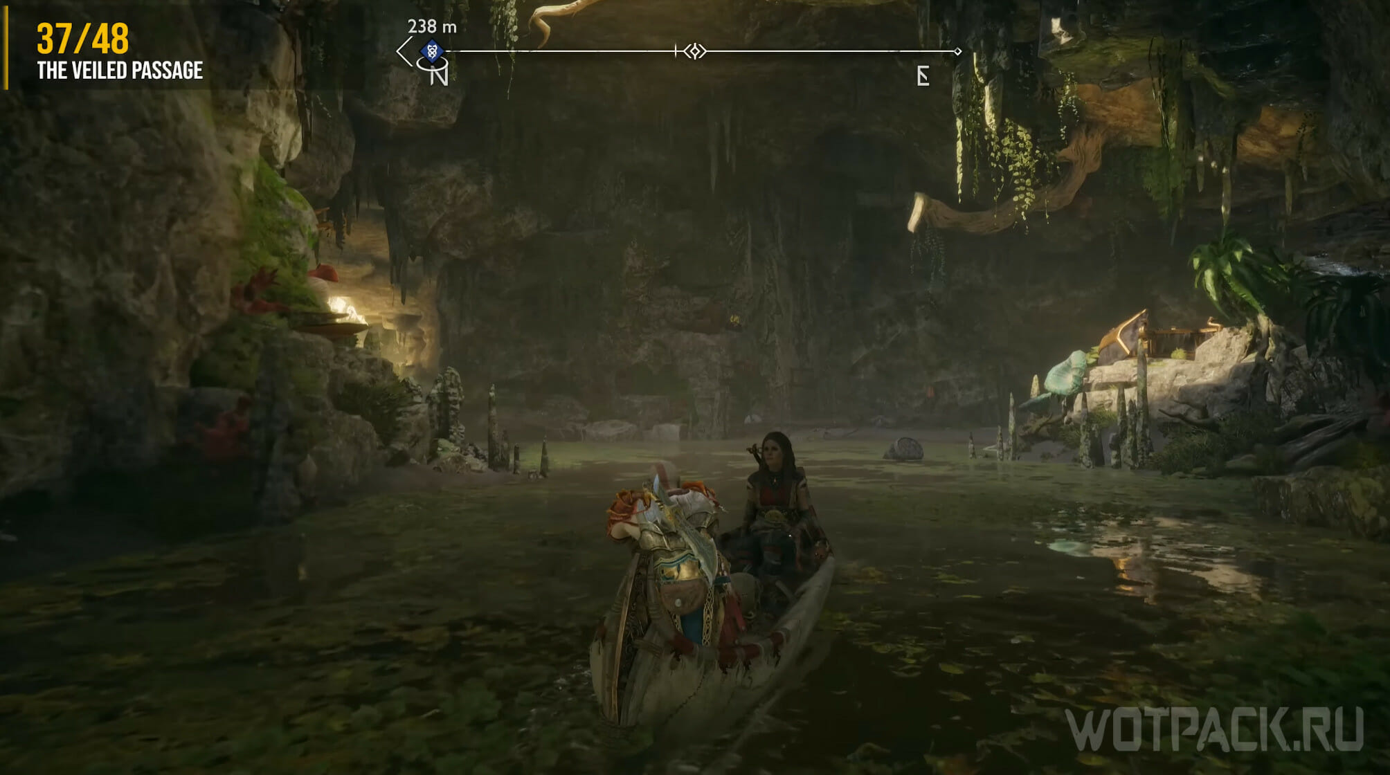Плывите по реке в пещеру до тех пор, пока не окажетесь у причала. При высадке Фрейя скажет о двух ограх, с которыми придется сразиться. Пролезьте через щель и посмотрите налево: над сундуком с ресурсами сидит ворон.