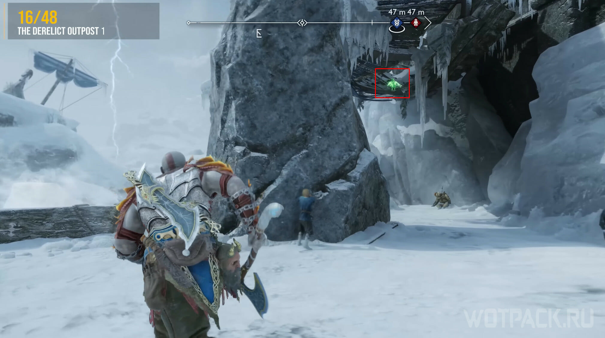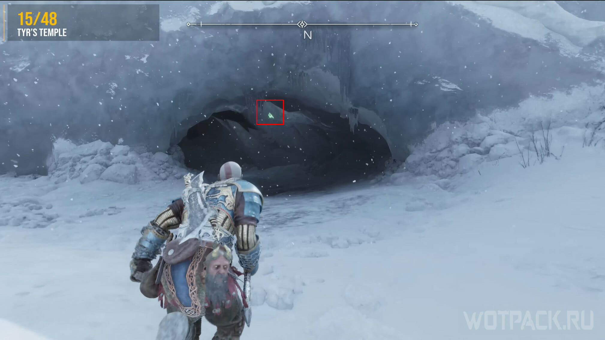 У сундука Норн заберитесь наверх по цепи, затем снова залезьте выше. Дойдите до места с большой замерзшей цепью, посмотрите на одну из статуй и за ней найдете ворона.