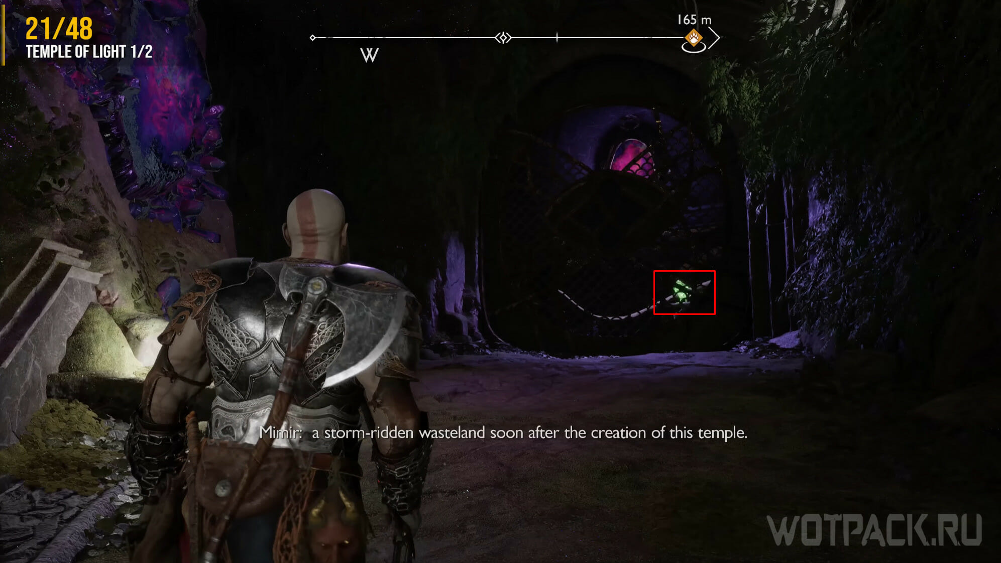 От Стренда двигайтесь в Храм Света, расположенный в конце пути. Когда преодолеете пропасть, Кратос пойдет по лестнице наверх. Ориентировочно на середине пути слева найдете спуск. Пройдите туда и сверните направо, к светящимся кристаллам.