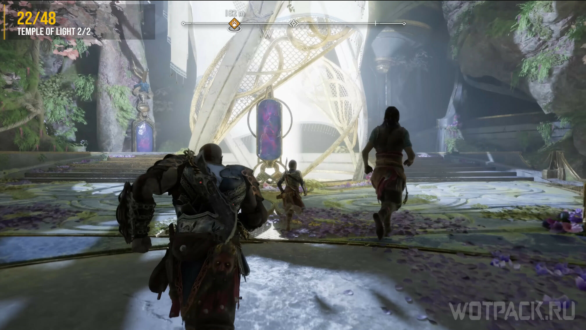 Чтобы поразить второго ворона в Храме света, идите дальше по сюжетному пути, пока не дойдете до зала, в котором Кратос и его товарищи сталкивают статуи для создания светового моста.