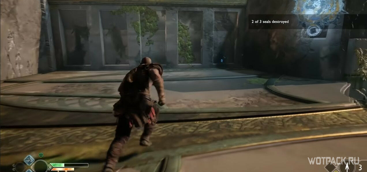 - Третья руна расположена слева, наверху утеса, по которому нужно карабкаться до второй печати. На ней должен показываться символ «Р».