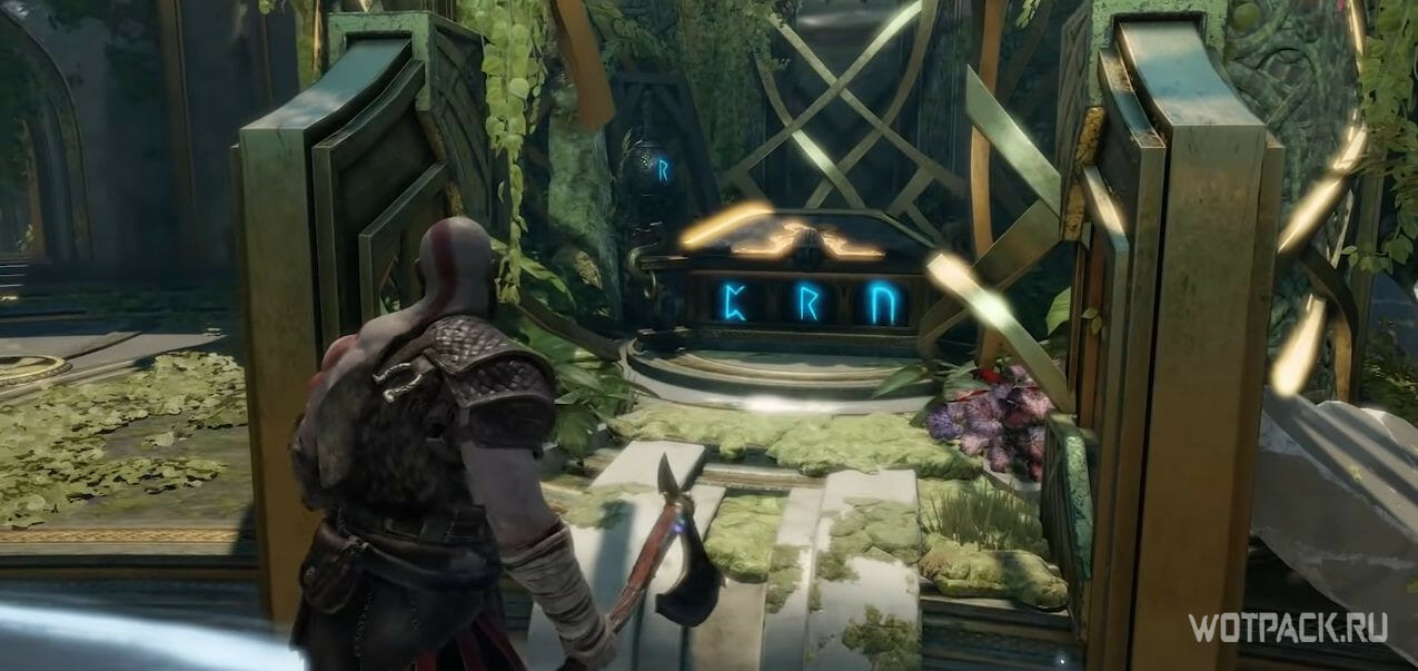 В первую очередь потребуется перенести Ветер Хель в другую половину чаши (на это дается около десяти секунд) и вернуться обратно к сундуку Норн. На середине пути от сундука до чаши стоит столб с рунами. Нужно бросить топор таким образом, чтобы табличка с руной B смотрела направо, и вверх. Для этого нужно взаимодействовать с первым и вторым переключателем.