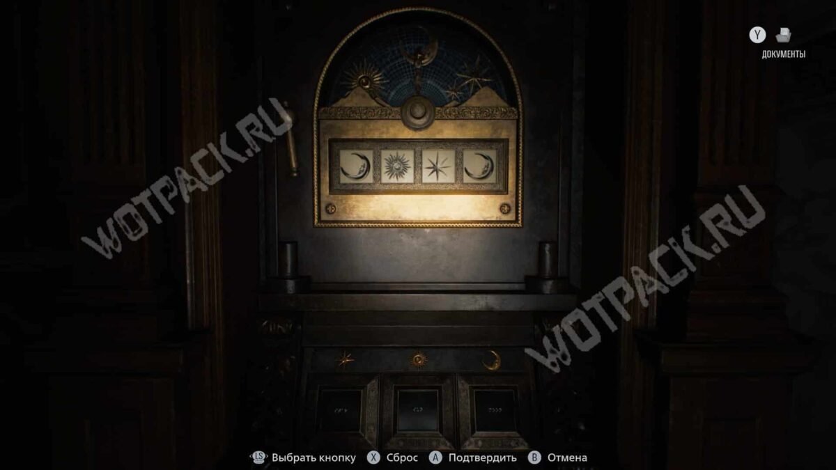 Загадка в кабинете председателя представлена в виде большого антикварного шкафа в Resident Evil Requiem с графическим паролем из символов Солнца, Луны и Звезды. Добравшись до второго этажа западного крыла медцентра Гидеона, попадёте в роскошные апартаменты администрации комплекса и узнаете, что необычные кварцевые ключи от двери в холл они хранят в тайниках с хитроумным кодовым замком.