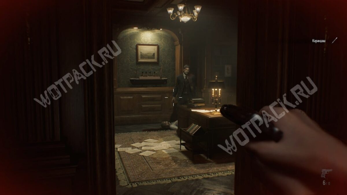 Зайдите в освещённую дальнюю комнату с массивным письменным столом. Из-за него встанет зомби — нейтрализуйте его, чтобы не мешал. Заберите карандаш со стола и возвращайтесь к порванной тетради.