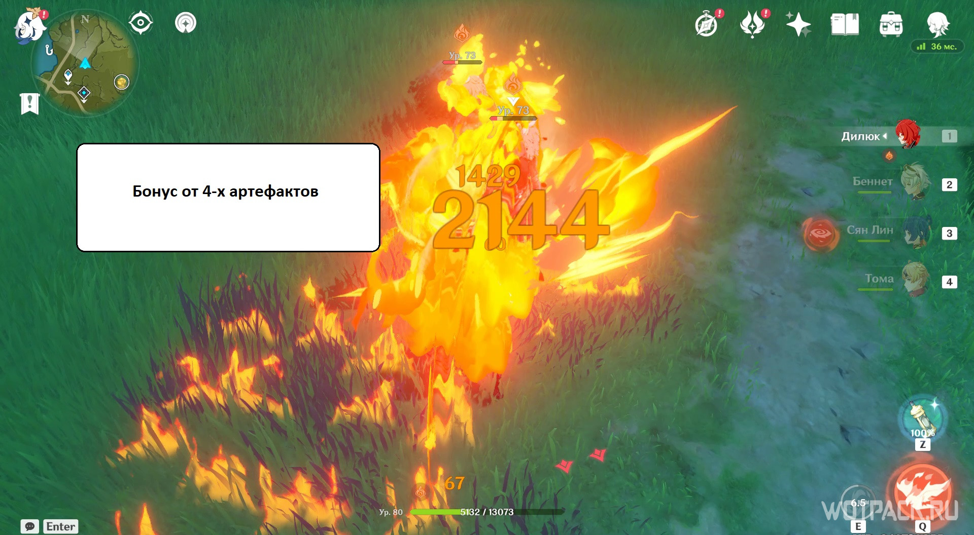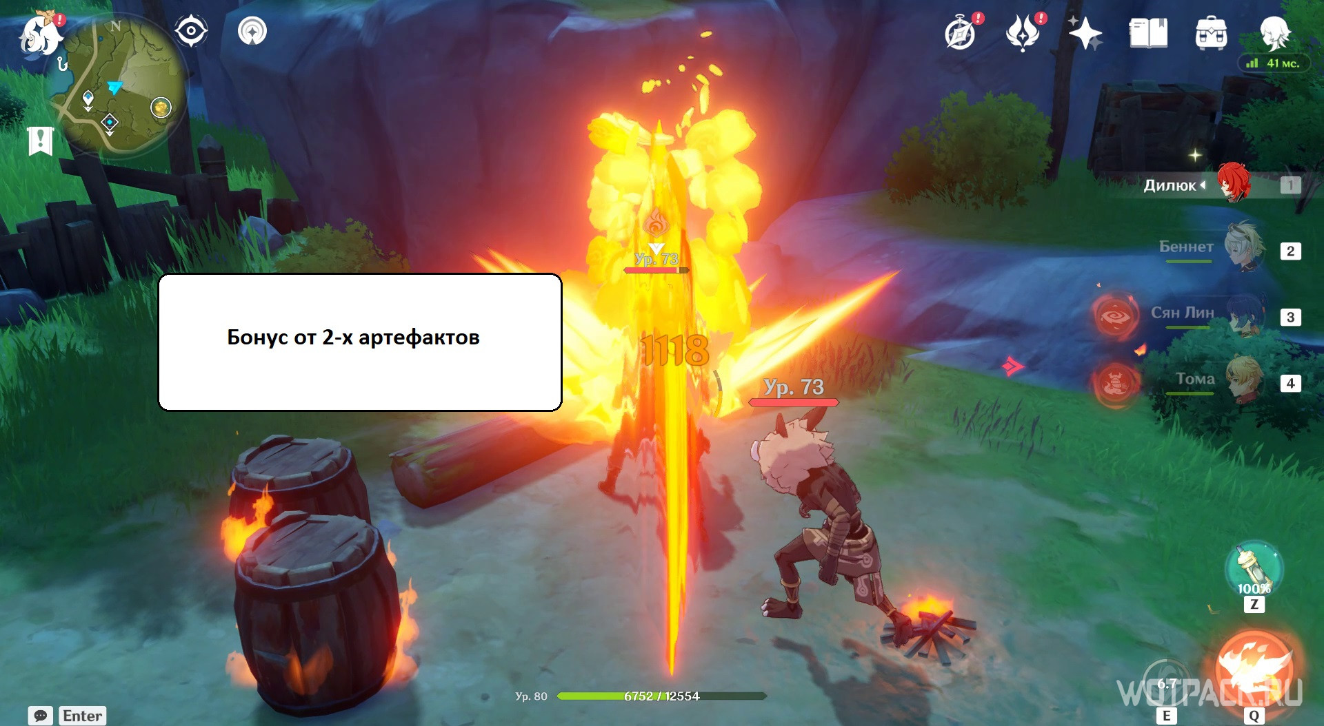 Наглядно: на скриншотах показан 3-й удар навыка Огненный натиск Дилюка без артефактов, с бонусом х2 и х4.