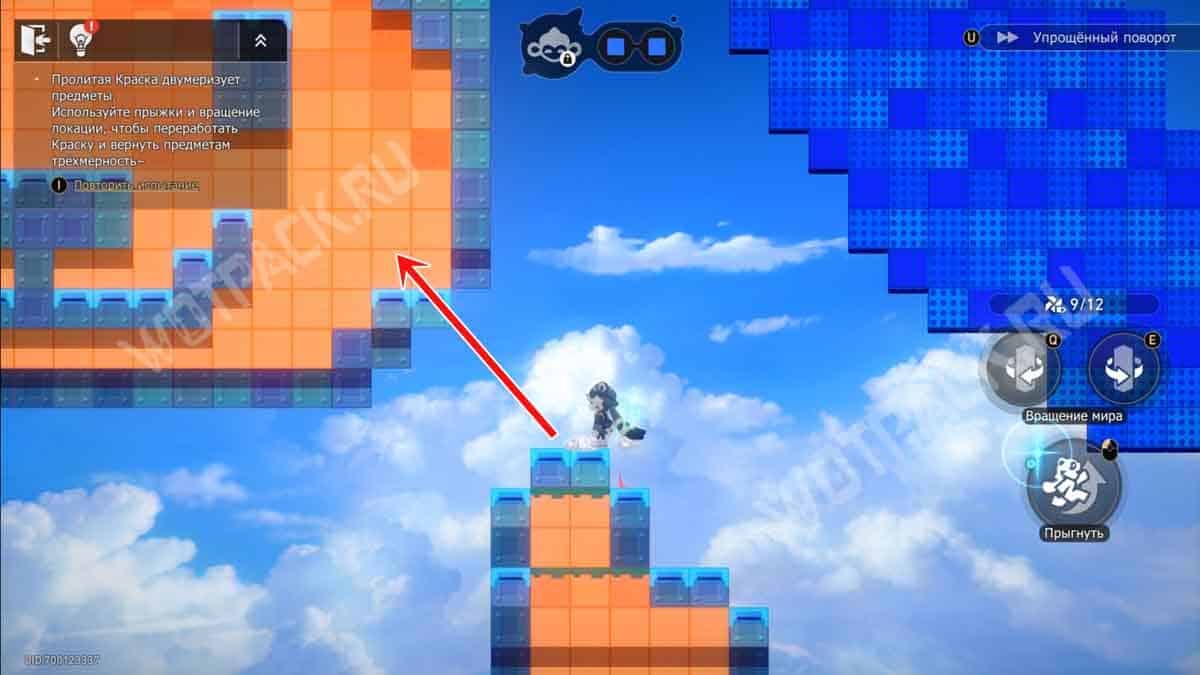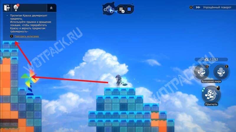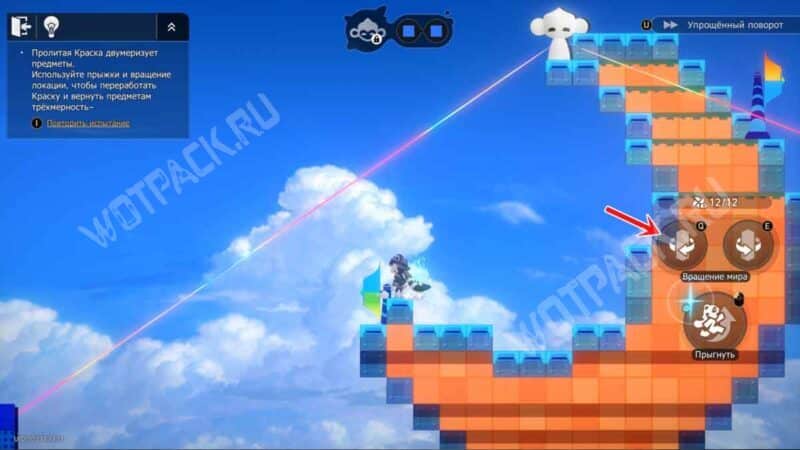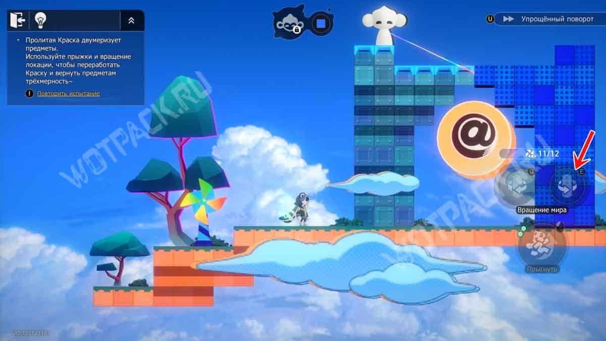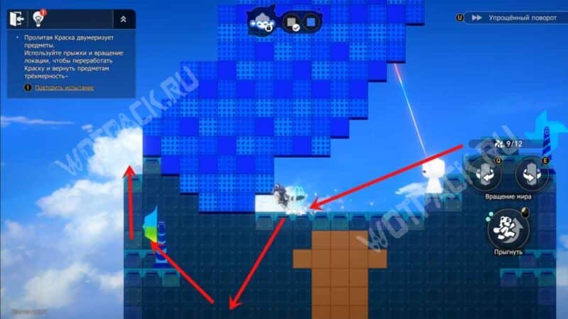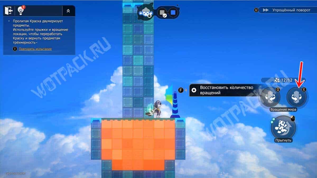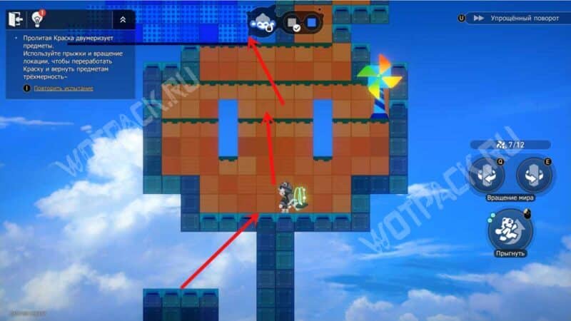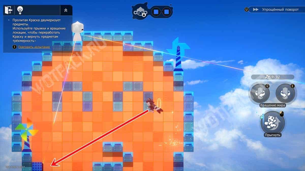 Один раз поверните башню на «E», после чего взберитесь по платформам на синий прямоугольник с нитью. Восстановите краски на «F».